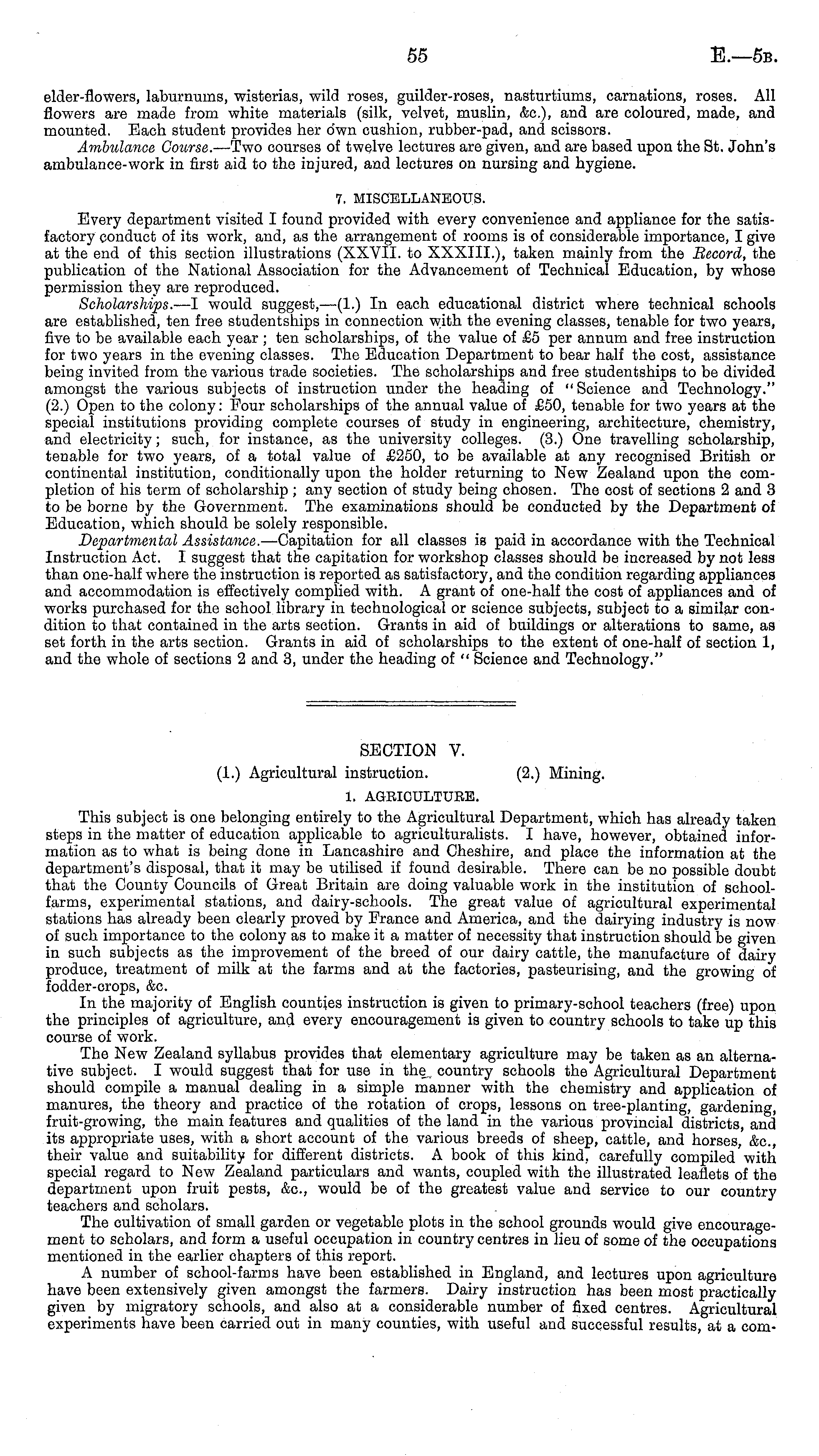 SECTION V. (1.) Agricultural instruction. (2.) Mining. 1. AGRICULTURE. This subject is one belonging entirely to the Agricultural Department, which has already taken steps in the matter of education applicable to agriculturalists. I have, however, obtained information as to what is being done in Lancashire and Cheshire, and place the information at the department's disposal, that it may be utilised if found desirable. There can be no possible doubt that the County Councils of Great Britain are doing valuable work in the institution of schoolfarms, experimental stations, and dairy-schools. The great value of agricultural experimental stations has already been clearly proved by France and America, and the dairying industry is now of such importance to the colony as to make it a matter of necessity that instruction should be given in such subjects as the improvement of the breed of our dairy cattle, the manufacture of dairy produce, treatment of milk at the farms and at the factories, pasteurising, and the growing of fodder-crops, &c. In the majority of English counties instruction is given to primary-school teachers (free) upon the principles of agriculture, and every encouragement is given to country schools to take up this course of work. The New Zealand syllabus provides that elementary agriculture may be taken as an alternative subject. I would suggest that for use in the. country schools the Agricultural Department should compile a manual dealing in a simple manner with the chemistry and application of manures, the theory and practice of the rotation of crops, lessons on tree-planting, gardening, fruit-growing, the main features and qualities of the land in the various provincial districts, and its appropriate uses, with a short account of the various breeds of sheep, cattle, and horses, &c, their value and suitability for different districts. A book of this kind, carefully compiled with special regard to New Zealand particulars and wants, coupled with the illustrated leaflets of the department upon fruit pests, &c, would be of the greatest value and service to our country teachers and scholars. The cultivation of small garden or vegetable plots in the school grounds would give encouragement to scholars, and form a useful occupation in country centres in lieu of some of the occupations mentioned in the earlier chapters of this report. A number of school-farms have been established in England, and lectures upon agriculture have been extensively given amongst the farmers. Dairy instruction has been most practically given by migratory schools, and also at a considerable number of fixed centres. Agricultural experiments have been carried out in many counties, with useful and successful results, at a com-