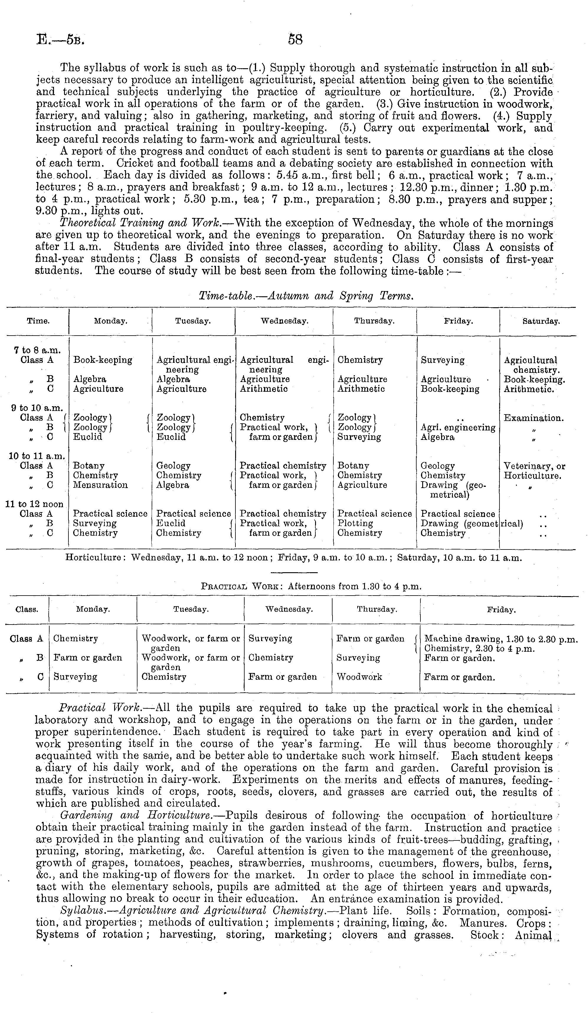 Time. Monday. Tuesday. Wednesday. Thursday. Friday. Saturday. 7 to 8 a.m. Class A . B „ C Book-keeping Algebra Agriculture Agricultural engineering Algebra Agriculture Agricultural engineering Agriculture Arithmetic Chemistry Agriculture Arithmetic Surveying Agriculture Book-keeping Agricultural chemistry. Book-keeping. Arithmetic. 9 to 10 a.m. Class A f . B 1 . C Zoology 1 f Zoology} I Euclid Zoology) Zoology) Euclid 1 Chemistry j Practical work, } ( farm or garden} Zoology I Zoology} Surveying Agri. engineering Algebra Examination. 10 to 11 a.m. Class A . B C Botany Chemistry Mensuration Geology Chemistry Algebra Practical chemistry Practical work, ) farm or garden j Botany Chemistry Agriculture Geology Chemistry Drawing (geometrical) Veterinary, or Horticulture. 11 to 12 noon Class A „ B . C Practical science Surveying Chemistry Practical science Euclid f Chemistry { Practical chemistry Practical work, ) farm or garden} Practical science Plotting Chemistry Practical science Drawing (geomet Chemistry rical) Horticulture: Wed; .esday, 11 a.m. to 12 noon; Friday, 9 a.i . to 10 a.m.; Saturday, 10 a.m. to 11 a.m. Practical Wobk: Afternoon; from 1.30 to 4 p.m. Class. Monday. Tuesday. Wednesday. Thursday. Friday. Class A Chemistry „ B Farm or garden „ C Surveying Woodwork, or farm or Surveying garden Woodwork, or farm or Chemistry garden Chemistry Farm or garden Farm or garden ( Machine drawing, 1.30 to 2.30 p.: j Chemistry, 2.30 to i p.m. Surveying Farm or garden. Woodwork Farm or garden.