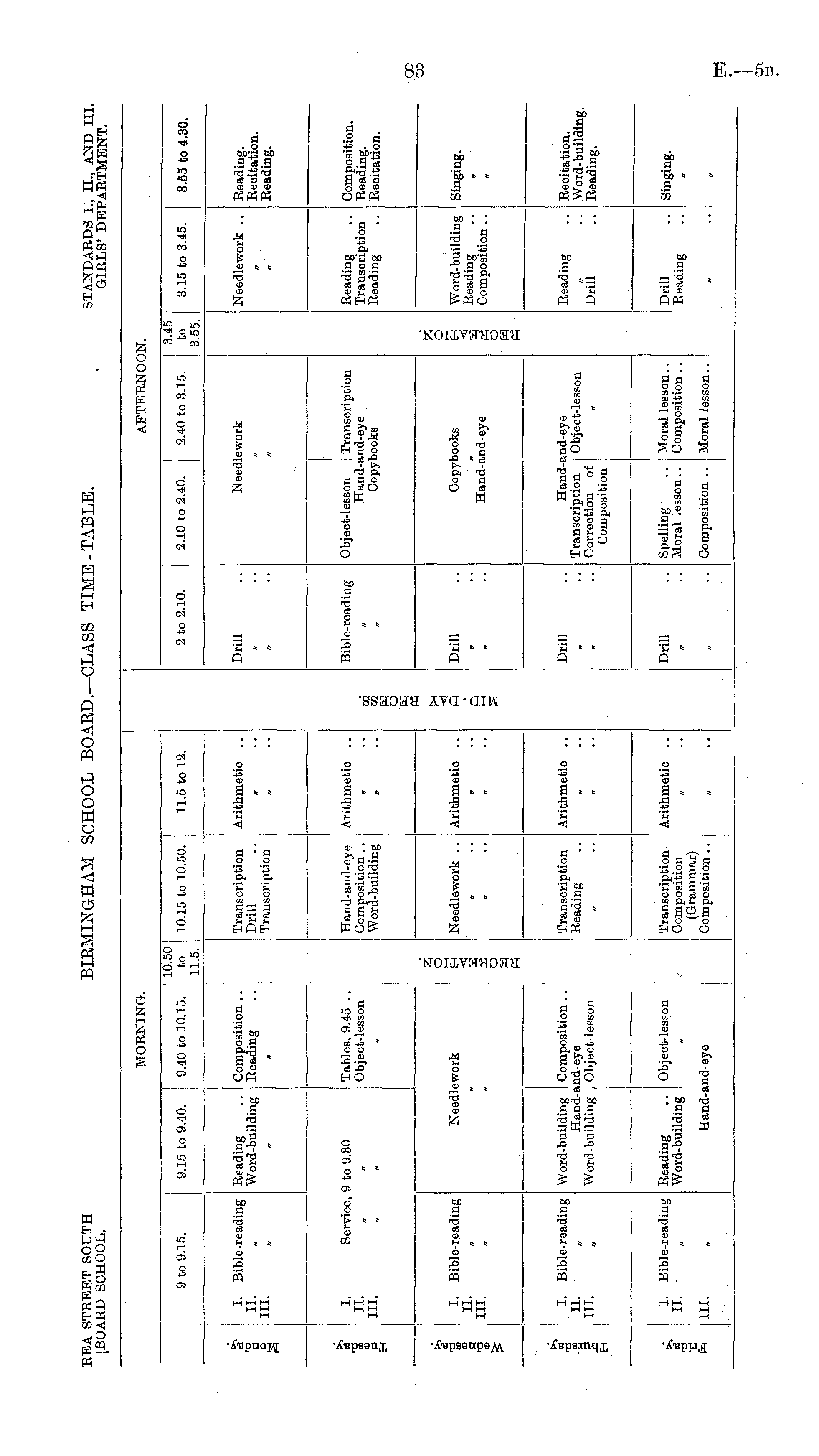EEA STREET SOUTH |B0ARD SCHOOL. STANDARDS I., II., AND III. GIRLS' DEPARTMENT. MORNING. AFTERNOON. 9 to 9.15. 9.15 to 9.40. 10.50 9.40 to 10.15. to 11.5. 10.15 to 10.50. 11.5 to 12. 2 to 2.10. 2.10 to 2.40. 2.40 to 3.15. 3.45 to 3.15 to 3.45. 3.55. 3.55 to 4.30. J I. II. III. Bible-reading Reading .. Composition .. Word-building Reading Reading Word-building Transcription Drill Transcription Arithmetic .. Drill Needlework Needlework .. Reading. Reoitation. Reading. CD EH I. Service, II. III. 9 to 9.30 Tables, 9.45 .. „ Object-lesson i Hand-and-eye Composition .. Word-building Arithmetic! .. Bible-reading Object-lesson Transcription Hand-and-eye Copybooks Reading Transcription Reading Composition. Reading. Reoitation. CO o . CD a I. Bible-reading II. HI. Needlework c 05 Needlework .. Arithmetic .. Q ft Drill Copybooks Hand-and-eye O EH B3 o P5 Word-building Reading Composition .. Singing. . " Eh I. Bible-reading II. III. Word-building Composition .. Hand-and-eye Word-building Object-lesson Transcription Reading Arithmetic .. Drill Hand-i Transcription Correction of Composition <nd-eye Object-lesson Reading Reoitation. Word-building. Reading. Drill '.'. I ft I. Bible-reading II. Reading .. Object-lesson Word-building Transcription Composition (Grammar) Composition .. Arithmetic .. » •. Drill Spelling Moral lesson.. Moral lesson.. Composition .. Drill Reading Singing. III. Hand-and-eye it .. Composition .. Moral lesson.. IF . .