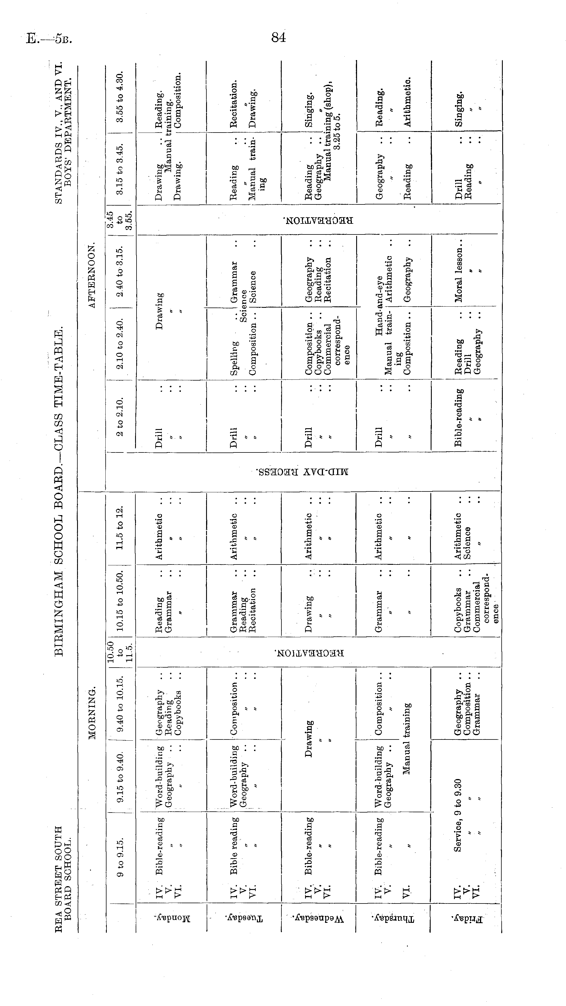 ,EA STREET SOUTH BOARD SCHOOL. STANDARDS IV., V., AND VI. BOYS' DEPARTMENT. MORNING. AFTERNOON. 9 to 9.15. 9.15 to 9.40. 10.50 j 9.40 bo 10.15. to 11.5. 10.15 to 10.50. 11.5 to 12. 2 to 2.10. 2.10 to 2.40. 2.40 to 3.15. 3.45 to 3.55. 3.15 to 3.45. 3.55 to 4.30. § IV. Bible-reading V. VI. "„ Word-building Geography Geography .. Heading Copybooks Reading Grammar Arithmetic .. Drill Draw ing Drawing Manual ti Drawing. Reading. ■aining. Composition. » • • EH IV. Bible reading V. VI. Word-building Geography Composition .. Grammar Reading Recitation Arithmetic .. Drill Spelling Sci( Grammar Science Reading Manual training Recitation. Drawing. . . Composition .. CO IV. Bible-reading V. VI. Drawing O En Drawing Arithmetic .. " - < !— I 9 Drill Composition .. Copybooks Commercial correspondGeography Reading Recitation H o Reading Geography .. Manual trai; 3.25i Singing. ling (shop), a 5. I Word-building Composition.. Geography Manual training ence ■a &H IV. Bible-reading V. Grammar Arithmetic .. Drill Hand-i Manual training Composition .. ind-eye Arithmetic .. Geography .. Reading. VI. Geography Reading Arithmetic IV. V. VI. Service, to 9.30 Geography .. Composition .. Grammar Copybooks Grammar Commercial correspondArithmetic Science Moral lesson.. Singing. Bible-reading Beading Drill Geography .. Drill Reading „ ence