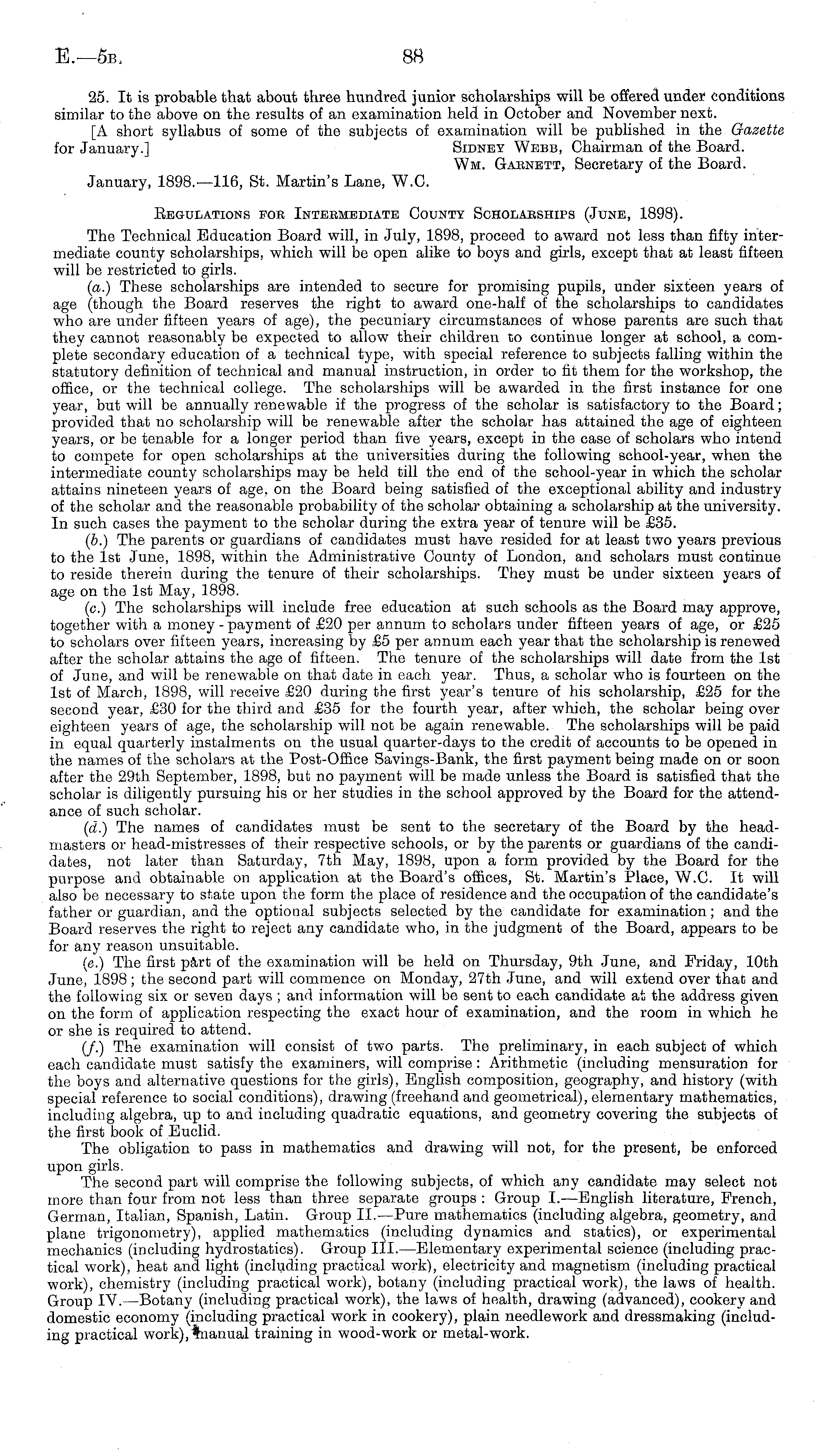 25. It is probable that about three hundred junior scholarships will be offered under conditions similar to the above on the. results of an examination held in October and November next. [A short syllabus of some of the subjects of examination will be published in the Gazette for January.] Sidney Webb, Chairman of the Board. Wm. Garnett, Secretary of the Board. January, 1898.—116, St. Martin's Lane, W.C. Regulations for Intermediate County Scholarships (June, 1898). The Technical Education Board will, in July, 1898, proceed to award not less than fifty intermediate county scholarships, which will be open alike to boys and girls, except that at least fifteen will be restricted to girls. (a.) These scholarships are intended to secure for promising pupils, under sixteen years of age (though the Board reserves the right to award one-half of the scholarships to candidates who are under fifteen years of age), the pecuniary circumstances of whose parents are such that they cannot reasonably be expected to allow their children to continue longer at school, a complete secondary education of a technical type, with special reference to subjects falling within the statutory definition of technical and manual instruction, in order to fit them for the workshop, the office, or the technical college. The scholarships will be awarded in the first instance for one year, but will be annually renewable if the progress of the scholar is satisfactory to the Board; provided that no scholarship will be renewable after the scholar has attained the age of eighteen years, or be tenable for a longer period than five years, except in the ease of scholars who intend to compete for open scholarships at the universities during the following school-year, when the intermediate county scholarships may be held till the end of the school-year in which the scholar attains nineteen years of age, on the Board being satisfied of the exceptional ability and industry of the scholar and the reasonable probability of the scholar obtaining a scholarship at the university. In such cases the payment to the scholar during the extra year of tenure will be £35. (b.) The parents or guardians of candidates must have resided for at least two years previous to the Ist June, 1898, within the Administrative County of London, and scholars must continue to reside therein during the tenure of their scholarships. They must be under sixteen years of age on the Ist May, 1898. (c.) The scholarships will include free education at such schools as the Board may approve, together with a money - payment of £20 per annum to scholars under fifteen years of age, or £25 to scholars over fifteen years, increasing by £5 per annum each year that the scholarship is renewed after the scholar attains the age of fifteen. The tenure of the scholarships will date from the Ist of June, and will be renewable on that date in each year. Thus, a scholar who is fourteen on the Ist of March, 1898, will receive £20 during the first year's tenure of his scholarship, £25 for the second year, £30 for the third and £35 for the fourth year, after which, the scholar being over eighteen years of age, the scholarship will not be again renewable. The scholarships will be paid in equal quarterly instalments on the usual quarter-days to the credit of accounts to be opened, in the names of the scholars at the Post-Office Savings-Bank, the first payment being made on or soon after the 29th September, 1898, but no payment will be made unless the Board is satisfied that the scholar is diligently pursuing his or her studies in the school approved by the Board for the attendance of such scholar. (d.) The names of candidates must be sent to the secretary of the Board by the headmasters or head-mistresses of their respective schools, or by the parents or guardians of the candidates, not later than Saturday, 7th May, 1898, upon a form provided by the Board for the purpose and obtainable on application at the Board's offices, St. Martin's Place, W.C. It will also be necessary to state upon the form the place of residence and the occupation of the candidate's father or guardian, and the optional subjects selected by the candidate for examination; and the Board reserves the right to reject any candidate who, in the judgment of the Board, appears to be for any reason unsuitable. (c.) The first part of the examination will be held on Thursday, 9th June, and Friday, 10th June, 1898 ; the second part will commence on Monday, 27th June, and will extend over that and the following six or seven days ; and information will be sent to each candidate at the address given on the form of application respecting the exact hour of examination, and the room in which he or she is required to attend. (/.) The examination will consist of two parts. The preliminary, in each subject of which each candidate must satisfy the examiners, will comprise : Arithmetic (including mensuration for the boys and alternative questions for the girls), English composition, geography, and history (with special reference to social conditions), drawing (freehand and geometrical), elementary mathematics, including algebra, up to and including quadratic equations, and geometry covering the subjects of the first book of Euclid. The obligation to pass in mathematics and drawing will not, for the present, be enforced upon girls. The second part will comprise the following subjects, of which any candidate may select not more than four from not less than three separate groups : Group I.—English literature, French, German, Italian, Spanish, Latin. Group ll.—Pure mathematics (including algebra, geometry, and plane trigonometry), applied mathematics (including dynamics and statics), or experimental mechanics (including hydrostatics). Group 111. —Elementary experimental science (including practical work), heat and light (including practical work), electricity and magnetism (including practical work), chemistry (including practical w