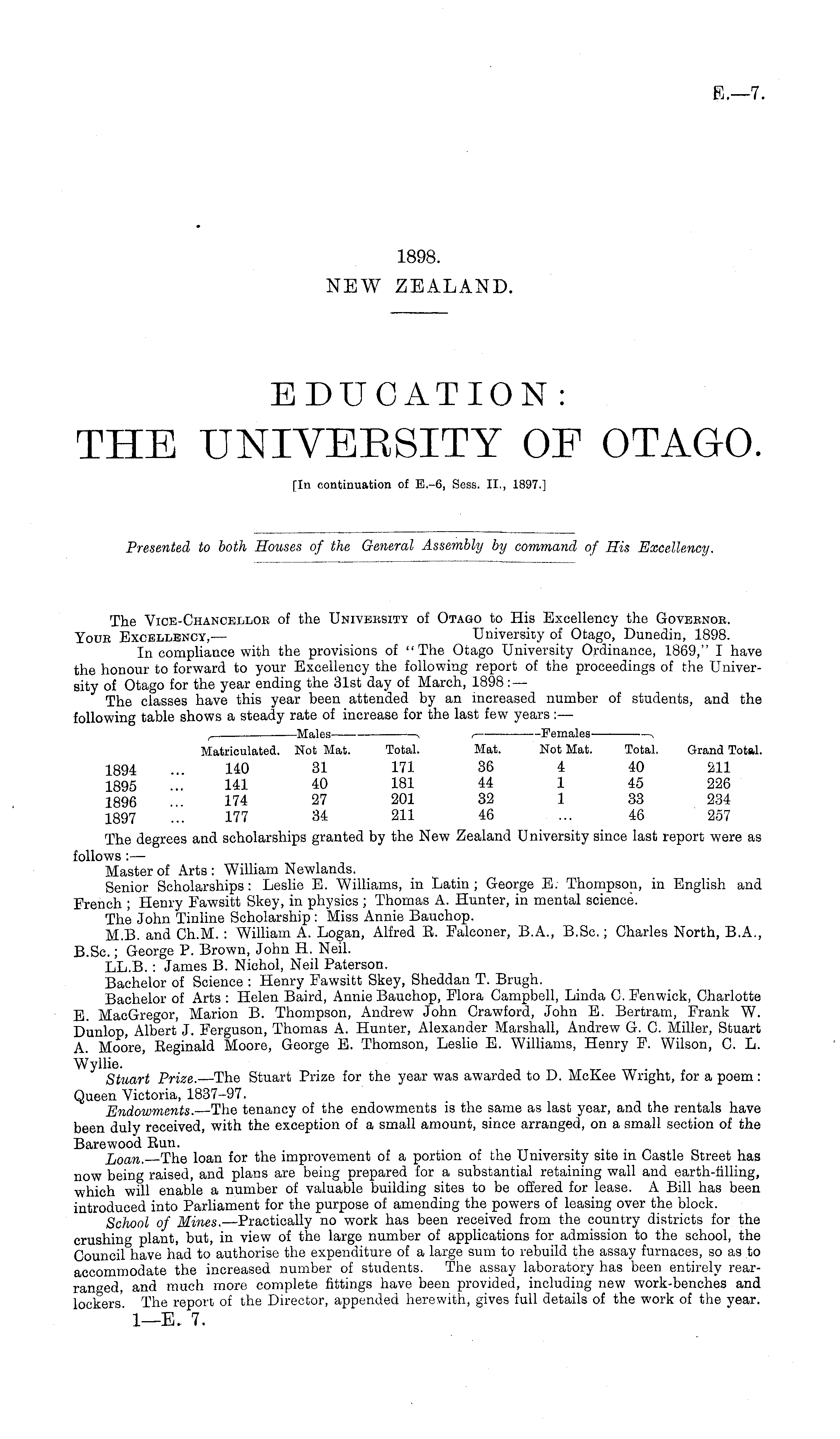 The Vice-Chancellor of the University of Otago to His Excellency the Governor. Your Excellency,— University of Otago, Dunedin, 1898. Incompliance with the provisions of "The Otago University Ordinance, 1869," I have the honour to forward to your Excellency the following report of the proceedings of the University of Otago for the year ending the 31st day of March, 1898 : — The classes have this year been attended by an increased number of students, and the following table shows a steady rate of increase for the last few years:— , Males , , Females , Matriculated. Not Mat. Total. Mat. Not Mat. Total. Grand Total. 1894 ... 140 31 171 36 4 40 211 1895 .. 141 40 181 44 1 45 226 1896 174 27 201 32 1 33 234 1897 ... 177 34 211 46 ... 46 257 The degrees and scholarships granted by the New Zealand University since last report were as follows :— Master of Arts : William Newlands. Senior Scholarships: Leslie E. Williams, in Latin; George E. Thompson, in English and French ; Henry Fawsitt Skey, in physics ; Thomas A. Hunter, in mental science. The John Tinline Scholarship : Miss Annie Bauchop. M.B. and Ch.M.: William A. Logan, Alfred E. Falconer, 8.A., B.Sc.; Charles North, 8.A., B.Sc.; George P. Brown, John H. Neil. LL.B. : James B. Nichol, Neil Paterson. Bachelor of Science : Henry Fawsitt Skey, Sheddan T. Brugh. Bachelor of Arts : Helen Baird, Annie Bauchop, Flora Campbell, Linda C. Fenwick, Charlotte E. MacGregor, Marion B. Thompson, Andrew John Crawford, John E. Bertram, Frank W. Dunlop, Albert J. Ferguson, Thomas A. Hunter, Alexander Marshall, Andrew G. C. Miller, Stuart A. Moore, Eeginald Moore, George E. Thomson, Leslie E. Williams, Henry F. Wilson, C. L. Wyllie. Stuart Prize. —The Stuart Prize for the year was awarded to D. McKee Wright, for a poem: Queen Victoria, 1837-97. Endowments. —The tenancy of the endowments is the same as last year, and the rentals have been duly received, with the exception of a small amount, since arranged, on a small section of the Barewood Eun. Loan. The loan for the improvement of a portion of the University site in Castle Street has now being raised, and plans are being prepared for a substantial retaining wall and earth-filling, which will enable a number of valuable building sites to be offered for lease. A Bill has been introduced into Parliament for the purpose of amending the powers of leasing over the block. School of Mines. —Practically no work has been received from the country districts for the crushing plant, but, in view of the large number of applications for admission to the school, the Council have had to authorise the expenditure of a large sum to rebuild the assay furnaces, so as to accommodate the increased number of students. The assay laboratory has been entirely rearranged, and much more complete fittings have been provided, including new work-benches and lockers' The report of the Director, appended herewith, gives full details of the work of the year. ' I—E. 7.