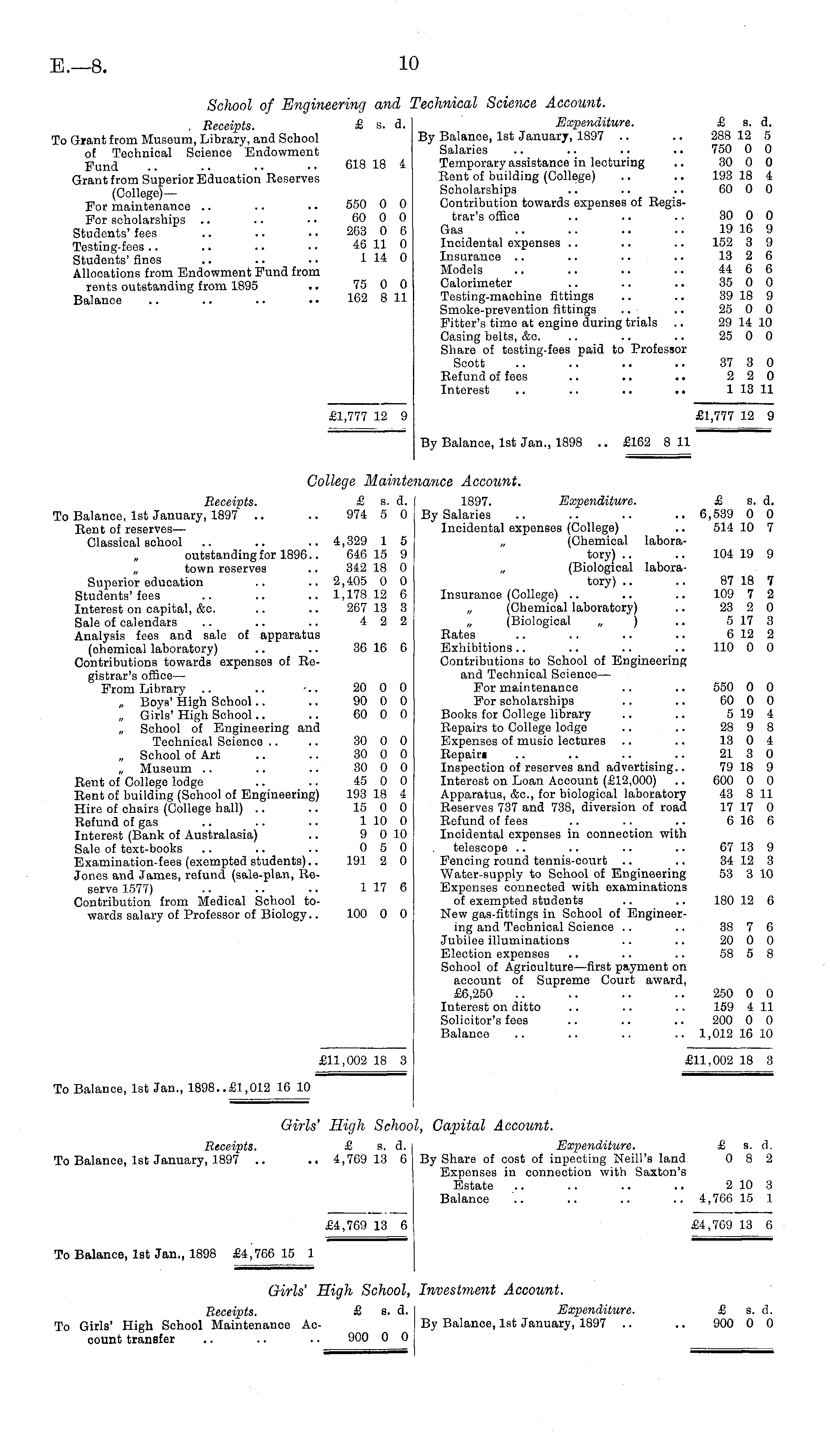 School of Engineering and Technical Science Account. Receipts. £ s. d. Expenditure. £ s. d. To Grant from Museum, Library, and School By Balance, Ist January, 1897 .. .. 288 12 5 of Technical Science Endowment Salaries .. .. .. .. 750 0 0 ;p un( j ~ ~ .. 618 18 4 Temporary assistance in lecturing .. 30 0 0 Grant from Superior Education Reserves Rent of building (College) .. .. 193 18 4 (College) Scholarships .. .. .. 60 0 0 For maintenance .. .. .. 550 0 0 Contribution towards expenses of RegisFor scholarships .. .. •. 60 0 0 trar's office .. .. .. 30 0 0 Students' fees 263 0 6 Gas .. .. .. .. 19 16 9 Testing-fees.. .. .. • ■ 46 11 0 Incidental expenses .. .. .. 152 3 9 Students' fines .. .. .. 114 0 Insurance .. .. .. .. 13 2 6 Allocations from Endowment Fund from Models .. .. .. .. 44 6 6 rents outstanding from 1895 .. 75 0 0 Calorimeter .. .. .. 35 0 0 Balance .. .. .. .. 162 811 Testing-machine fittings .. .. 39 18 9 Smoke-prevention fittings .. .. 25 0 0 Fitter's time at engine during trials .. 29 14 10 Casing belts, &o. .. .. .. 25 0 0 Share of testing-fees paid to Professor Scott .. .. .. .. 37 3 0 Refund of fees .. .. .. 2 2 0 Interest .. .. .. .. 1 13 11 £1,777 12 9 £1,777 12 9 By Balance, Ist Jan., 1898 .. £162 811 College Maintenance Account. Receipts. £ s. d. 1897. Expenditure. £ s. d. To Balance, Ist January, 1897 .. .. 974 5 0 By Salaries .. .. .. .. 6,539 0 0 Rent of reserves— Incidental expenses (College) .. 514 10 7 Classical school .. .. .. 4,329 15 „ (Chemical laboraoutstandingfor 1896.. 646 15 9 tory) .. .. 104 19 9 town reserves .. 342 18 0 „ (Biologioal laboraSuperior education .. .. 2,405 0 0 ' tory).. .. 87 18 7 Students'fees .. .. .. 1,178 12 6 Insurance (College) .. .. .. 109 7 2 Interest on capital, &c. .. .. 267 13 3 „ (Chemical laboratory) .. 23 2 0 Sale of calendars .. .. .. 4 2 2 „ (Biological „ ) .. 5 17 3 Analysis fees and sale of apparatus Rates .. .. .. .. 6 12 2 (ohemical laboratory) .. .. 36 16 6 Exhibitions.. .. .. _ .. 110 0 0 Contributions towards expenses of Re- Contributions to School of Engineering gistrar's office— and Technical Science — From Library .. .. ■.. 20 0 0 For maintenance .. .. 550 0 0 „ Boys' High School.. .. 90 0 0 For scholarships .. .. 60 0 0 „ Girls' High School.. .. 60 0 0 Books for College library .. .. 519 4 „ School of Engineering and Repairs to College lodge .. .. 28 9 8 Technical Science .. .. 30 0 0 Expenses of music lectures .. .. 13 0 4 „ School of Art .. .. 30 0 0 Repaira .. .. .. .. 21 3 0 „ Museum .. .. .. 30 0 0 Inspection of reserves and advertising.. 79 18 9 Rent of College lodge .. .. 45 0 0 Interest on Loan Account (£12,000) .. 600 0 0 Rent of building (School of Engineering) 193 18 4 Apparatus, &c, for biological laboratory 43 811 Hire of chairs (College hall) .. .. 15 0 0 Reserves 737 and 738, diversion of road 17 17 0 Refund of gas .. .. .. 1 10 0 Refund of fees .. .. .. 6 16 6 Interest (Bank of Australasia) .. 9 0 10 Incidental expenses in connection with Sale of text-books .. .. .. 0 5 0. telescope .. .. .. .. 67 13 9 Examination-fees (exempted students).. 191 2 0 Fencing round tennis-court .. .. 34 12 3 Jones and James, refund (sale-plan, Re- Water-supply to School of Engineering 53 3 10 serve 1577) .. .. .. 1 17 6 Expenses connected with examinations Contribution from Medical School to- of exempted students .. .. 180 12 6 wards salary of Professor of Biology.. 100 0 0 New gas-fittings in School of Engineering and Technical Science .. .. 38 7 6 Jubilee illuminations .. .. 20 0 0 Election expenses .. .. .. 58 5 8 School of Agriculture—first payment on account of Supreme Court award, £6,250 .. .. .. .. 250 0 0 Interest on ditto .. .. .. 159 411 Solicitor's fees .. .. .. 200 0 0 Balance .. .. .. .. 1,012 16 10 £11,002 18 3 £11,002 18 3 To Balance, Ist Jan., 1898..£1,012 16 10 Girls' High School, Capital Account. Receipts. £ s. d. Expenditure. £ s. d. To Balance, Ist January, 1897 .. .. 4,769 13 6 By Share of cost of inpecting Neill's land 0 8 2 Expenses in connection with Saxton's Estate .. .. .. .. 2 10 3 Balance '.. .. .. .. 4,766 15 1 £4,769 13 6 £4,769 13 6 To Balance, Ist Jan., 1898 £4,766 15 1 Girls' High School, Investment Account. Receipts. £ s. d. Expenditure. £ s. d. To Girls' High School Maintenance Ac- By Balance, Ist January, 1897 .. .. 900 0 0 count transfer .. .. .. 900 0 0