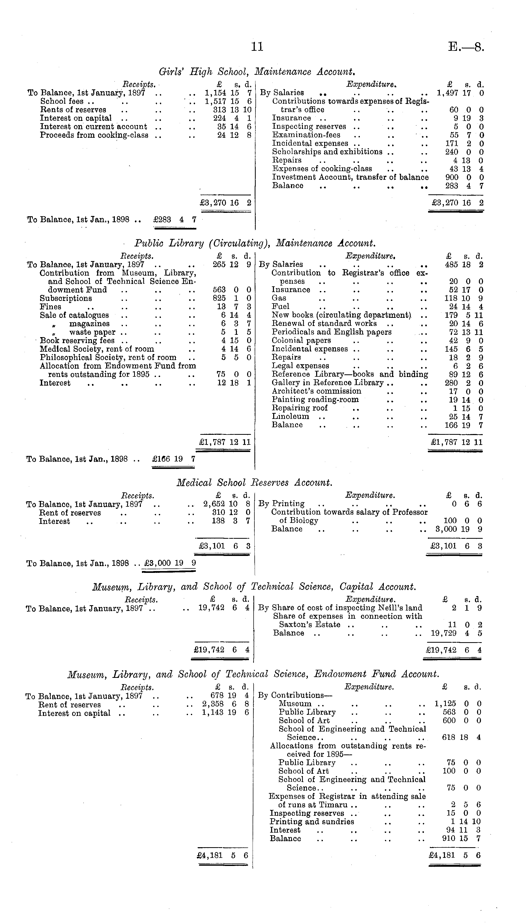 Girls' High School, Maintenance Account. Receipts. £ s. d. Expenditure. £ s. d. To Balance, Ist January, 1897 .. .. 1,154 15 7 By Salaries .. .. .. .. 1,497 17 0 School fees .. .. .. .. 1,517 15 6 Contributions towards expenses of RegisRents of reserves .. .. .. 313 13 10 trar's office .. .. .. 60 0 0 Interest on capital .. .. .. 224 4 1 Insurance .. .. .. .. 919 3 Interest on current account .. .. 35 14 6 Inspecting reserves .. .. .. 5 0 0 Proceeds from cooking-class .. .. 24 12 8 Examination-fees .. .. .. 55 7 0 Incidental expenses .. .. .. 171 2 0 Scholarships and exhibitions .. .. 240 0 0 Repairs .. .. .. .. 413 0 Expenses of cooking-class .. .. 43 13 4 Investment Account, transfer of balance 900 0 0 Balance .. .. .. .. 283 4 7 £3,270 16 2 £3,270 16 2 To Balance, Ist Jan., 1898 .. £283 4 7 ■ Public Library (Circulating), Maintenance Account. Receipts. £ s. d. Expenditure. £ s. d. To Balance, Ist January, 1897 .. .. 265 12 9 By Salaries .. .. .. .. 485 18 2 Contribution from Museum, Library, Contribution to Registrar's office exand School of Technical Science En- penses .. .. .. .. 20 0 0 dowment Fund .. .. .. 563 0 0 Insurance .. .. .. .. 52 17 0 Subscriptions .. .. .. 825 1 0 Gas .. .. .. .. 118 10 9 Fines .. .. .. .. 13 7 3 Fuel .. .. .. .. 24 14 4 Sale of catalogues .. .. .. 614 4 New books (circulating department) .. 179 5 11 „ magazines .. .. .. 6 3 7 Renewal of standard works .. .. 20 14 6 „ waste paper .. .. .. 5 15 Periodicals and English papers .. 72 13 11 Book reserving fees .. .. .. 4 15 0 Colonial papers .. .. .. 42 9 0 Medical Society, rent of room .. 4 14 6 Incidental expenses .. .. .. 145 6 5 Philosophical Society, rent of room .. 5 5 0 Repairs .. .. .. .. 18 2 9 Allocation from Endowment Fund from Legal expenses .. .. .. 6 2 6 rents outstanding for 1895 .. .. 75 0 0 Reference Library—books and binding 89 12 6 Interest .. .. .. .. 12 18 1 Gallery in Reference Library .. .. 280 2 0 Architect's commission .. .. 17 0 0 Painting reading-room .. .. 19 14 0 Repairing roof .. .. .. 115 0 Linoleum .. .. .. .. 25 14 7 Balance .. .. .. .. 166 19 7 £1,787 12 11 £1,787 12 11 To Balanoe, Ist Jan., 1898 .. £166 19 7 Medical School Preserves Account. Receipts. £ s. d. Expenditure. £ s. d. To Balance, Ist January, 1897 .. .. 2,652 10 8 By Printing .. .. .. .. 0 6 6 Rent of reserves .. .. .. 310 12 0 Contribution towards salary of Professor Interest .. .. .. .. 138 3 7 of Biology .. .. .. 100 0 0 Balance .. .. .. .. 3,000 19 9 £3,101 6 3 £3,101 6 3 To Balance, Ist Jan., 1898 .. £3,000 19 9 Museum, Library, and School of Technical Science, Capital Account. Receipts. £ s. d. Expenditure. £ s. d. To Balance, Ist January, 1897 .. .. 19,742 6 4 By Share of cost of inspecting Neill's land 2 19 Share of expenses in connection with Saxton's Estate .. .. .. 110 2 Balance .. .. .. .. 19,729 4 5 £19,742 6 4 £19,742 6 4 Museum, Library, and School of Technical Science, Endowment Fund Account. Receipts. £ s. d. Expenditure. £ s. d. To Balance, Ist January, 1897 .. .. 678 19 4 By ContributionsRent of reserves .. .. .. 2,358 6 8 Museum .. .. .. .. 1,125 0 0 Interest on capital .. .. .. 1,143 19 6 Public Library .. .. .. 563 0 0 School of Art .. .. .. 600 0 0 School of Engineering and Technical Science.. .. .. .. 618 18 4 Allocations from outstanding rents received for 1895 — Public Library .. .. .. 75 0 0 School of Art .. .. .. 100 0 0 School of Engineering and Technical Science.. .. .. .. 75 0 0 Expenses of Registrar in attending sale of runs at Timaru .. .. .. 2 5 6 Inspecting reserves .. .. .. 15 0 0 Printing and sundries .. .. 1 14 10 Interest .. .. .. .. 94 11 3 Balance .. .. .. .. 910 15 7 £4,181 5 6 £4,181 5 6