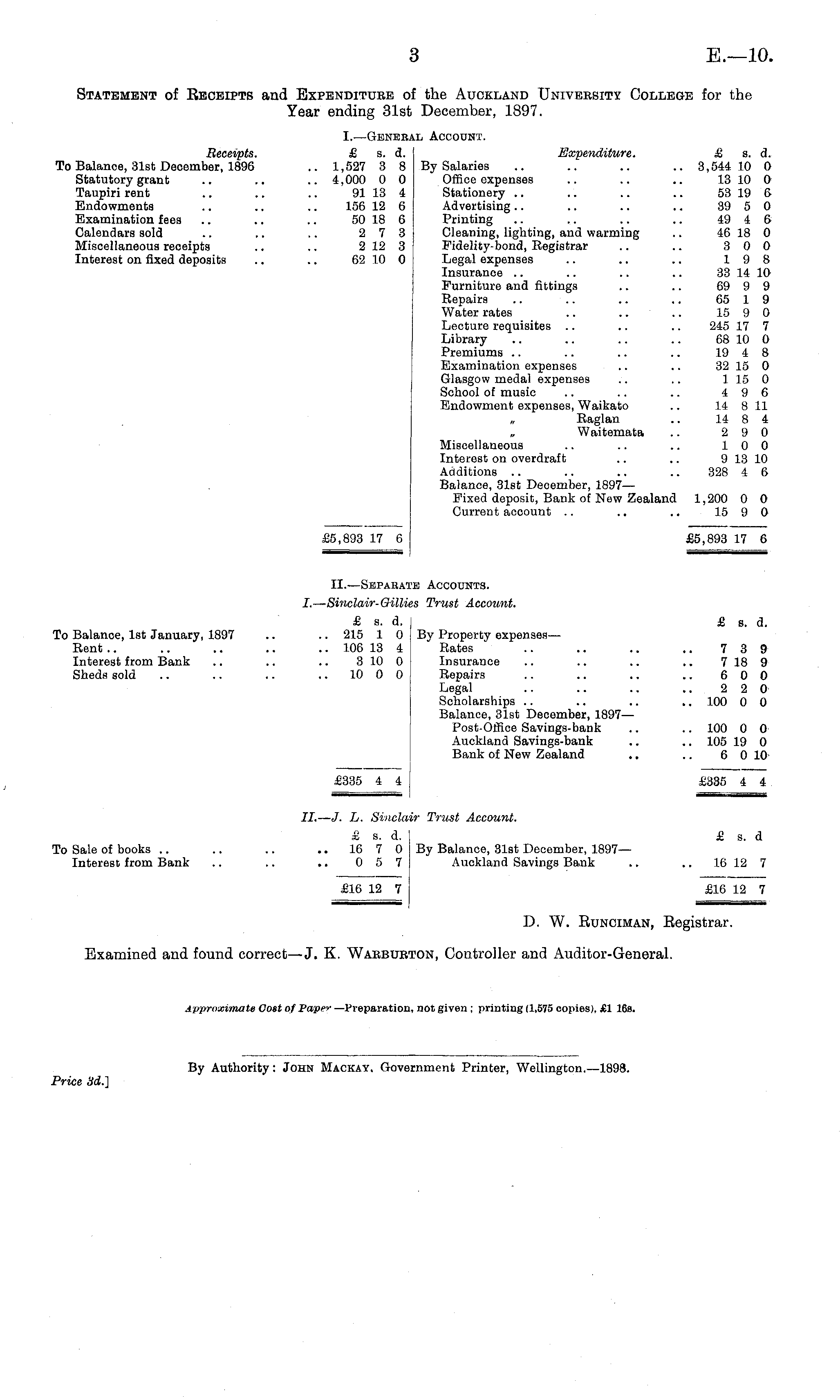 Statement of Eeceipts and Expenditube of the Auckland University College for the Year ending 31st December, 1897. I. —General Account. Eeceipts. £ s. d. Expenditure. £ a. d. To Balance, 31st December, 1896 .. 1,527 3 8 By Salaries .. .. .. .. 3,544 10 0 Statutory grant .. .. .. 4,000 0 0 Office expenses .. .. .. 13 10 0 Taupiri rent .. .. .. 91 13 4 Stationery .. .. .. .. 53 19 6 Endowments .. .. .. 156 12 6 Advertising.. .. .. .. 39 5 0 Examination fees .. .. .. 50 18 6 Printing .. .. .. .. 49 4 6 Calendars sold .. .. .. 2 7 3 Cleaning, lighting, and warming .. 46 18 0 Miscellaneous receipts .. .. 212 3 Fidelity-bond, Registrar .. .. 3 0 0 Interest on fixed deposits .. .. 62 10 0 Legal expenses .. .. .. 19 8 Insurance .. .. .. .. 33 1.4 10 Furniture and fittings .. .. 69 9 9 Repairs .. .. .. .. 65 1 9 Water rates .. .. .. 15 9 0 Lecture requisites .. .. .. 245 17 7 Library .. .. .. .. 68 10 0 Premiums .. .. .. .. 19 4 8 Examination expenses .. .. 32 15 0 Glasgow medal expenses .. .. 115 0 School of music .. .. .. 4 9 6 Endowment expenses, Waikato .. 14 811 Raglan .. 14 8 4 Waitemata .. 2 9 0 Miscellaneous .. .. .. 10 0 Interest on overdraft .. .. 9 13 10 Additions .. .. .. .. 328 4 6 Balance, 31st December, 1897 — Fixed deposit, Bank of New Zealand 1,200 0 0 Current account .. .. .. 15 9 0 £5,893 17 6 £5,893 17 6 II. —Sepabate Accounts. I. — Sinclair-Gillies Trust Account. £ s. d. I £ s. d. To Balance, Ist January, 1897 .. .. 215 1 0 By Property expenses— Rent .. .. .. .. .. 106 13 4 Rates .. .. .. .. 7 3 9 Interest from Bank .. .. .. 3 10 0 Insurance .. .. .. .. 7 18 9 Sheds sold .. .. .. 10 0 0 Repairs .. .. .. .. 6 0 0 Legal .. .. .. .. 2 2 0 Scholarships .. .. .. .. 100 0 0 Balance, 31st December, 1897— Post-Office Savings-bank .. .. 100 0 0 Auckland Savings-bank .. .. 105 19 0 Bank of New Zealand .. .. 6 0 10 £335 4 4 £335 4 4 lI. — J. L. Sinclair Trust Account. £ s. d. £ s. d To Sale of books .. .. .. 16 7 0 By Balance, 31st December, 1897— Interest from Bank .. .. .. 0 5 7 Auckland Savings Bank .. .. 16 12 7 £16 12 7 £16 12 7 D. W. Eunciman, Eegistrar. Examined and found correct — J. K. Waebubton, Controller and Auditor-General. Approximate Cost of Paper —Preparation, not given ; printing (1,575 copies), £1 16s.