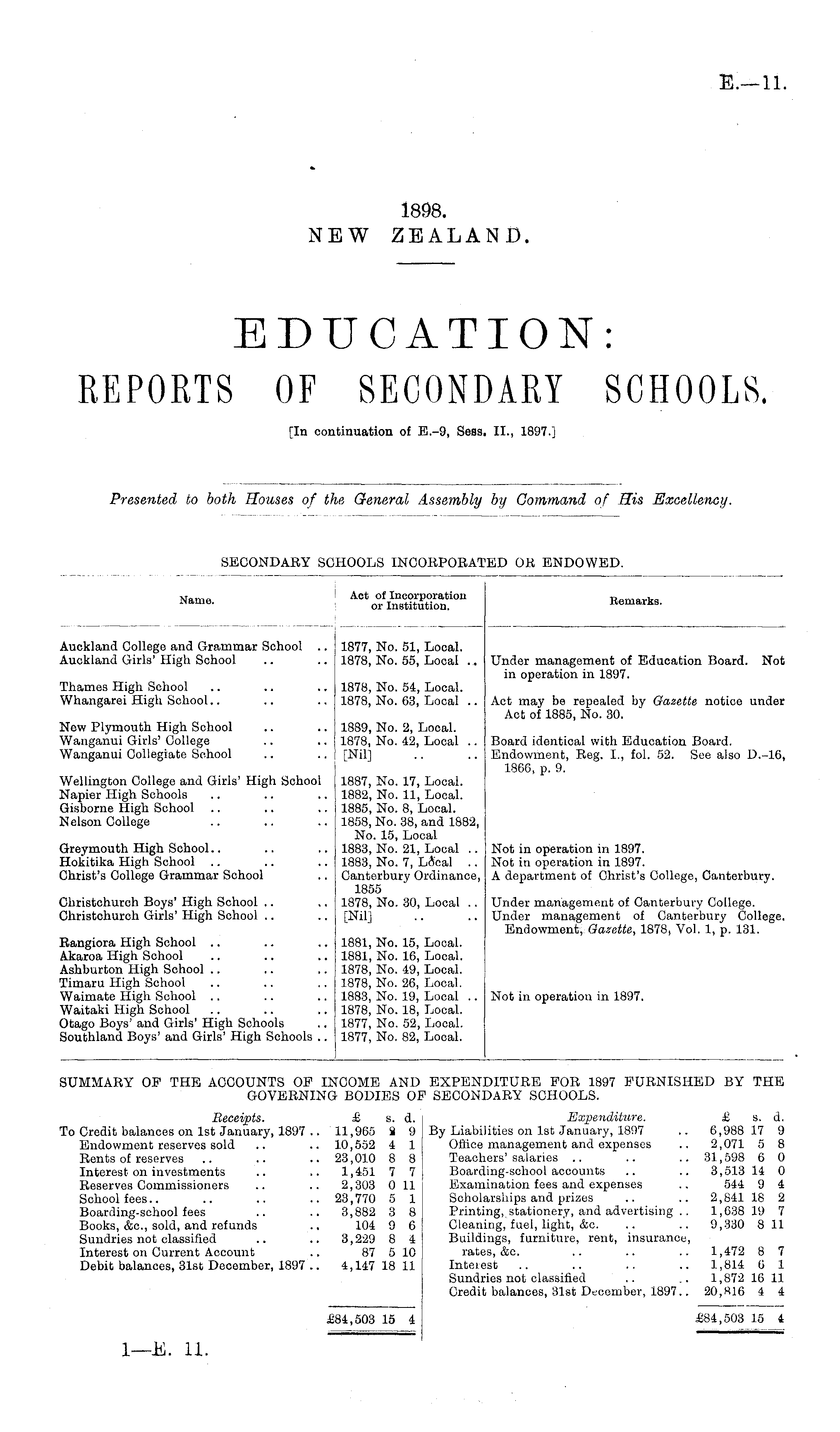 EDUCATION: REPORTS OF SECONDARY SCHOOLS. [In continuation of E.-9, Sess. II., 1897.]