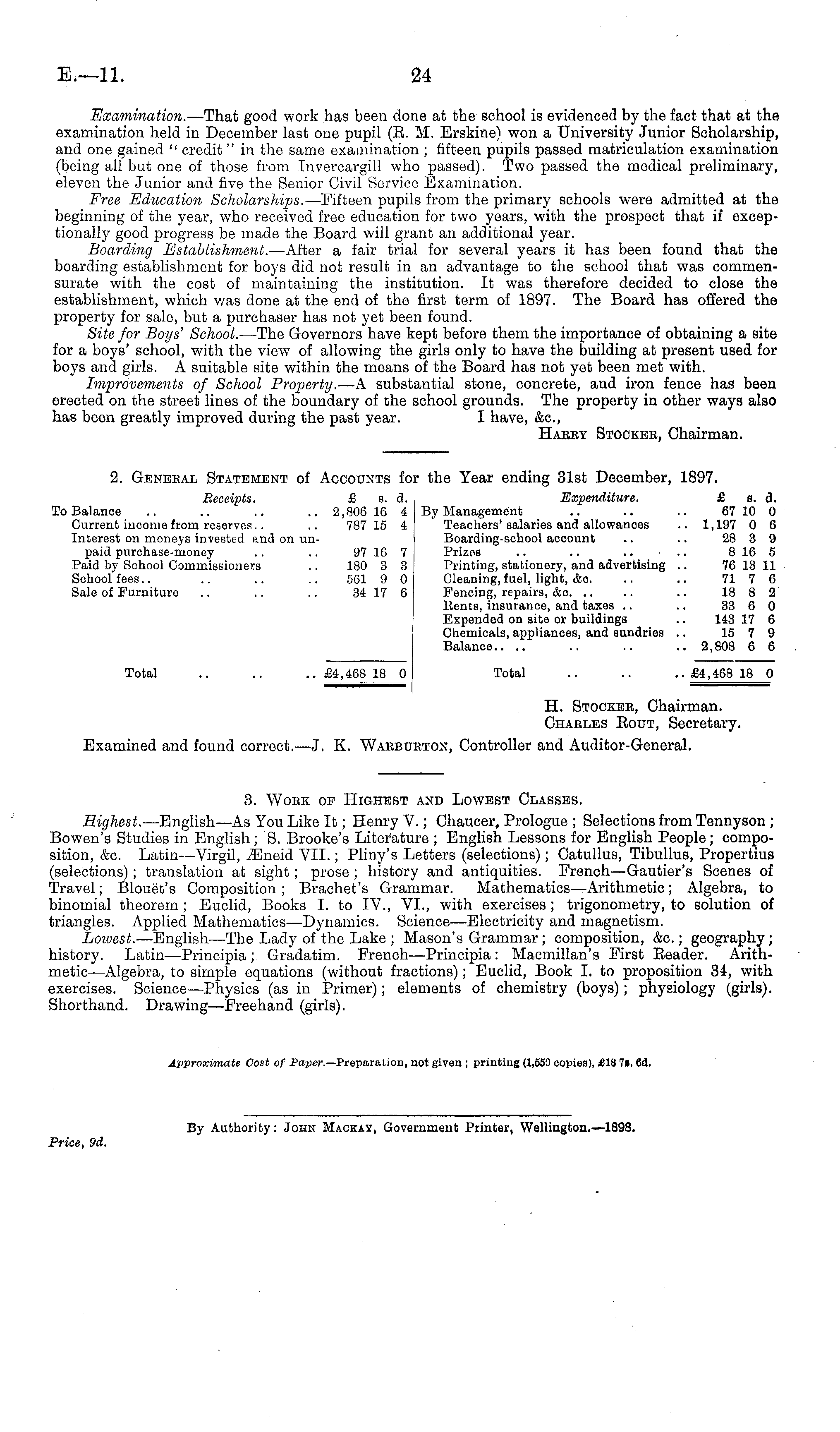 Examination. —That good work has been done at the school is evidenced by the fact that at the examination held in December last one pupil (E. M. Erskine) won a University Junior Scholarship, and one gained " credit " in the same examination ; fifteen pupils passed matriculation examination (being all but one of those from Invercargill who passed). Two passed the medical preliminary, eleven the Junior and five the Senior Civil Service Examination. Free Education Scholarships. —Fifteen pupils from the primary schools were admitted at the beginning of the year, who received free education for two years, with the prospect that if exceptionally good progress be made the Board will grant an additional year. Boarding Establishment. —After a fair trial for several years it has been found that the boarding establishment for boys did not result in an advantage to the school that was commensurate with the cost of maintaining the institution. It was therefore decided to close the establishment, which was done at the end of the first term of 1897. The Board has offered the property for sale, but a purchaser has not yet been found. Site for Boys' School. —The Governors have kept before them the importance of obtaining a site for a boys' school, with the view of allowing the girls only to have the building at present used for boys and girls. A suitable site within the means of the Board has not yet been met with. Improvements of School Property. —A substantial stone, concrete, and iron fence has been erected on the street lines of the boundary of the school grounds. The property in other ways also has been greatly improved during the past year. I have, &c, Harry Stocker, Chairman.