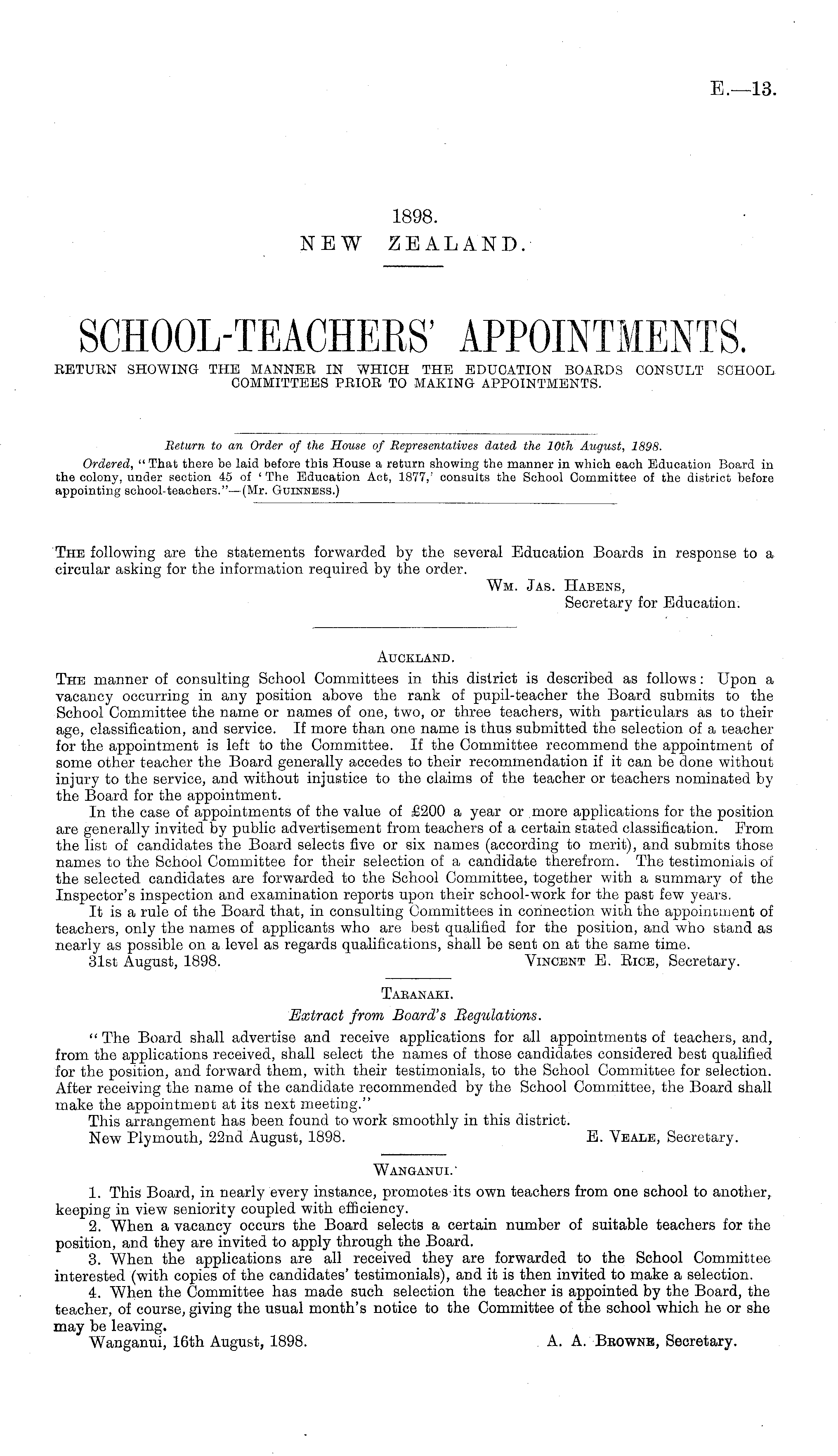 The following are the statements forwarded by the several Education Boards in response to a circular asking for the information required by the order. Wμ. Jas. Habens, Secretary for Education. Auckland. The manner of consulting School Committees in this district is described as follows: Upon a vacancy occurring in any position above the rank of pupil-teacher the Board submits to the School Committee the name or names of one, two, or three teachers, with particulars as to their age, classification, and service. If more than one name is thus submitted the selection of a teacher for the appointment is left to the Committee. If the Committee recommend the appointment of some other teacher the Board generally accedes to their recommendation if it can be done without injury to the service, and without injustice to the claims of the teacher or teachers nominated by the Board for the appointment. In the case of appointments of the value of £200 a year or more applications for the position are generally invited by public advertisement from teachers of a certain stated classification. From the list of candidates the Board selects five or six names (according to merit), and submits those names to the School Committee for their selection of a candidate therefrom. The testimonials of the selected candidates are forwarded to the School Committee, together with a summary of the Inspector's inspection and examination reports upon their school-work for the past few years. It is a rule of the Board that, in consulting Committees in connection with the appointment of teachers, only the names of applicants who are best qualified for the position, and who stand as nearly as possible on a level as regards qualifications, shall be sent on at the same time. 31st August, 1898. Vincent E. Sice, Secretary. Taeanaki. Extract from Board's Regulations. " The Board shall advertise and receive applications for all appointments of teachers, and, from the applications received, shall select the names of those candidates considered best qualified for the position, and forward them, with their testimonials, to the School Committee for selection. After receiving the name of the candidate recommended by the School Committee, the Board shall make the appointment at its next meeting." This arrangement has been found to work smoothly in this district. New Plymouth, 22nd August, 1898. B. Veale, Secretary. Wanganui." 1. This Board, in nearly every instance, promotes its own teachers from one school to another, keeping in view seniority coupled with efficiency. 2. "When a vacancy occurs the Board selects a certain number of suitable teachers for the position, and they are invited to apply through the Board. 3. When the applications are all received they are forwarded to the School Committee interested (with copies of the candidates' testimonials), and it is then invited to make a selection. 4. When the Committee has made such selection the teacher is appointed by the Board, the teacher, of course, giving the usual month's notice to the Committee of the school which he or she may be leaving. Wanganui, 16th August, 1898. A. A. Bbowne, Secretary.