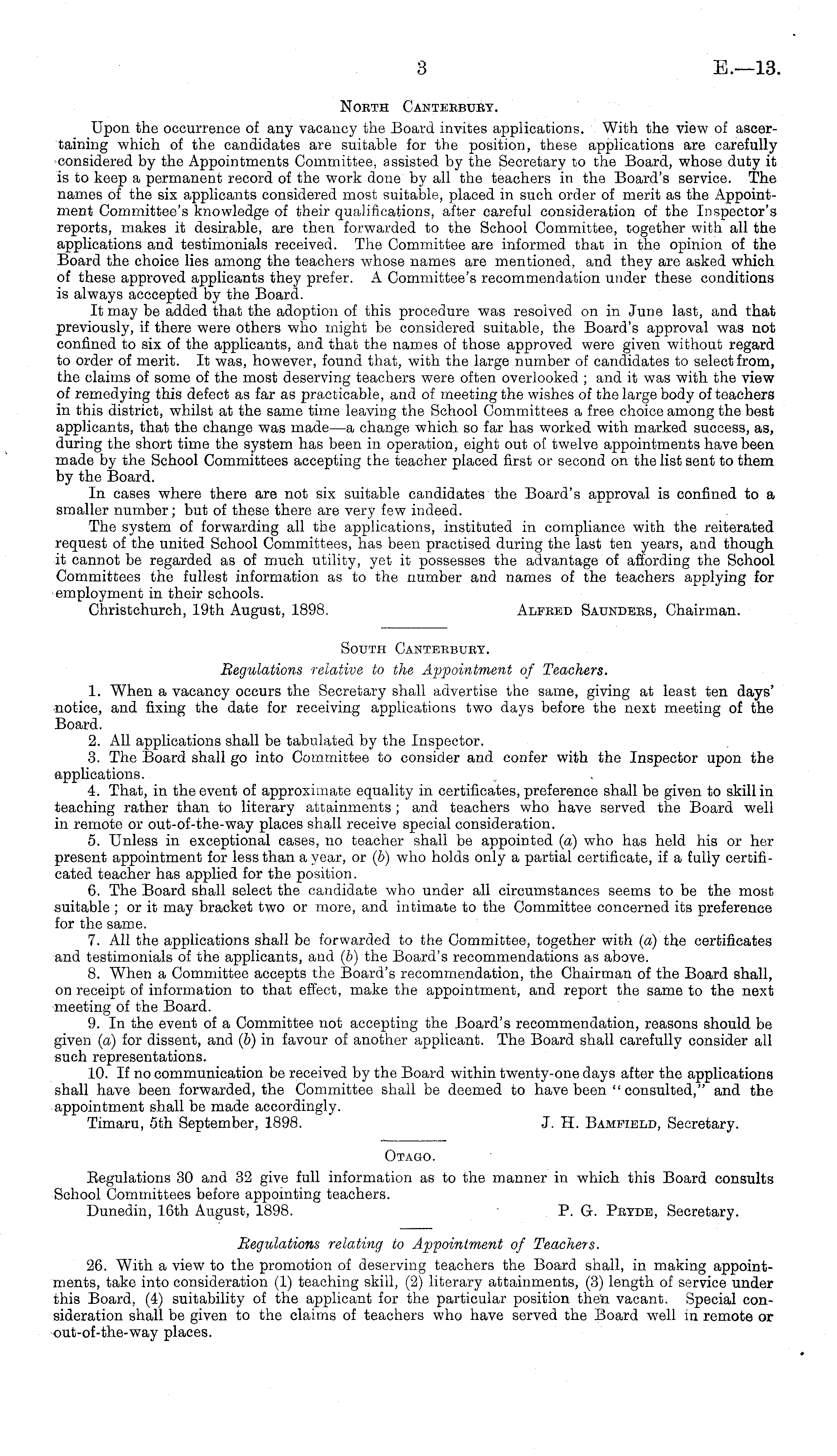 South Cantebbuby. Regulations relative to the Appointment of Teachers. 1. When a vacancy occurs the Secretary shall advertise the same, giving at least ten days' notice, and fixing the date for receiving applications two days before the next meeting of the Board. 2. All applications shall be tabulated by the Inspector. 3. The Board shall go into Committee to consider and confer with the Inspector upon the applications. 4. That, in the event of approximate equality in certificates, preference shall be given to skill in teaching rather than to literary attainments; and teachers who have served the Board well in remote or out-of-the-way places shall receive special consideration. 5. Unless in exceptional cases, no teacher shall be appointed (a) who has held his or her present appointment for less than a year, or (b) who holds only a partial certificate, if a fully certificated teacher has applied for the position. 6. The Board shall select the candidate who under all circumstances seems to be the most suitable ; or it may bracket two or more, and intimate to the Committee concerned its preference for the same. 7. All the applications shall be forwarded to the Committee, together with (a) the certificates and testimonials of the applicants, and (b) the Board's recommendations as above. 8. When a Committee accepts the Board's recommendation, the Chairman of the Board shall, on receipt of information to that effect, make the appointment, and report the same to the next meeting of the Board. 9. In the event of a Committee not accepting the Board's recommendation, reasons should be given (a) for dissent, and (b) in favour of another applicant. The Board shall carefully consider all such representations. 10. If no communication be received by the Board within twenty-one days after the applications shall have been forwarded, the Committee shall be deemed to have been "consulted," and the appointment shall be made accordingly. Timaru, sth September, 1898. J. H. Bamfield, Secretary.