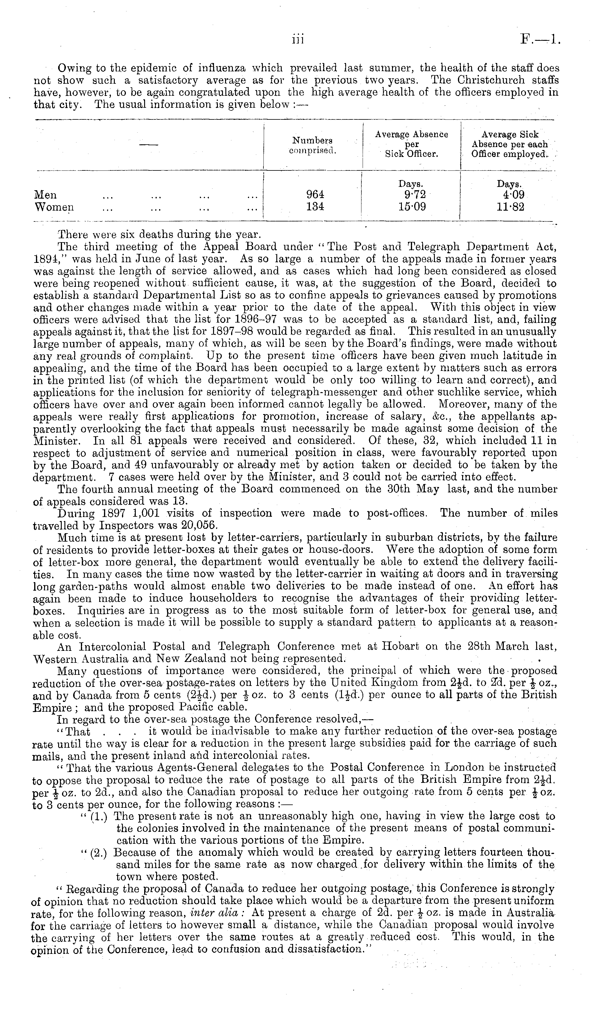 There were six deaths during the year. The third meeting of the Appeal Board under "The Post and Telegraph Department Act, 1894," was held in June of last year. As so large a number of the appeals made in former years was against the length of service allowed, and as cases which had long been considered as closed were being reopened without sufficient cause, it was, at the suggestion of the Board, decided to establish a standard Departmental List so as to confine appeals to grievances caused by promotions and other changes made within a year prior to the date of the appeal. With this object in view officers were advised that the list for 1896-97 was to be accepted as a standard list, and, failing appeals against it, that the list for 1897-98 would be regarded as final. This resulted in an unusually large number of appeals, many of which, as will be seen by the Board's findings, were made without any real grounds of complaint. Up to the present time officers have been given much latitude in appealing, and the time of the Board has been occupied to a large extent by matters such as errors in the printed list (of which the department would be only too willing to learn and correct), and applications for the inclusion for seniority of telegraph-messenger and other suchlike service, which officers have over and over again been informed cannot legally be allowed. Moreover, many of the appeals were really first applications for promotion, increase of salary, &c, the appellants apparently overlooking the fact that appeals must necessarily be made against some decision of the Minister. In all 81 appeals were received and considered. Of these, 32, which included 11 in respect to adjustment of service and numerical position in class, were favourably reported upon by the Board, and 49 unfavourably or already met by action taken or decided to be taken by the department. 7 cases were held over by the Minister, and 3 could not be carried into effect. The fourth annual meeting of the Board commenced on the 30th May last, and the number of appeals considered was 13. During 1897 1,001 visits of inspection were made to post-offices. The number of miles travelled by Inspectors was 20,056. Much time is at present lost by letter-carriers, particularly in suburban districts, by the failure of residents to provide letter-boxes at their gates or house-doors. Were the adoption of some form of letter-box more general, the department would eventually be able to extend the delivery facilities. In many cases the time now wasted by the letter-carrier in waiting at doors and in traversing long garden-paths would almost enable two deliveries to be made instead of one. An effort has again been made to induce householders to recognise the advantages of their providing letterboxes. Inquiries are in progress as to the most suitable form of letter-box for general use, and when a selection is made it will be possible to supply a standard pattern to applicants at a reasonable cost. An Intercolonial Postal and Telegraph Conference met at Hobart on the 28th March last, Western Australia and New Zealand not being represented. Many questions of importance were considered, the principal of which were the proposed reduction of the over-sea postage-rates on letters by the United Kingdom from 2|-d. to 2d. per £ 0z.., and by Canada from 5 cents per £oz. to 3 cents (l£d.) per ounce to all parts of the British Empire ; and the proposed Pacific cable. In regard to the over-sea postage the Conference resolved, — "That ... it would be inadvisable to make any further reduction of the over-sea postage rate until the way is clear for a reduction in the present large subsidies paid for the carriage of such mails, and the present inland and intercolonial rates. " That the various Agents-General delegates to the Postal Conference in London be instructed to oppose the proposal to reduce the rate of postage to all parts of the British Empire from 2|d. per -J oz. to 2d., and also the Canadian proposal to reduce her outgoing rate from 5 cents per Joz. to 3 cents per ounce, for the following reasons : — " (1.) The present rate is not an unreasonably high one, having in view the large cost to the colonies involved in the maintenance of the present means of postal communication with the various portions of the Empire. " (2.) Because of the anomaly which would be created by carrying letters fourteen thousand miles for the same rate as now charged .for delivery within the limits of the town where posted. " Regarding the proposal of Canada to reduce her outgoing postage, this Conference is strongly of opinion that no reduction should take place which would be a departure from the present uniform rate, for the following reason, inter alia : At present a charge of 2d. per oz. is made in Australia for the carriage of letters to however small a distance, while the Canadian proposal would involve the carrying of her letters over the same routes at a greatly reduced cost. This would, in the opinion of the Conference, lead to confusion and dissatisfaction."