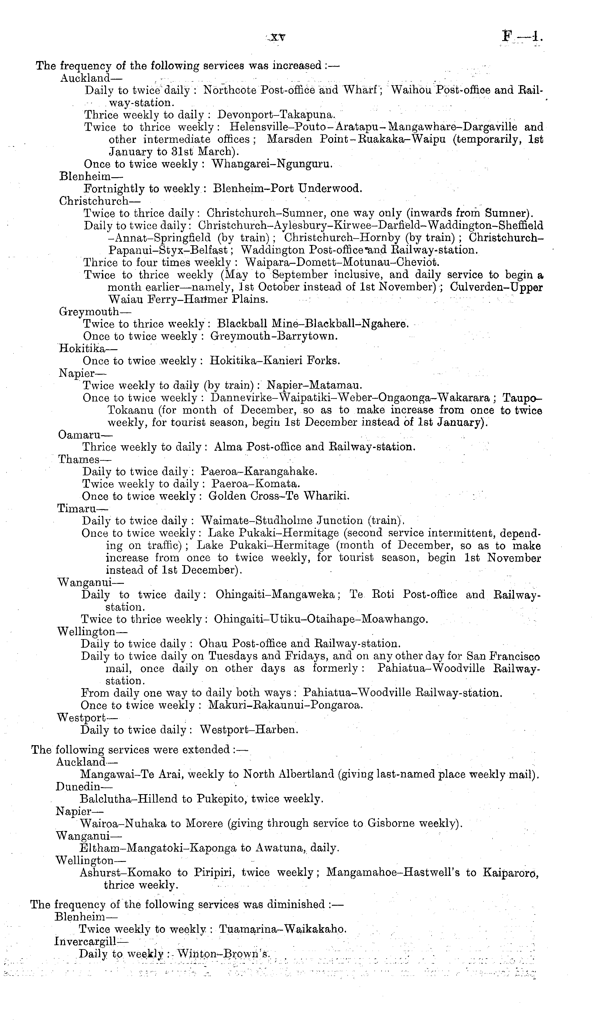 The frequency of the following services was increased : — Auckland— , ■ . . .. ■ Daily to twice daily : Northcote Post-office and Wharf; Waihou Post-office and Bail- . way-station. Thrice weekly to daily : Devonport-Takapuna. Twice to thrice weekly: Helensville-Pouto-Aratapu-Mangawhare-Dargaville and other intermediate offices; Marsden Point - Euakaka-Waipu (temporarily, Ist January to 31st March). Once to twice weekly : Whangarei-Ngunguru. Blenheim— Fortnightly to weekly : Blenheim-Port Underwood. Christchurch — Twice to thrice daily: Christchurch-Sumner, one way only (inwards from Sumner). Daily to twice daily: Christchurch-Aylesbury-Kirwee-Darfield-Waddington-Sheffield -Annat-Springfield (by train) ; Christchurch-Hornby (by train) ; Christehurch-Papanui-Styx-Belfast; Waddington Post-office "and Eailway-station. Thrice to four times weekly : Waipara-Domett-Motunau-Cheviot. Twice to thrice weekly (May to September inclusive, and daily service to begin a month earlier—namely, Ist October instead of Ist November); Culverden-Upper Waiau Ferry-Hatimer Plains. Greymouth — Twice to thrice weekly : Blackball Mine-Blackball-Ngahere. Once to twice weekly : Greymouth-Barrytown. Hokitika— Once to twice weekly : Hokitika-Kanieri Forks. Napier— Twice weekly to daily (by train) : Napier-Matamau. Once to twice weekly : Dannevirke-Waipatiki-Weber-Ongaonga-Wakarara ; TaupoTokaanu (for month of December, so as to make increase from once to twice weekly, for tourist season, begin Ist December instead of Ist January). Oamaru— Thrice weekly to daily : Alma Post-office and Eailway-station. Thames— Daily to twice daily : Paeroa-Karangahake. Twice weekly to daily : Paeroa-Komata. Once to twice weekly : Golden Cross-Te Whariki. Timaru— Daily to twice daily : Waimate-Studholme Junction (train), Once to twice weekly : Lake Pukaki-Hermitage (second service intermittent, depending on traffic) ; Lake Pukaki-Hermitage (month of December, so as to make increase from once to twice weekly, for tourist season, begin Ist November instead of Ist December). Wanganui— Daily to twice daily: Ohingaiti-Mangaweka; Te Eoti Post-office and Eailwaystation. Twice to thrice weekly : Ohingaiti-Utiku-Otaihape-Moawhango. Wellington— Daily to twice daily : Ohau Post-office and Eailway-station. Daily to twice daily on Tuesdays and Fridays, and on any other day for San Francisco mail, once daily on other days as formerly : Pahiatua-Woodville Eailwaystation . From daily one way to daily both ways : Pahiatua-Woodville Eailway-station. Once to twice weekly : Makuri-Bakaunui-Pongaroa. Westport — Daily to twice daily : Westport-Harben. The following services were extended : — Auckland— Mangawai-Te Arai, weekly to North Albertland (giving last-named place weekly mail). Dunedin — Balclutha-Hillend to Pukepito, twice weekly. Napier— Wairoa-Nuhaka to Morere (giving through service to Gisborne weekly). Wanganui— Eltham-Mangatoki-Kaponga to Awatuna, daily. Wellington— Ashurst-Komako to Piripiri, twice weekly; Mangamahoe-Hastwell's to Kaiparoro, thrice weekly. The frequency of the following services was diminished : — Blenheim — Twice weekly to weekly : Tuamarina-Waikakaho. invercargill— Daily to weekly : • Wintpn-Brpwn's. , ... .','.. ;'■ , ■