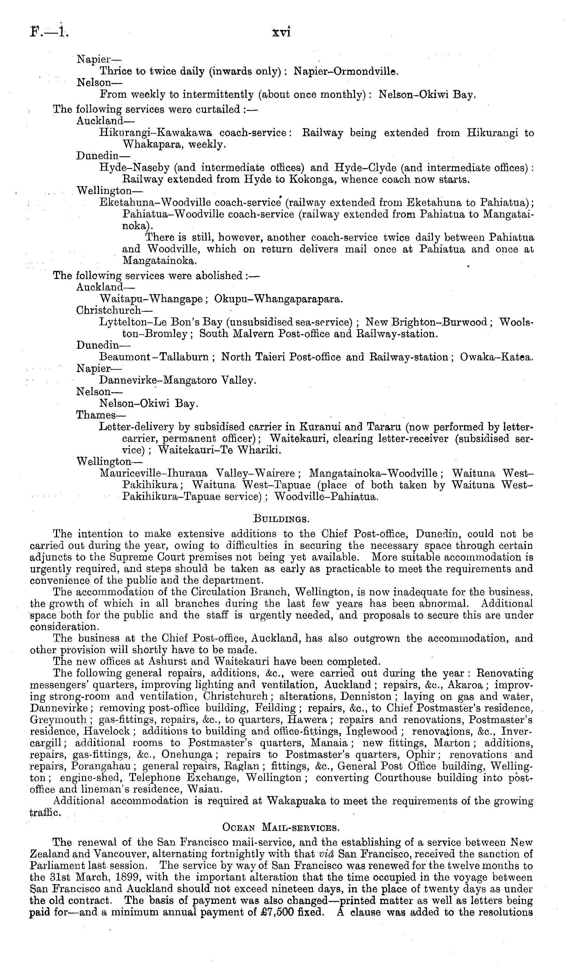 Napier— Thrice to twice daily (inwards only): Napier-Ormondville. Nelson— From weekly to intermittently (about once monthly): Nelson-Okiwi Bay. The following services were curtailed :— Auckland— Hikurangi-Kawakawa coach-service: Eailway being extended from Hikurangi to Whakapara, weekly. Dunedin— Hyde-Naseby (and intermediate offices) and Hyde-Clyde (and intermediate offices): Eailway extended from Hyde to Kokonga, whence coach now starts. ... . Wellington— Eketahuna-Woodville coach-service' (railway extended from Bketahuna to Pahiatua); Pahiatua-Woodville coach-service (railway extended from Pahiatua to Mangatainoka). There is still, however, another coach-service twice daily between Pahiatua and Woodville, which on return delivers mail once at Pahiatua and once at Mangatainoka. The following services were abolished :— Auckland— Waitapu-Whangape; Okupu-Whangaparapara. Christchurch — Lyttelton-Le Bon's Bay (unsubsidised sea-service) ; New Brighton-Burwood; Wools-ton-Bromley ; South Malvern Post-office and Bailway-station. Dunedin— Beaumont-Tallaburn ; North Taieri Post-office and Eailway-station ; Owaka-Katea. Napier— Dannevirke-Mangatoro Valley. Nelson— Nelson-Okiwi Bay. Thames— Letter-delivery by subsidised carrier in Kuranui and Tararu (now performed by lettercarrier, permanent officer); Waitekauri, clearing letter-receiver (subsidised service) ; Waitekauri-Te Whariki. Wellington— Mauriceville-Ihuraua Valley-Wairere ; Mangatainoka-Woodville; Waituna WestPakihikura; Waituna West-Tapuae (place of both taken by Waituna West-Pakihikura-Tapuae service); Woodville-Pahiatua. Buildings. The intention to make extensive additions to the Chief Post-office, Dunedin, could not be carried out during the year, owing to difficulties in securing the necessary space through certain adjuncts to the Supreme Court premises not being yet available. More suitable accommodation is urgently required, and steps should be taken as early as practicable to meet the requirements and convenience of the public and the department. The accommodation of the Circulation Branch, Wellington, is now inadequate for the business, the growth of which in all branches during the last few years has been abnormal. Additional space both for the public and the staff is urgently needed, and proposals to secure this are under consideration. The business at the Chief Post-office, Auckland, has also outgrown the accommodation, and other provision will shortly have to be made. The new offices at Ashurst and Waitekauri have been completed. The following general repairs, additions, &c, were carried out during the year : Eenovating messengers' quarters, improving lighting and ventilation, Auckland ; repairs, &c, Akaroa ; improving strong-room and ventilation, Christchurch; alterations, Denniston ; laying on gas and water, Dannevirke; removing post-office building, Feilding ; repairs, &c, to Chief Postmaster's residence, Greymouth ; gas-fittings, repairs, &c, to quarters, Hawera; repairs and renovations, Postmaster's residence, Havelock ; additions to building and office-fittings, Inglewood ; renovations, &c, Invercargill; additional rooms to Postmaster's quarters, Manaia; new fittings, Marton; additions, repairs, gas-fittings, &c, Onehunga; repairs to Postmaster's quarters, Ophir; renovations and repairs, Porangahau; general repairs, Eaglan ; fittings, &c, General Post Office building, Wellington ; engine-shed, Telephone Exchange, Wellington ; converting Courthouse building into postoffice and lineman's residence, Waiau. Additional accommodation is required at Wakapuaka to meet the requirements of the growing tralfic. Ocean Mail-services. The renewal of the San Francisco mail-service, and the establishing of a service between New Zealand and Vancouver, alternating fortnightly with that vid San Francisco, received the sanction of Parliament last session. The service by way of San Francisco was renewed for the twelve months to the 31st March. 1899, with the important alteration that the time occupied in the voyage between San Francisco and Auckland should not exceed nineteen days, in the place of twenty days as under the old contract. The basis of payment was also changed—printed matter as well as letters being paid for—and a minimum annual payment of £7,500 fixed. A clause was added to the resolutions