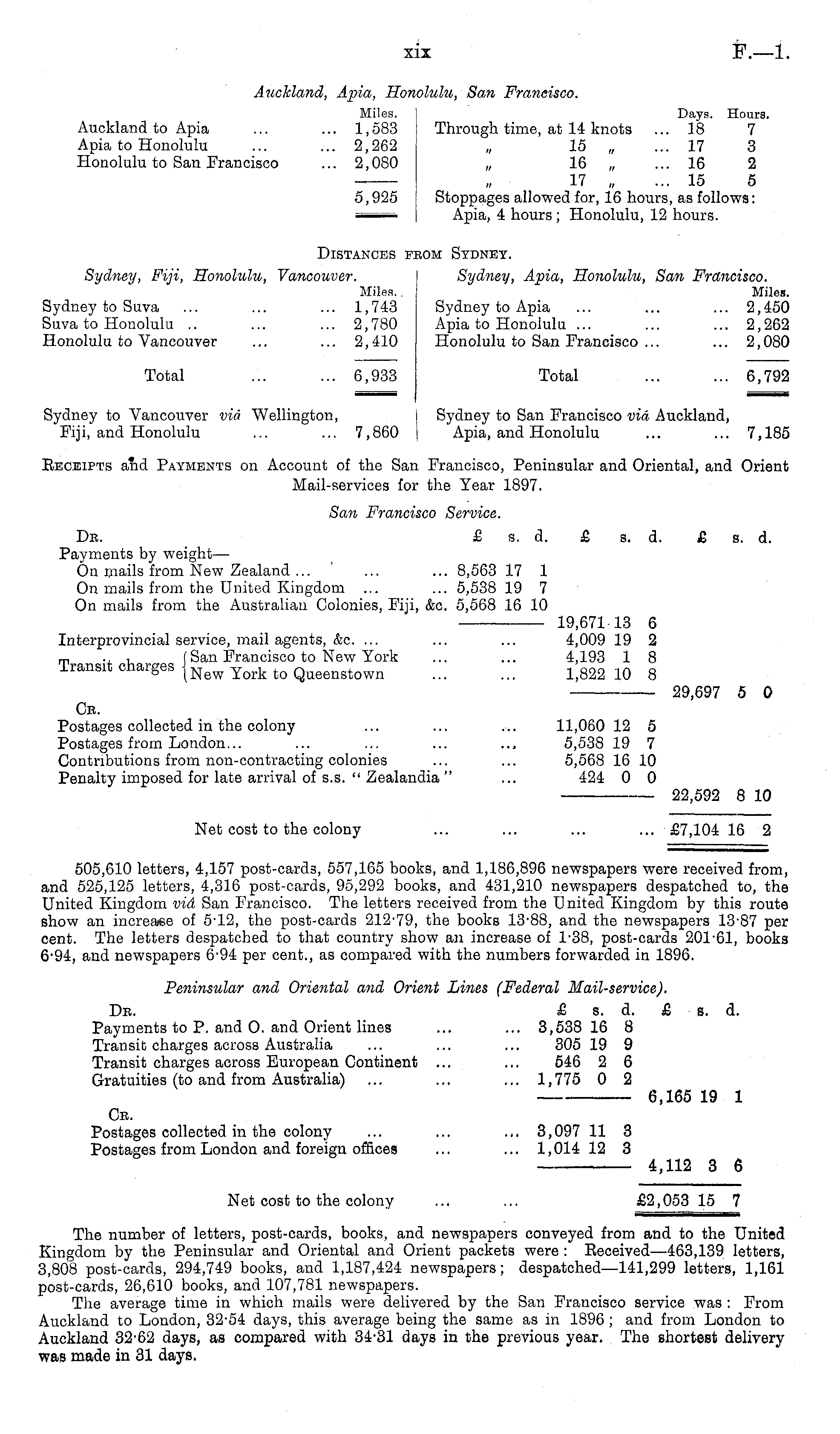 Auckland, Apia, Honolulu, San Francisco. Miles. Days. Hours. Auckland to Apia ... ... 1,583 Through time, at 14 knots ... 18 7 Apia to Honolulu ... ... 2,262 „ 15 „ ... 17 3 Honolulu to San Francisco ... 2,080 „ 16 „ ... 16 2 17 „ ... 15 5 5,925 Stoppages allowed for, 16 hours, as follows: Apia, 4 hours ; Honolulu, 12 hours. Distances from Sydney. Sydney, Fiji, Honolulu, Vancouver. Sydney, Apia, Honolulu, San Francisco. Miles.. Miles. Sydney to Suva ... ... ... 1,743 Sydney to Apia ... ... ... 2,450 Suva to Honolulu .. ... ... 2,780 Apia to Honolulu. ... ... ... 2,262 Honolulu to Vancouver ... ... 2,410 Honolulu to San Francisco ... ... 2,080 Total ... ... 6,933 Total ... ... 6,792 Sydney to Vancouver via Wellington, Sydney to San Francisco via Auckland, Fiji, and Honolulu ... ... 7,860 Apia, and Honolulu ... ... 7,185 Ebceipts and Payments on Account of the San Francisco, Peninsular and Oriental, and Orient Mail-services for the Year 1897. San Francisco Service. De. £ s. d. £ s. d. £ s. d. Payments by weight— On mails from New Zealand ... ... ...8,563 17 1 On mails from the United Kingdom ... ... 5,538 19 7 On mails from the Australian Colonies, Fiji, &c. 5,568 16 10 19,671 13 6 Interprovincial service, mail agents, &c. ... ... ... 4,009 19 2 m ~ , f San Francisco to New York ... ... 4,193 1 8 Transit charges ) New York tQ Qaeenstown 1,822 10 8 29,697 5 0 Cβ. Postages collected in the colony ... ... ... 11,060 12 5 Postages from London... ... ... ... ... 5,538 19 7 Contributions from non-contracting colonies ... ... 5,568 16 10 Penalty imposed for late arrival of s.s. " Zealandia " ... 424 0 0 22,592 8 10 Net cost to the colony ... ... ... ... £7,104 16 2 505,610 letters, 4,157 post-cards, 557,165 books, and 1,186,896 newspapers were received from, and 525,125 letters, 4,316 post-cards, 95,292 books, and 431,210 newspapers despatched to, the United Kingdom vid San Francisco. The letters received from the United Kingdom by this route show an increase of 5-12, the post-cards 212-79, the books 1388, and the newspapers 13-87 per cent. The letters despatched to that country show an increase of 1-38, post-cards 201-61, books 6 - 94, and newspapers 6-94 per cent., as compared with the numbers forwarded in 1896. Peninsular and Oriental and Orient Lines (Federal Mail-service). De. £ s. d. £ s. d. Payments to P. and O. and Orient lines ... ... 3,538 16 8 Transit charges across Australia ... ... ... 305 19 9 Transit charges across European Continent ... ... 546 2 6 Gratuities (to and from Australia) ... ... ... 1,775 0 2 6,165 19 1 Cβ. Postages collected in the colony ... ... ... 3,097 11 3 Postages from London and foreign offices ... ... 1,014 12 3 4,112 3 6 Net cost to the colony ... ... £2,053 15 7 The number of letters, post-cards, books, and newspapers conveyed from and to the United Kingdom by the Peninsular and Oriental and Orient packets were : Eeceived—463,l39 letters, 3,808 post-cards, 294,749 books, and 1,187,424 newspapers; despatched—l4l,299 letters, 1,161 post-cards, 26,610 books, and 107,781 newspapers. The average time in which mails were delivered by the San Francisco service was : From Auckland to London, 32-54 days, this average being the same as in 1896 ; and from London to Auckland 32-62 days, as compared with 34-31 days in the previous year. The shortest delivery was made in 31 days.
