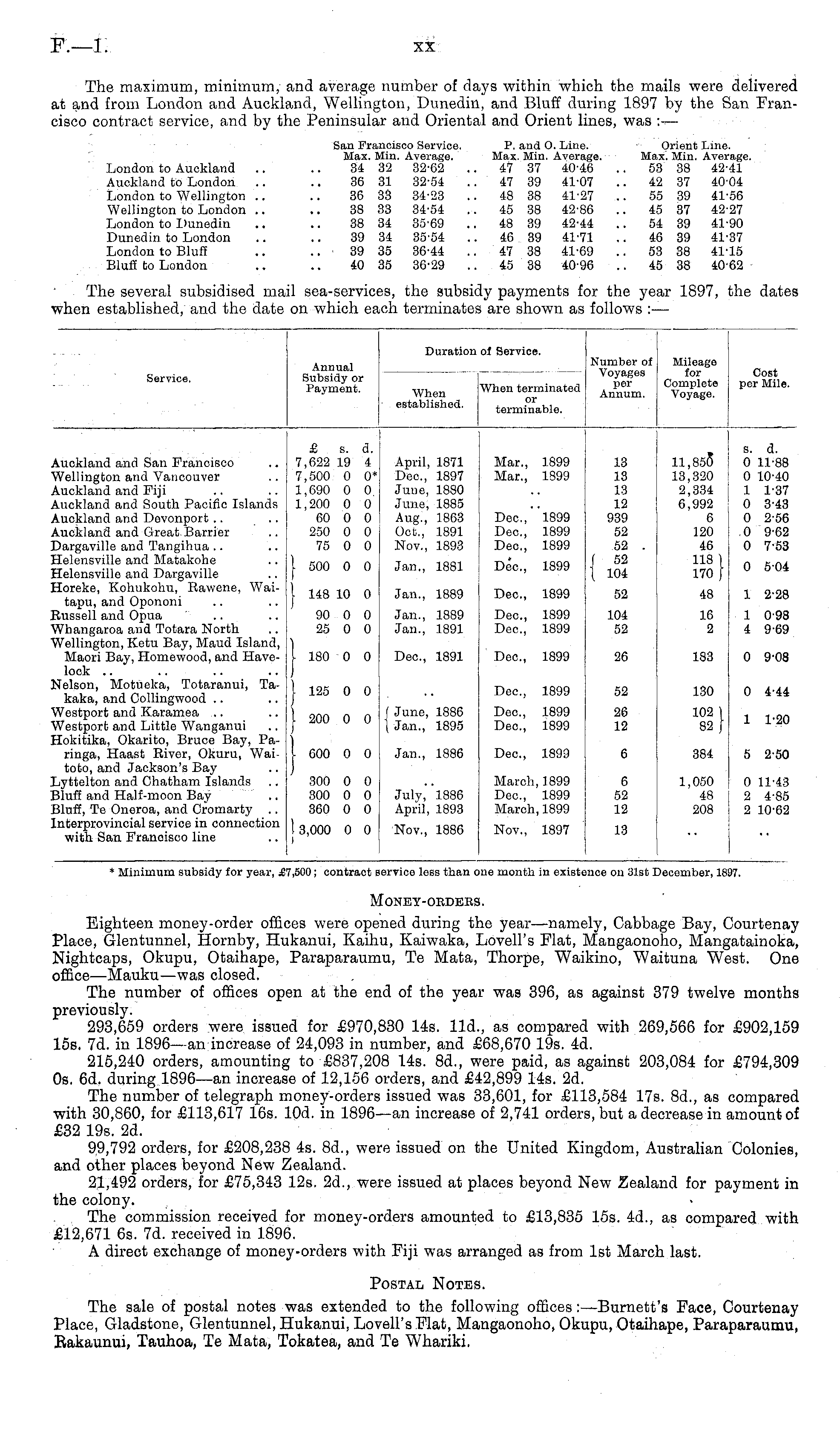 The maximum, minimum, and average number of days within which the mails were delivered at and from London and Auckland, Wellington, Dunedin, and Bluff during 1897 by the San Francisco contract service, and by the Peninsular and Oriental and Orient lines, was ; — San Francisco Service. P. and O. Line. Orient Line. Max. Mm. Average. Max. Mm. Average. Max. Mm. Average. London to Auckland .. .. 34 32 32-62 .. 47 37 4046 .. 53 38 42-41 Auckland to London .. .. 36 31 32-54 .. 47 39 41-07 .. 42 37 40-04 London to Wellington .. .. 36 33 34-23 .. 48 38 4127 .. 55 39 41-56 Wellington to London .. .. 38 33 34-54 .. 45 38 42-86 .. 45 37 42-27 London to Dunedin .. .. 38 34 3569 .. 48 39 42-44 .. 54 39 41-90 Dunedin to London .. .. 39 34 35-54 .. 46 39 41-71 .. 46 39 41-37 London to Blufi .. .. 39 35 36-44 .. 47 38 41-69 .. 53 38 41-15 Bluff to London .. .. 40 35 36-29 .. 45 38 40-96 .. 45 38 40-62 The several subsidised mail sea-services, the subsidy payments for the year 1897, the dates when established, and the date on which each terminates are shown as follows :—