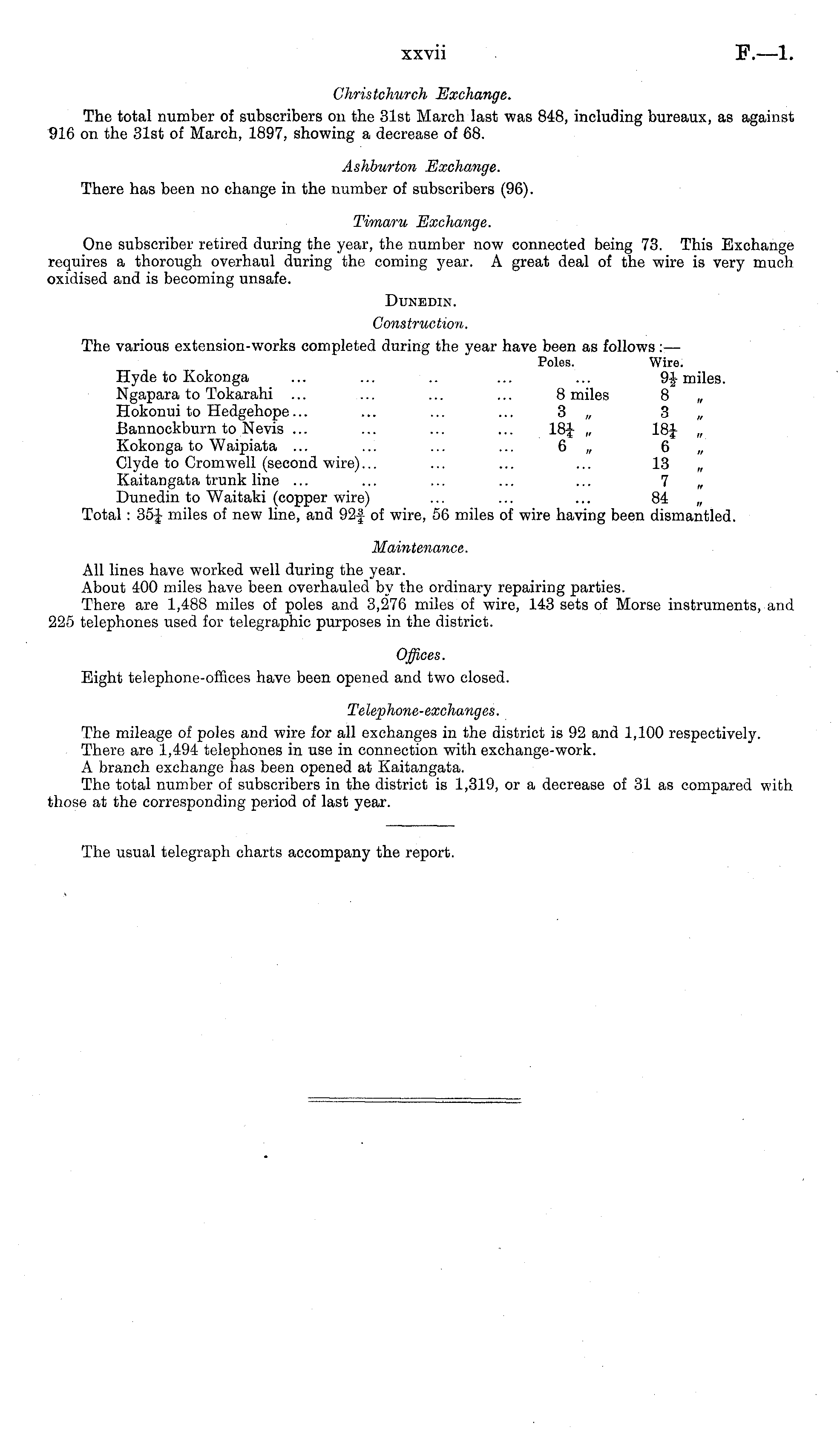 Christchurch Exchange. The total number of subscribers on the 31st March last was 848, including bureaux, as against 916 on the 31st of March, 1897, showing a decrease of 68. Ashburton Exchange. There has been no change in the number of subscribers (96). Timaru Exchange. One subscriber retired during the year, the number now connected being 73. This Exchange requires a thorough overhaul during the coming year. A great deal of the wire is very much oxidised and is becoming unsafe. Dunedin. Construction. The various extension-works completed during the year have been as follows: — Poles. Wire. Hyde to Kokonga ... ... .. ... ... 9f miles. Ngapara to Tokarahi ... ... ... ... 8 miles 8 „ Hokonui to Hedgehope... ... ... ... 3 „ 3 „ Bannockburn to Nevis ... ... ... ... 18J „ 18J „ Kokonga to Waipiata ... ... ... ... 6 „ 6 „ Clyde to Cromwell (second, wire)... ... ... ... 13 „ Kaitangata trunk line ... ... ... ... ... 7 „ Dunedin to Waitaki (copper wire) ... ... ... 84 „ Total: 35J miles of new line, and 92f of wire, 56 miles of wire having been dismantled. Maintenance. All lines have worked well during the year. About 400 miles have been overhauled by the ordinary repairing parties. There are 1,488 miles of poles and 3,276 miles of wire, 143 sets of Morse instruments, and 225 telephones used for telegraphic purposes in the district. Offices. Eight telephone-offices have been opened and two closed. Telephone-exchanges. The mileage of poles and wire for all exchanges in the district is 92 and 1,100 respectively. There are 1,494 telephones in use in connection with exchange-work. A branch exchange has been opened at Kaitangata. The total number of subscribers in the district is 1,319, or a decrease of 31 as compared with those at the corresponding period of last year.
