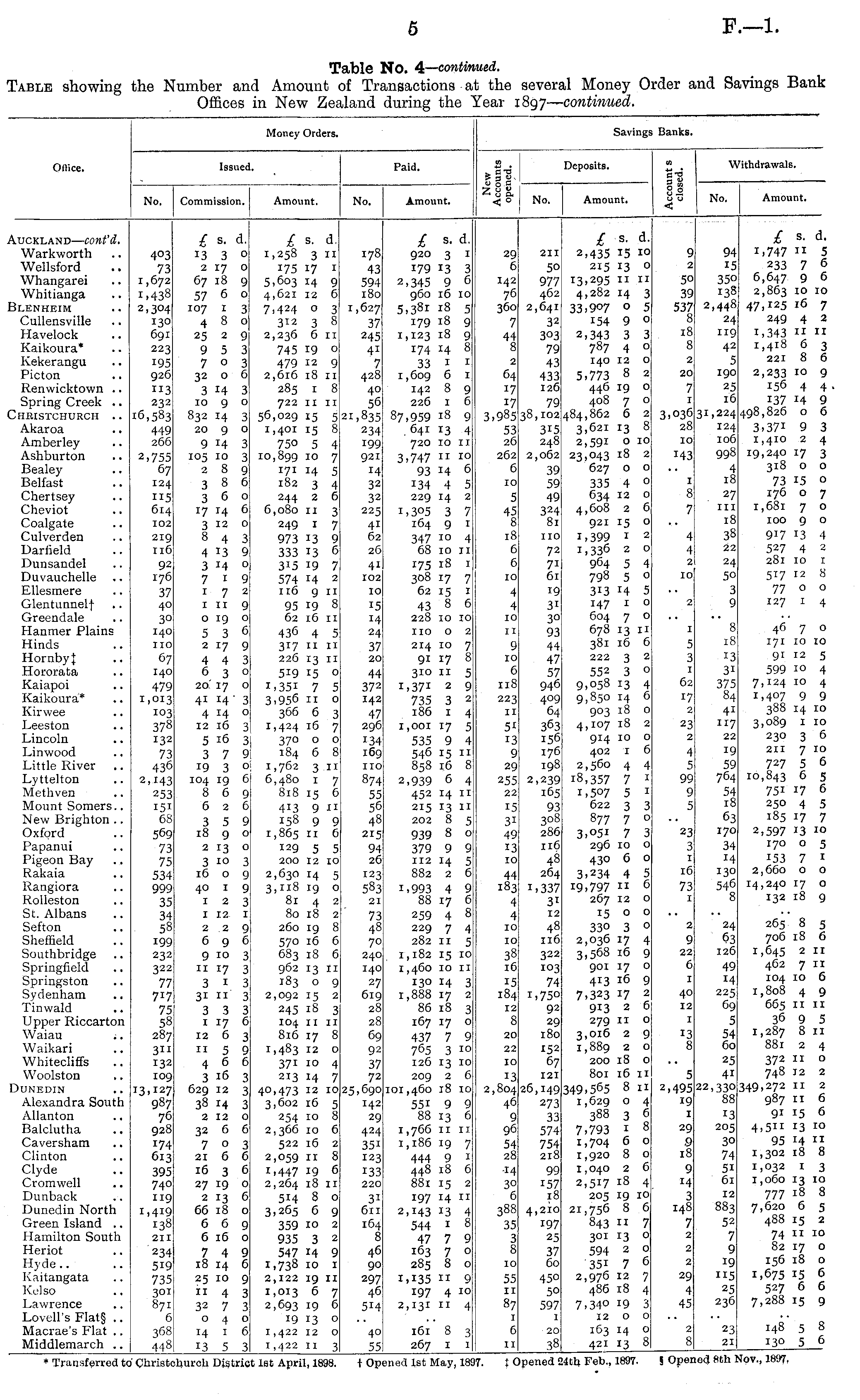 Table No. 4 — continued. Table showing the Number and Amount of Transactions at the several Money Order and Savings Bank Offices in New Zealand during the Year 1897 — continued.