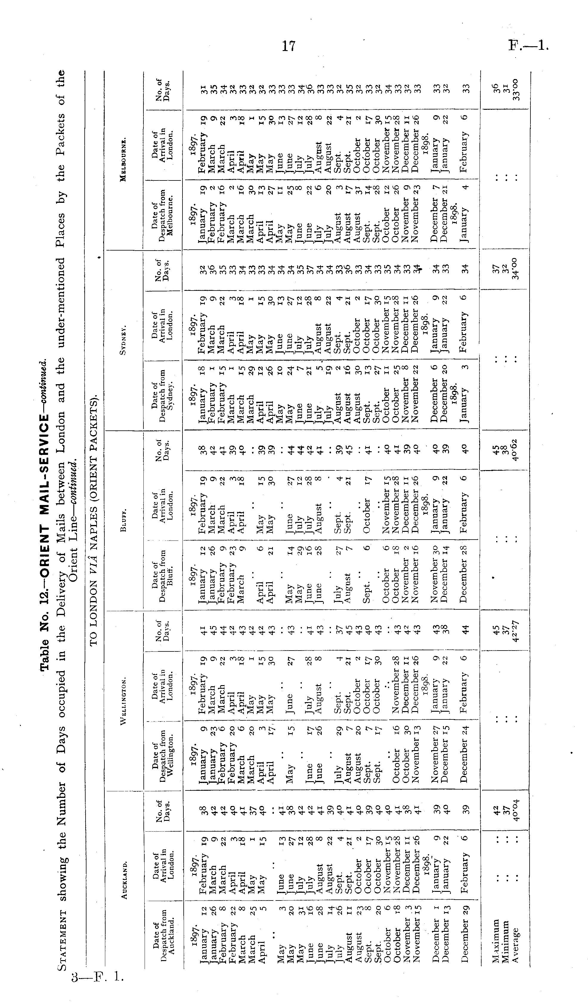 TO LONDON VIA NAPLES (ORIENT PACKETS). ta] I—' Auckland. Wellington. Bluff. Sydney. Melbourne. Date of Despatch from Auckland. Date of Arrival in London. No. of Days. Date of Despatch from Wellington. Date of Arrival in London. No. of Days. Date of Despatch from Bluff. Date of Arrival in London. No. of Days. Date of Despatch from Sydney. Date of Arrival in London. No. of Days. Date of Despatch from Melbourne. Date of Arrival in London. No. of Days. 1897. January 12 January 26 February 8 February 22 March 8 March 25 April 5 1897. February 19 March 9 March 22 April 3 April 18 May 1 May 15 38 42 42 40 41 37 40 i8 97 . January 9 January 23 February 6 February 20 March 6 March 20 April 3 April 17, 1897. February 19 March 9 March 22 April 3 April 18 Ma} , 1 May 15 May 30 41 45 44 42 43 42 42 43 1897. January 12 January 26 February 9 February 23 March 9 1897. February 19 March 9 March 22 April 3 April 18 38 42 4 1 39 40 1897. January 18 February 1 February 15 March 1 March 15 March 29 April 12 April 26 May 10 May 24 June 7 June 21 July 5 . July 19 August 2 August 16 August 30 Sept. 13 Sept. 27 October 11 October 25 November 8 November 22 1897. February 19 March 9 March 22 April 3 April 18 May 1 May 15 May 30 June 13 June 27 July 12 July 28 August 8 August 22 Sept. 4 Sept. 21 October 2 October 17 October 30 November 15 November 28 December 11 December 26 1898. January 9 January 22 32 36 35 33 34 33 33 34 34 34 35 37 34 34 33 36 33 34 33 35 34 33 1897. January 19 February 2 February 16 March 2 March 16 March 30 April 13 April 27 May 11 May 25 June 8 June 22 July 6 July 20 August 3 August 17 August 31 Sept. 14 Sept. 28 October 12 October 26 November 9 November 23 1897. February 19 March 9 March 22 April 3 April 18 May 1 May 15 May 30 June 13 June 27 July 12 July 28 August 8 August 22 Sept. 4 Sept. 21 October 2 October 17 October 30 November 15 November 28 December 11 December 26 1898. January 9 January 22 31 35 34 32 33 32 33 33 33 34 36 33 33 32 35 32 33 32 34 33 32 33 April 6 April 21 May 15 May 30 39 39 May 3 May 20 May 31 June 16 June 28 July 14 July 26 August 11 August 23 Sept. 8 Sept. 20 October 6 October t8 N ovember 3 November 15 June 13 June 27 July 12 July 28 August 8 August 22 Sept. 4 Sept. 21 October 2 October 17 October 30 November 15 November 28 December 1 1 December 26 1898. January 9 January 22 41 38 42 42 41 39 40 4 1 40 39 40 40 4 1 38 4 1 May 15 June 17 June 26 July 29 August 7 August 20 Sept. 7 Sept. 17 June 27 July 28 August 8 Sept. 4 Sept. 21 October 2 October 17 October 30 43 4 1 43 37 45 43 40 43 May 14 May 29 June 16 June 28 July 27 August 7 June 27 July 12 July 28 August 8 Sept. 4 Sept. 21 44 44 42 4 1 39 45 Sept. 6 October 17 41 October 16 October 30 November 13 November 28 December 11 December 26 1898. January 9 January 22 43 42 43 October 6 October 18 November 2 November 16 November 15 November 28 December 11 December 26 1898. January 9 January 22 40 41 39 40 December 1 December 13 39 40 November 27 December 15 43 38 November 30 December 14 40 39 December 6 December 20 1898. January 3 34 33 December 7 December 21 1898. January 4 33 32 December 29 February 6 39 December 24 February 6 44 December 28 February 6 40 February 6 34 February 6 33 M «imum Minimum Average 42 37 40-04 45 37 42-27 45 38 4O62 37 32 34-00 36 3 1 33-00