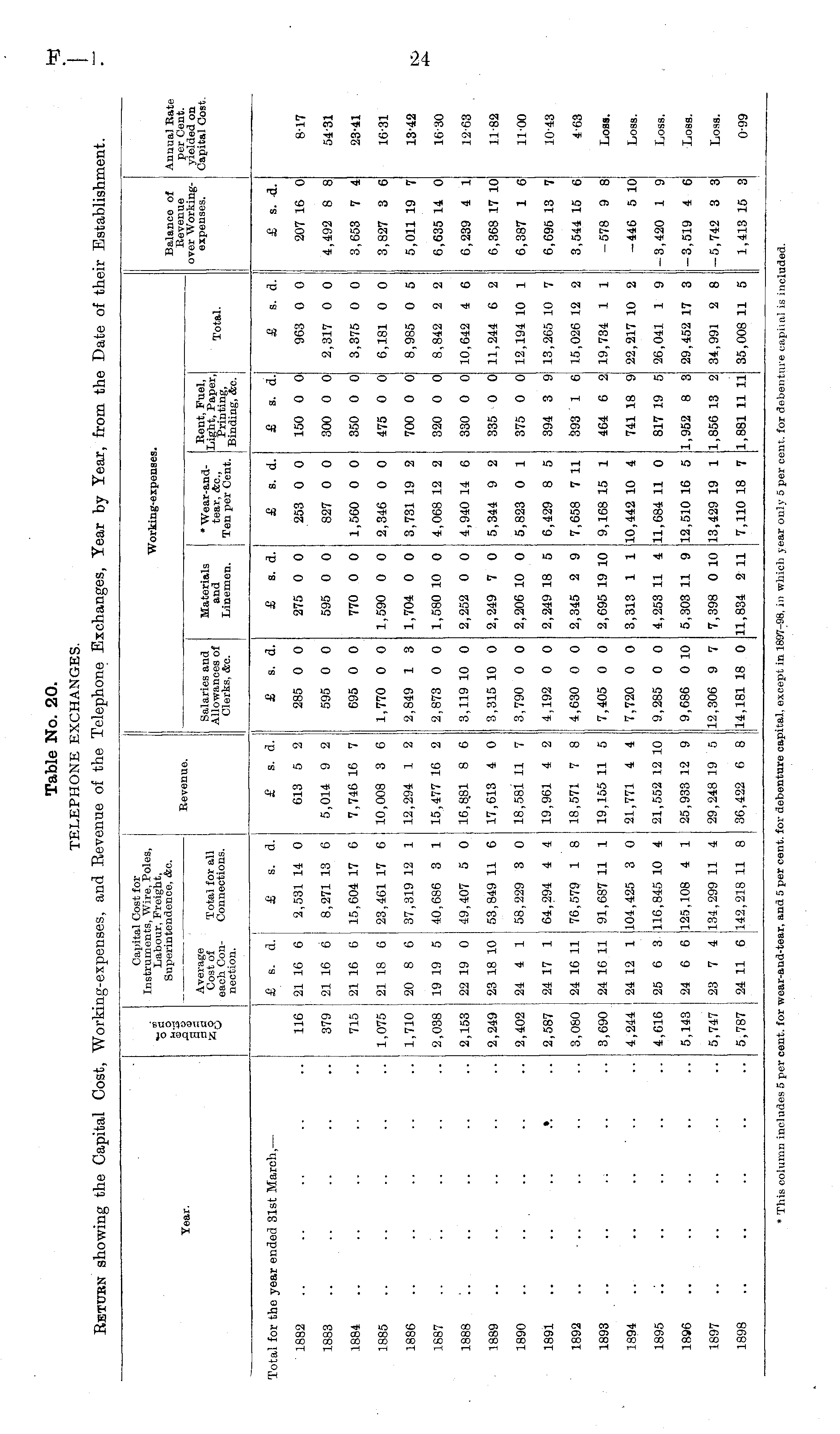 Table No. 20. TELEPHONE EXCHANGES. Return showing the Capital Cost, Working-expenses, and Revenue of the Telephone Exchanges, Year by Year, from the Date of their Establishment.