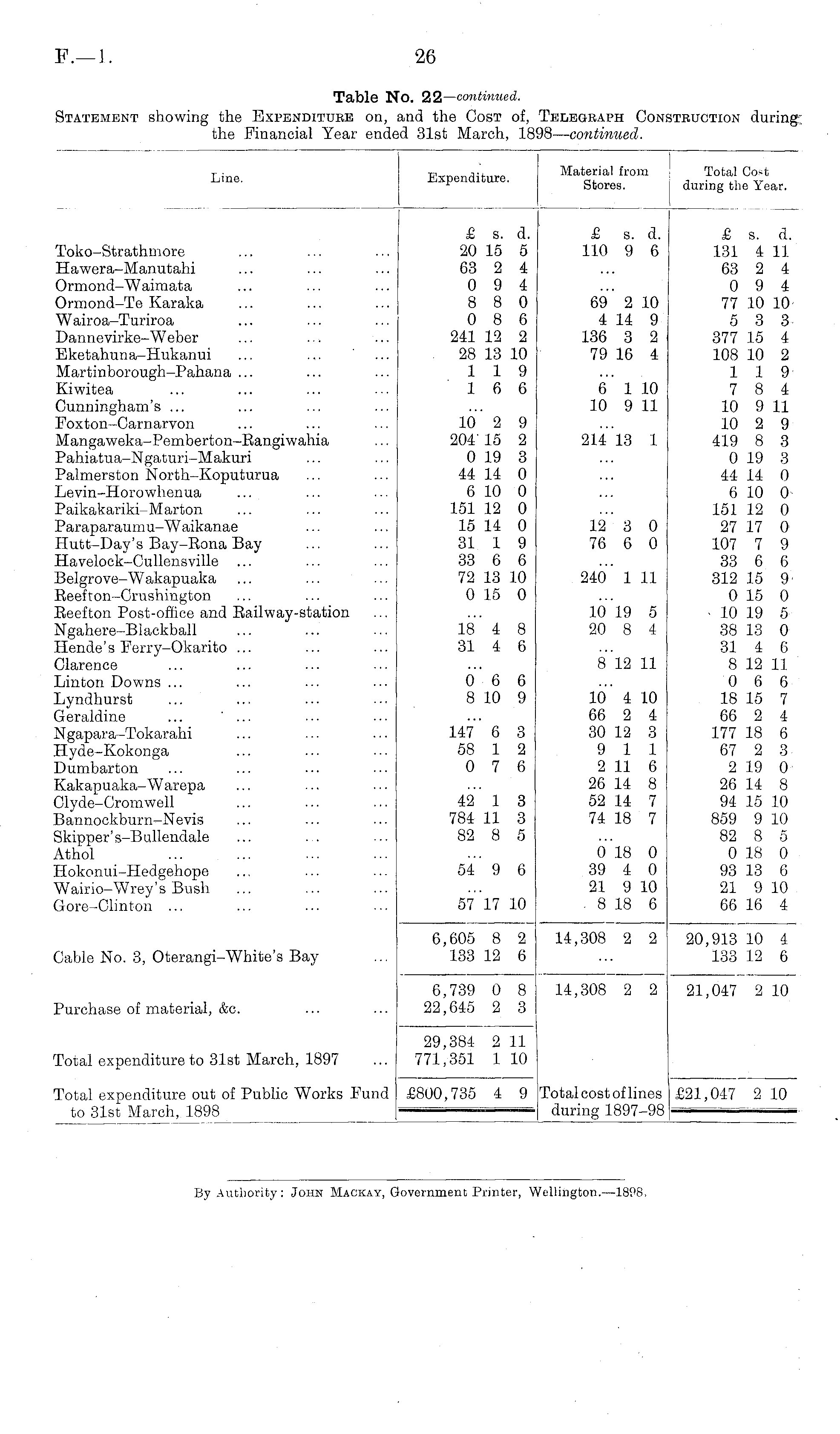 Line. Expenditure. .aterial from Stores. Total Cot during the Year. Toko-Strathmore Hawera-Manutahi Ormond-Waimata Ormond-Te Karaka Wairoa-Turiroa Dannevirke-Weber Eketahuna-Hukanui Martinborough-Pahana ... Kiwitea Cunningham's ... Foxton-Carnarvon Mangaweka-Pemberton-Bangiwahia Pahiatua-Ngaturi-Makuri Palmerston North-Koputurua Le vin-Horowhen ua Paikakariki-Marton Paraparaumu-Waikanae Hutt-Day's Bay-Rona Bay Havelock-Cullensville Belgrove-Wakapuaka Eeefton-Crushington Beef ton Post-office and Bailway-station Ngahere-Blackball Hende's Ferry-Okarito ... Clarence Linton Downs ... Lyndhurst Geraldine ... ... Ngapara-Tokarahi Hyde-Kokonga Dumbarton Kakapuaka-Warepa Clyde-Cromwell Bannockburn-Nevis Skipper' s-B ullendale Athol Hokonui-Hedgehope Wairio-Wrey's Bush Gore-Clinton ... £ S. d. 20 15 5 63 2 4 0 9 4 8 8 0 0 8 6 241 12 2 28 13 10 119 16 6 10 2 9 204' 15 2 0 19 3 44 14 0 6 10 0 151 12 0 15 14 0 31 1 9 33 6 6 72 13 10 0 15 0 £ s. d. 110 9 6 69 2 10 4 14 9 136 3 2 79 16 4 6 1 10 10 9 11 214 13 1 12" 3 0 76 6 0 240 1 11 £ s. d. 131 4 11 63 2 4 0 9 4 77 10 10 5 3 3 377 15 4 108 10 2 119 7 8 4 10 9 11 10 2 9 419 8 8 0 19 3 44 14 0 6 10 0 151 12 0 27 17 0 107 7 9 33 6 6 312 15 9 0 15 0 10 19 5 38 13 0 31 4 6 8 12 11 0 6 6 18 15 7 66 2 4 177 18 6 67 2 3 2 19 0 26 14 8 94 15 10 859 9 10 82 8 5 0 18 0 93 13 6 21 9 10 66 16 4 Iβ" 4 8 31 4 6 10 19 5 20 8 4 8 12 11 0 6 6 8 10 9 10 4 10 66 2 4 30 12 3 9 11 2 11 6 26 14 8 52 14 7 74 18 7 147 6 3 58 1 2 0 7 6 42 1 3 784 11 3 82 8 5 54 9 6 0 18 0 39 4 0 21 9 10 . 8 18 6 57 17 10 Cable No. 3, Oterangi-White's Bay 6,605 8 133 12 2 6 14,308 2 2 20,913 10 133 12 4 6 Purchase of material, &c. 6,739 22,645 0 2 8 3 14,308 2 2 21,047 2 10 Total expenditure to 31st March, 1897 29,384 771,351 2 11 1 10 Total cost of lines during 1897-98 Total expenditure out of Public Works Fund to 31st March, 1898 £800,735 4 9 £21,047 2 10