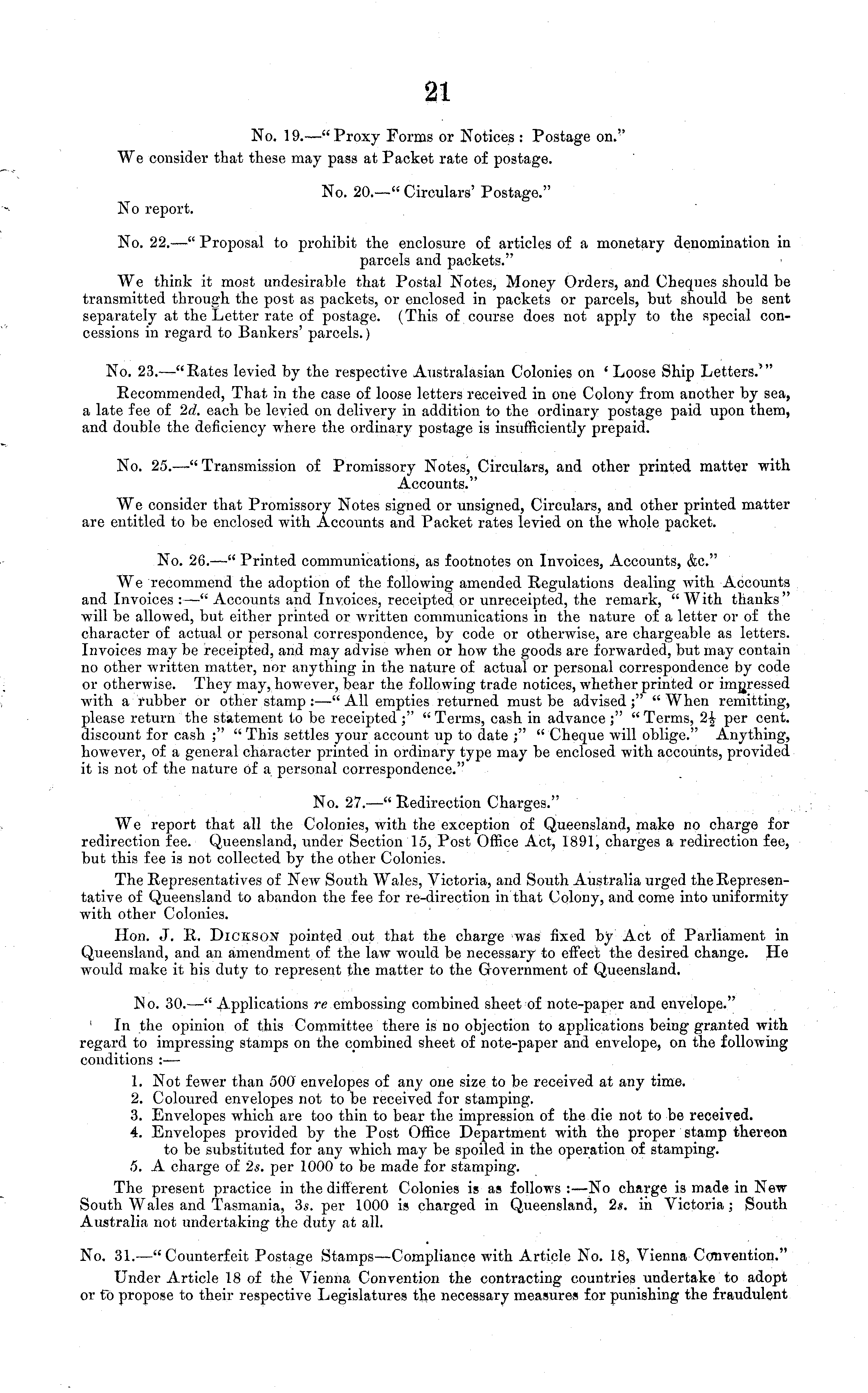 No. 19.—"Proxy Forms or Notices : Postage on." We consider that these may pass at Packet rate of postage. No. 20.—" Circulars' Postage." No report. No. 22. —" Proposal to prohibit the enclosure of articles of a monetary denomination in parcels and packets." We think it most undesirable that Postal Notes, Money Orders, and Cheques should be transmitted through the post as packets, or enclosed in packets or parcels, but should be sent separately at the Letter rate of postage. (This of course does not apply to the special concessions in regard to Bankers' parcels.) No. 23. —"Rates levied by the respective Australasian Colonies on ' Loose Ship Letters.'" Recommended, That in the case of loose letters received in one Colony from another by sea, a late fee of 2c?. each be levied on delivery in addition to the ordinary postage paid upon them, and double the deficiency where the ordinary postage is insufficiently prepaid. No. 25.—" Transmission of Promissory Notes, Circulars, and other printed matter with Accounts." We consider that Promissory Notes signed or unsigned, Circulars, and other printed matter are entitled to be enclosed with Accounts and Packet rates levied on the whole packet. No. 26.—" Printed communications, as footnotes on Invoices, Accounts, &c." We recommend the adoption of the following amended Regulations dealing with Accounts and Invoices : —" Accounts and Invoices, receipted or unreceipted, the remark, "With thanks" will be allowed, but either printed or written communications in the nature of a letter or of the character of actual or personal correspondence, by code or otherwise, are chargeable as letters. Invoices may be receipted, and may advise when or how the goods are forwarded, but may contain no other written matter, nor anything in the nature of actual or personal correspondence by code or otherwise. They may, how r ever, bear the following trade notices, whether printed or impressed with a rubber or other stamp :—" All empties returned must be advised;" "When remitting, please return the statement to be receipted •" " Terms, cash in advance ;" " Terms, 2\ per cent, discount for cash ;" " This settles your account up to date ;" " Cheque will oblige." Anything, however, of a general character printed in ordinary type may be enclosed with accounts, provided it is not of the nature of a personal correspondence." No. 27.—" Redirection Charges." We report that all the Colonies, with the exception of Queensland, make no charge for redirection fee. Queensland, under Section 15, Post Office Act, 1891, charges a redirection fee, but this fee is not collected by the other Colonies. The Representatives of New South Wales, Victoria, and South Australia urged the Representative of Queensland to abandon the fee for re-direction in that Colony, and come into uniformity with other Colonies. Hon. J. R. Dickson pointed out that the charge was fixed by Act of Parliament in Queensland, and an amendment of the law would be necessary to effect the desired change. He w r ould make it his duty to represent the matter to the Government of Queensland. No. 30. —" Applications re embossing combined sheet of note-paper and envelope." In the opinion of this Committee there is no objection to applications being granted with regard to impressing stamps on the combined sheet of note-paper and envelope, on the following conditions :—- --1. Not fewer than 500 envelopes of any one size to be received at any time. 2. Coloured envelopes not to be received for stamping. 3. Envelopes which are too thin to bear the impression of the die not to be received. 4. Envelopes provided by the Post Office Department with the proper stamp thereon to be substituted for any which may be spoiled in the operation of stamping. 5. A charge of 2*. per 1000 to be made for stamping. The present practice in the different Colonies is as follows :—No charge is made in New South Wales and Tasmania, 3s. per 1000 is charged in Queensland, 2s. in Victoria * South Australia not undertaking the duty at all. No. 31. —"Counterfeit Postage Stamps—Compliance with Article No. 18, Vienna Convention." Under Article 18 of the Vienna Convention the contracting countries undertake to adopt or to propose to their respective Legislatures the necessary measures for punishing the fraudulent
