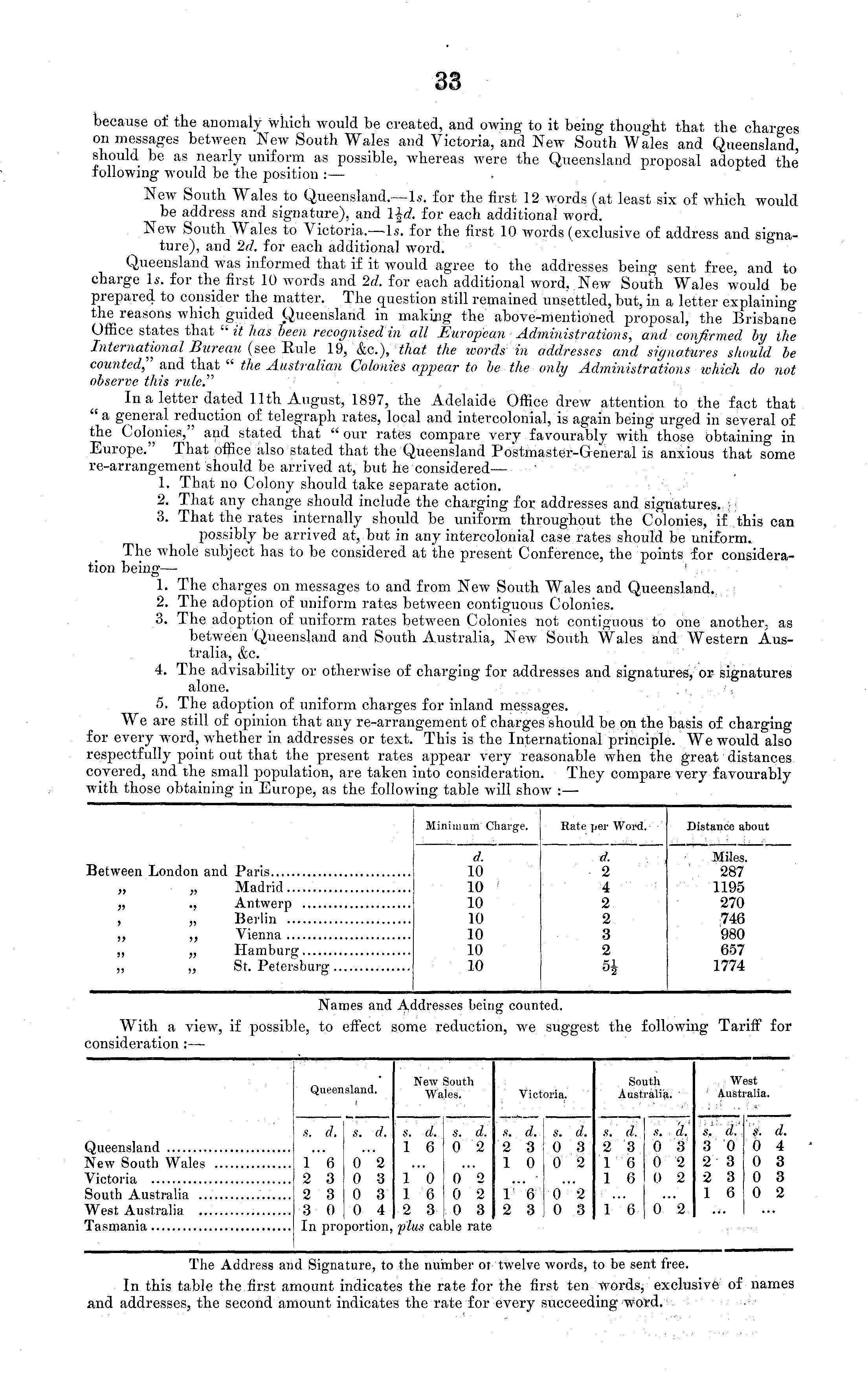 because of the anomaly Which would be created, and owing to it being thought that the charges on messages between New South Wales and Victoria, and New South Wales and Queensland, should, be as nearly uniform as possible, whereas were the Queensland proposal adopted the' following would be the position :— New South Wales to Queensland.—l.v. for the first 12 words (at least six of which would be address and signature), and lie?, for each additional word. New South Wales to Victoria.—ls. for the first 10 words (exclusive of address and signature), and 2d. for each additional word. Queensland was informed that if it would agree to the addresses being sent free, and to charge I*. for the first 10 words and 2d. for each additional word. New South Wales would be prepared to consider the matter. The question still remained unsettled, but, in a letter explaining the reasons wdiich guided Queensland in making the above-mentioned proposal, the Brisbane Office states that " it has been recognised in all European Administrations, and confirmed by the International Bureau (see Rule 19, &c), that the words in addresses and six/natures should be counted" and that " the Australian Colonies appear to be the only Administrations which do not observe this rule." In a letter dated 11th August, 1897, the Adelaide Office drew attention to the fact that " a general reduction of telegraph rates, local and intercolonial, is again being urged in several of the Colonies," and stated that " our rates compare very favourably with those obtaining in Europe." That office also stated that the Queensland Postmaster-General is anxious that some re-arrangement should be arrived at, but he considered— 1. That no Colony should take separate action. 2. That any change should include the charging for addresses and signatures. 3. That the rates internally should be uniform throughout the Colonies, if this can possibly be arrived at, but in any intercolonial case rates should be uniform. The whole subject has to be considered at the present Conference, the points for consideration being— 1. The charges on messages to and from New South Wales and Queensland. 2. The adoption of uniform rates between contiguous Colonies. 3. The adoption of uniform rates between Colonies not contiguous to one another, as between Queensland and South Australia, New South Wales and Western Australia, &c. 4. The advisability or otherwise of charging for addresses and signatures, or signatures alone. 5. The adoption of uniform charges for inland messages. We are still of opinion that any re-arrangement of charges should be on the basis of charging for every word, whether in addresses or text. This is the International principle. We would also respectfully point out that the present rates appear very reasonable when the great distances covered, and the small population, are taken into consideration. They compare very favourably with those obtaining in Europe, as the following table will show : —