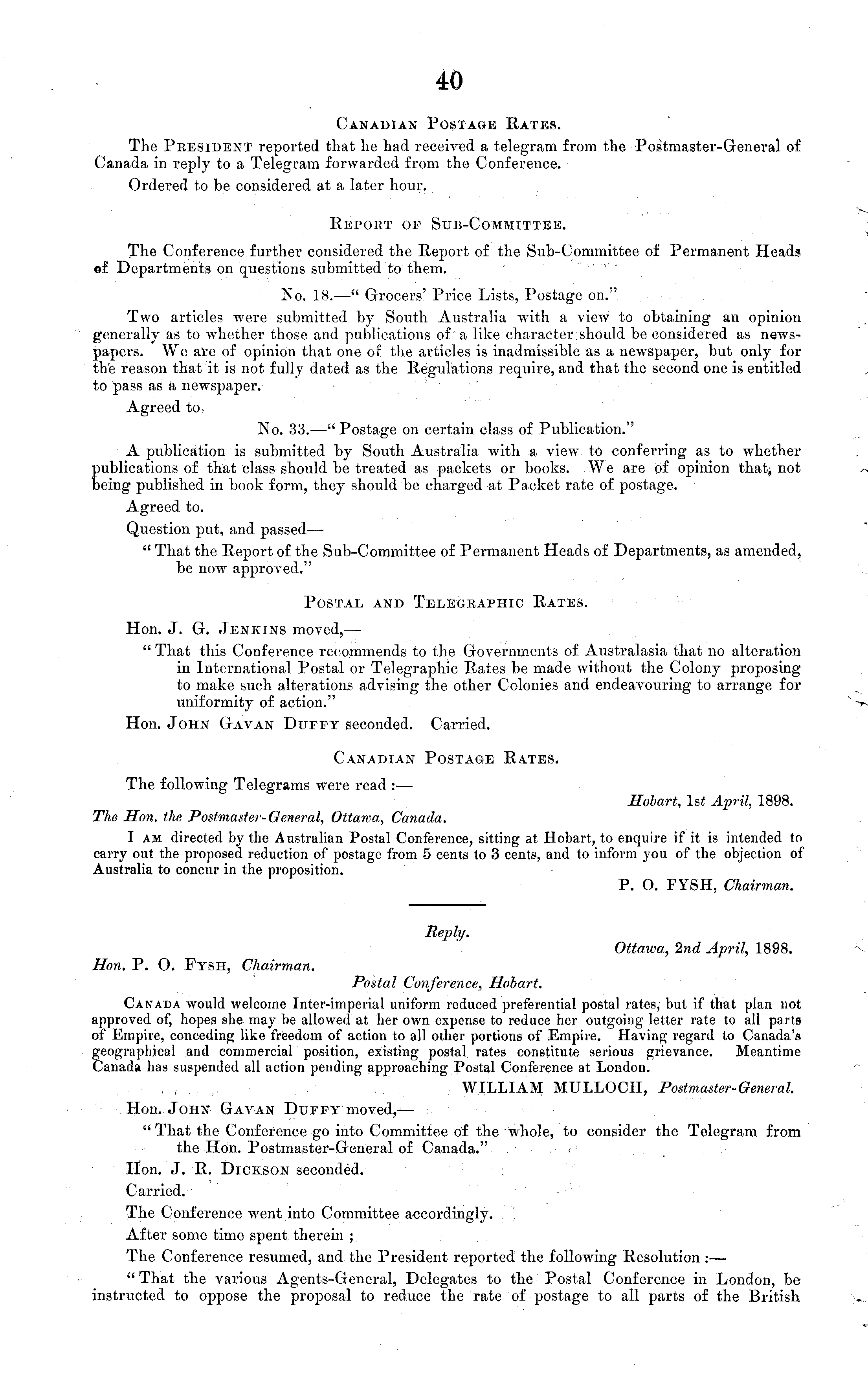 Reply. Ottawa, 2nd April, 1898. Hon. P. O. Fysh, Chairman. Postal Conference, Hobart. Canada would welcome Inter-imperial uniform reduced preferential postal rates, but if that plan not approved of, hopes she may be allowed at her own expense to reduce her outgoing letter rate to all parts of Empire, conceding like freedom of action to all other portions of Empire. Having regard to Canada's geographical and commercial position, existing postal rates constitute serious grievance. Meantime Canada has suspended all action pending approaching Postal Conference at London. WILLIAM MULLOCH, Postmaster-General. Hon. John Gavan Duffy moved, — "That the Conference go into Committee of the whole, to consider the Telegram from the Hon. Postmaster-General of Canada." Hon. J. R. Dickson seconded. Carried. The Conference went into Committee accordingly. After some time spent therein ; The Conference resumed, and the President reported the following Resolution : — "That the various Agents-General, Delegates to the Postal Conference in London, be instructed to oppose the proposal to reduce the rate of postage to all parts of the British