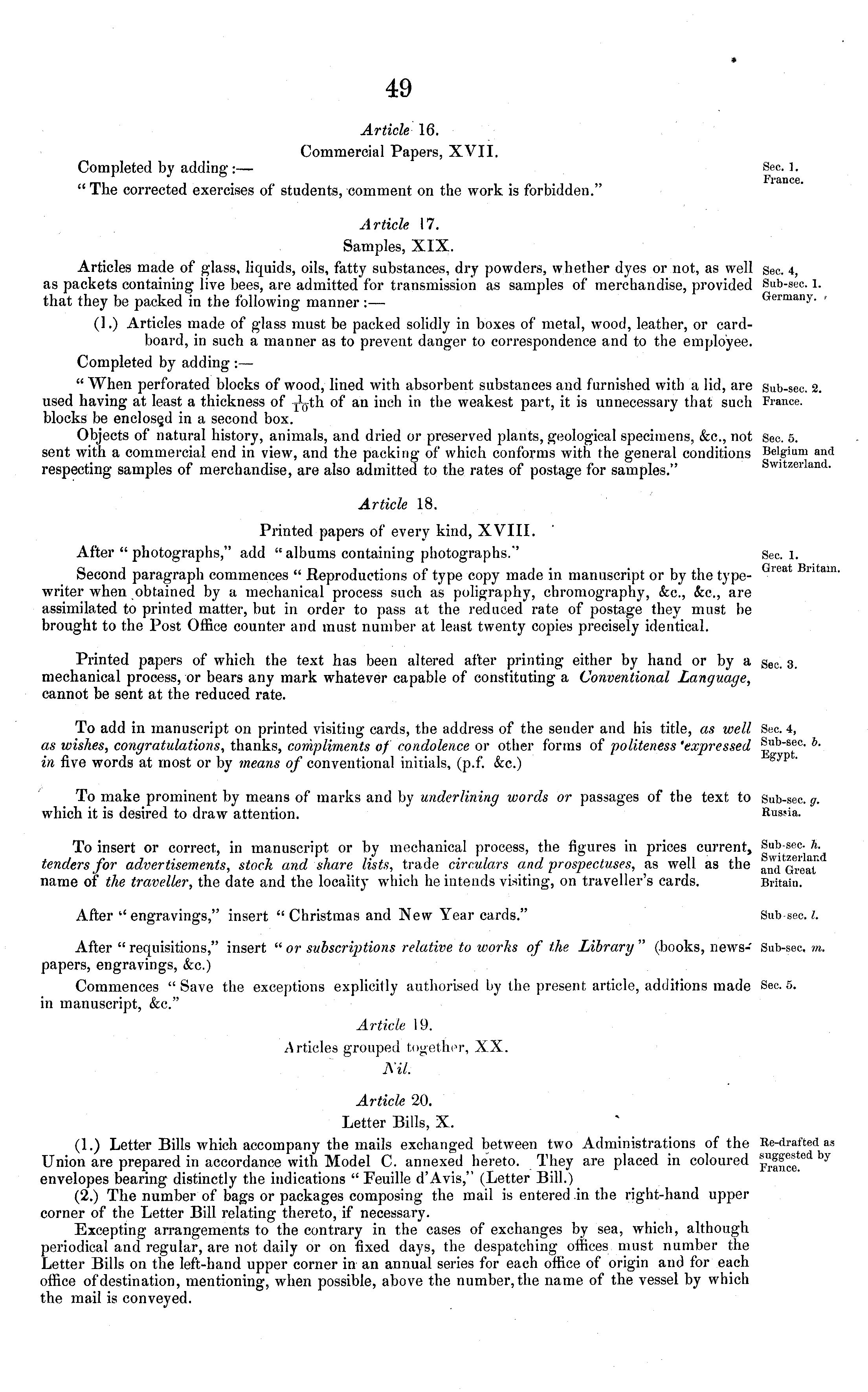Article 16. Commercial Papers, XVII. Completed by adding:— " The corrected exercises of students, comment on the work is forbidden." Article 17. Samples, XIX. Articles made of glass, liquids, oils, fatty substances, dry powders, whether dyes or not, as well as packets containing live bees, are admitted for transmission as samples of merchandise, provided that they be packed in the following manner :— (1.) Articles made of glass must be packed solidly in boxes of metal, wood, leather, or cardboard, in such a manner as to prevent danger to correspondence and to the employee. Completed by adding : — " When perforated blocks of wood, lined with absorbent substances and furnished with a lid, are used having at least a thickness of xV tn 0I " an " lcn * n t,ie weakest part, it is unnecessary that such blocks be enclosed in a second box. Objects of natural history, animals, and dried or preserved plants, geological specimens, &c, not sent with a commercial end in view, and the packing of which conforms with the general conditions respecting samples of merchandise, are also admitted to the rates of postage for samples." Article 18. Printed papers of every kind, XVIII. After " photographs," add "albums containing photographs." Second paragraph commences " Reproductions of type copy made in manuscript or by the typewriter when obtained by a mechanical process such as poligraphy, chromography, &c, &c, are assimilated to printed matter, but in order to pass at the reduced rate of postage they must be brought to the Post Office counter and must number at least twenty copies precisely identical. Printed papers of which the text has been altered after printing either by hand or by a mechanical process, or bears any mark whatever capable of constituting a Conventional Language, cannot be sent at the reduced rate. To add in manuscript on printed visiting cards, the address of the sender and his title, as well as wishes, congratulations, thanks, compliments of condolence or other forms of politeness 'expressed in five words at most or by means of conventional initials, (p.f. &c.) To make prominent by means of marks and by underlining words or passages of the text to which it is desired to draw attention. To insert or correct, in manuscript or by mechanical process, the figures in prices current, tenders for advertisements, stock and share lists, trade circulars and prospectuses, as well as the name of the traveller, the date and the locality wdiich he intends visiting, on traveller's cards. After " engravings," insert " Christmas and New Year cards." After " requisitions," insert "or subscriptions relative to works of the Library " (books, newspapers, engravings, &c.) Commences " Save the exceptions explicitly authorised by the present article, additions made in manuscript, &c." Article 19. Articles grouped together, XX. Nil. Article 20. Letter Bills, X. (1.) Letter Bills which accompany the mails exchanged between two Administrations of the Union are prepared in accordance with Model C. annexed hereto. They are placed in coloured envelopes bearing distinctly the indications " Feuille d'Avis," (Letter Bill.) (2.) The number of bags or packages composing the mail is entered in the right-hand upper corner of the Letter Bill relating thereto, if necessary. Excepting arrangements to the contrary in the cases of exchanges by sea, which, although periodical and regular, are not daily or on fixed days, the despatching offices must number the Letter Bills on the left-hand upper corner in an annual series for each office of origin and for each office of destination, mentioning, when possible, above the number, the name of the vessel by which the mail is conveyed.