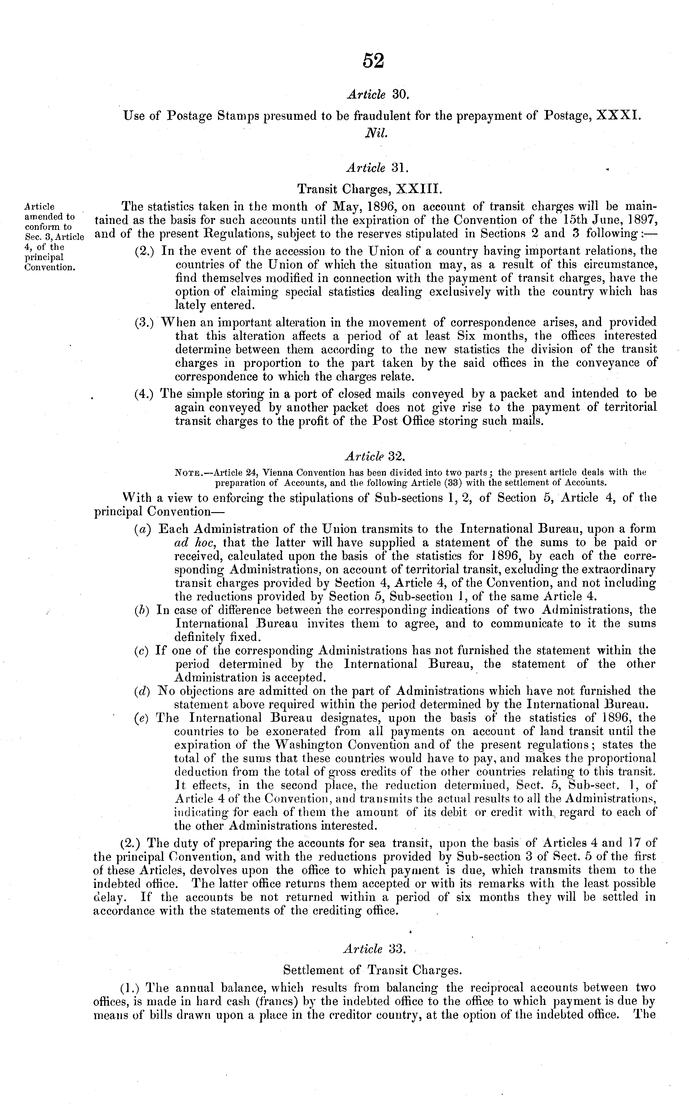 Article 30. Use of Postage Stamps presumed to be fraudulent for the prepayment of Postage, XXXI. Nil. Article 31. Transit Charges, XXIII. The statistics taken in the month of May, 1896, on account of transit charges will be maintained as the basis for such accounts until the expiration of the Convention of the 15th June, 1897, and of the present Regulations, subject to the reserves stipulated in Sections 2 and 3 following:— (2.) In the event of the accession to the Union of a country having important relations, the countries of the Union of which the situation may, as a result of this circumstance, find themselves modified in connection with the payment of transit charges, have the option of claiming special statistics dealing exclusively with the country which has lately entered. (3.) When an important alteration in the movement of correspondence arises, and provided that this alteration affects a period of at least Six months, the offices interested determine between them according to the new statistics the division of the transit charges in proportion to the part taken by the said offices in the conveyance of correspondence to which the charges relate. (4.) The simple storing in a port of closed mails conveyed by a packet and intended to be again conveyed by another packet does not give rise to the payment of territorial transit charges to the profit of the Post Office storing such mails. Article 32. Note.—Article 24, Vienna Convention has been divided into two parts; the present article deals with the preparation of Accounts, and the following Article (33) with the settlement of Accounts. With a view to enforcing the stipulations of Sub-sections 1, 2, of Section 5, Article 4, of the principal Convention— (a) Each Administration of the Union transmits to the International Bureau, upon a form ad hoc, that the latter will have supplied a statement of the sums to be paid or received, calculated upon the basis of the statistics for 1896, by each of the corresponding Administrations, on account of territorial transit, excluding the extraordinary transit charges provided by Section 4, Article 4, of the Convention, and not including the reductions provided by Section 5, Sub-section 1, of the same Article 4. (b) In case of difference between the corresponding indications of two Administrations, the International Bureau invites them to agree, and to communicate to it the sums definitely fixed. (c) If one of the corresponding Administrations has not furnished the statement within the period determined by the International Bureau, the statement of the other Administration is accepted. (d) No objections are admitted on the part of Administrations which have not furnished the statement above required within the period determined by the International Bureau. (c) The International Bureau designates, upon the basis of the statistics of 1896, the countries to be exonerated from all payments on account of land transit until the expiration of the Washington Convention and of the present regulations; states the total of the sums that these countries would have to pay, and makes the proportional deduction from the total of gross credits of the other countries relating to this transit. It effects, in the second place, the reduction determined, Sect. 5, Sub-sect. 1, of Article 4 of the Convention, and transmits the actual results to all the Administrations, indicating for each of them the amount of its debit or credit with regard to each of the other Administrations interested. (2.) The duty of preparing the accounts for sea transit, upon the basis of Articles 4 and 17 of the principal Convention, and with the reductions provided by Sub-section 3 of Sect. 5 of the first of these Articles, devolves upon the office to which payment is due, which transmits them to the indebted office. The latter office returns them accepted or with its remarks with the least possible delay. If the accounts be not returned within a period of six months they will be settled in accordance with the statements of the crediting office. Article 33. Settlement of Transit Charges. (1.) The annual balance, which results from balancing the reciprocal accounts between two offices, is made in hard cash (francs) by the indebted office to the office to which payment is due by means of bills drawn upon a place in the creditor country, at the option of the indebted office. The