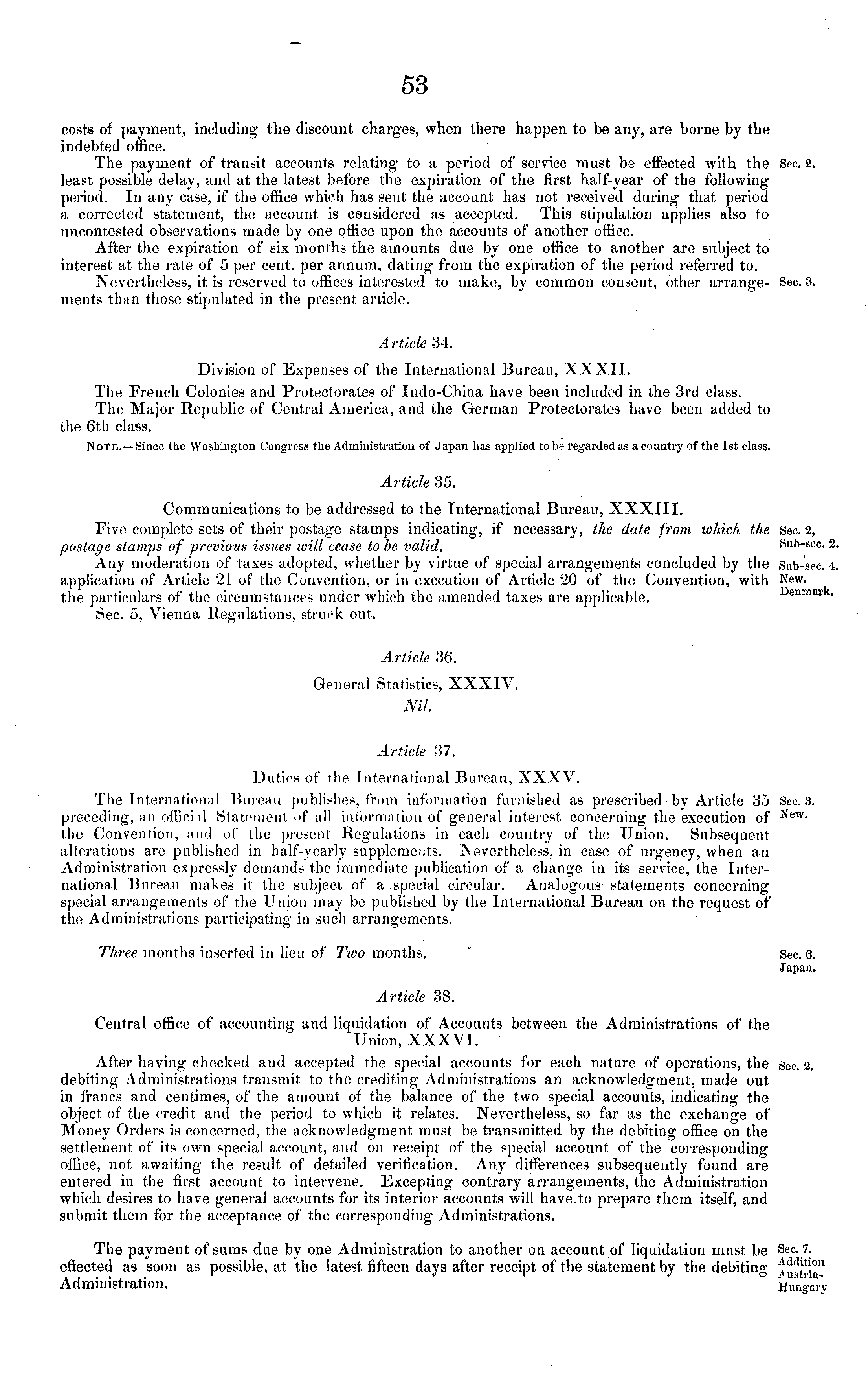 costs of payment, including the discount charges, when there happen to be any, are borne by the indebted office. The payment of transit accounts relating to a period of service must be effected with the least possible delay, and at the latest before the expiration of the first half-year of the following period. In any case, if the office which has sent the account has not received during that period a corrected statement, the account is considered as accepted. This stipulation applies also to uncontested observations made by one office upon the accounts of another office. After the expiration of six months the amounts due by one office to another are subject to interest at the rate of 5 per cent, per annum, dating from the expiration of the period referred to. Nevertheless, it is reserved to offices interested to make, by common consent, other arrangements than those stipulated in the present article. Article 34. Division of Expenses of the International Bureau, XXXII. The French Colonies and Protectorates of Indo-China have been included in the 3rd class. The Major Republic of Central America, and the German Protectorates have been added to the 6th class. Note.—Since the Washington Congress the Administration of Japan has applied to be regarded as a country of the Ist class. Article 35. Communications to be addressed to Ihe International Bureau, XXXIII. Five complete sets of their postage stamps indicating, if necessary, the date from which the postage stamps of previous issues will cease to be valid. Any moderation of taxes adopted, whether by virtue of special arrangements concluded by the application of Article 21 of the Convention, or in execution of Article 20 of the Convention, with the particulars of the circumstances under which the amended taxes are applicable. Sec. 5, Vienna Regulations, struck out. Article 36. General Statistics, XXXIV. Nil. Article 37. Duties of the International Bureau, XXXV. The International Bureau publishes, from information furnished as prescribed -by Article 35 preceding, an offici il Statement of all information of general interest concerning the execution of the Convention, and of the present Regulations in each country of the Union. Subsequent alterations are published in half-yearly supplements. Nevertheless, in case of urgency, when an Administration expressly demands the immediate publication of a change in its service, the International Bureau makes it the subject of a special circular. Analogous statements concerning special arrangements of the Union may be published by the International Bureau on the request of the Administrations participating in such arrangements. Three months inserted in lieu of Two months. Article 38. Central office of accounting and liquidation of Accounts between the Administrations of the Union, XXXVI. After having checked and accepted the special accounts for each nature of operations, the debiting Administrations transmit to the crediting Administrations an acknowdedgment, made out in francs and centimes, of the amount of the balance of the two special accounts, indicating the object of the credit and the period to which it relates. Nevertheless, so far as the exchange of Money Orders is concerned, the acknowledgment must be transmitted by the debiting office on the settlement of its own special account, and on receipt of the special account of the corresponding office, not awaiting the result of detailed verification. Any differences subsequently found are entered in the first account to intervene. Excepting contrary arrangements, the Administration which desires to have general accounts for its interior accounts will have.to prepare them itself, and submit them for the acceptance of the corresponding Administrations. The payment of sums due by one Administration to another on account of liquidation must be effected as soon as possible, at the latest fifteen days after receipt of the statement by the debiting Administration.