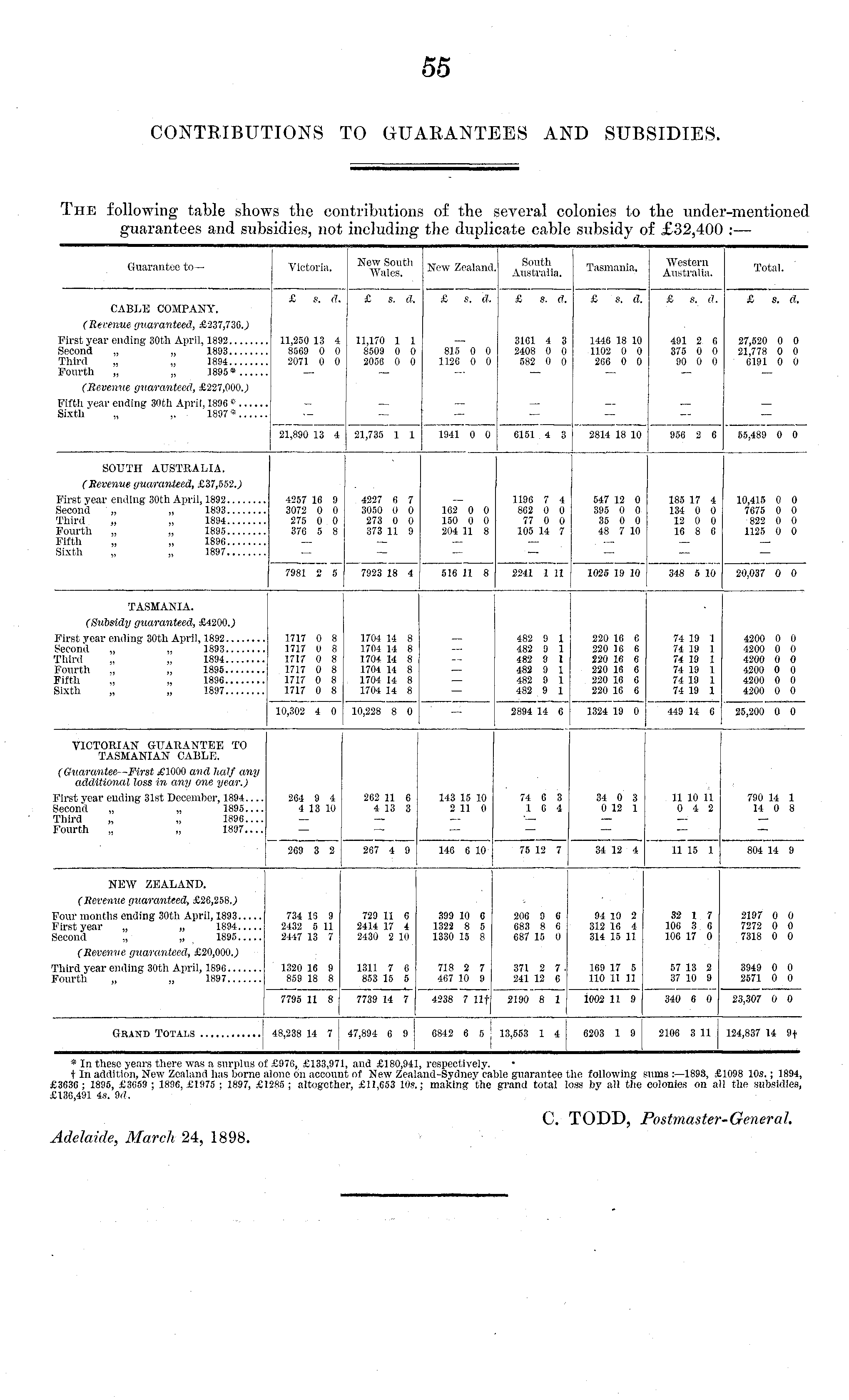 The following table shows the contributions of the several colonies to the under-mentioned guarantees and subsidies, not including the duplicate cable subsidy of £32,400: —