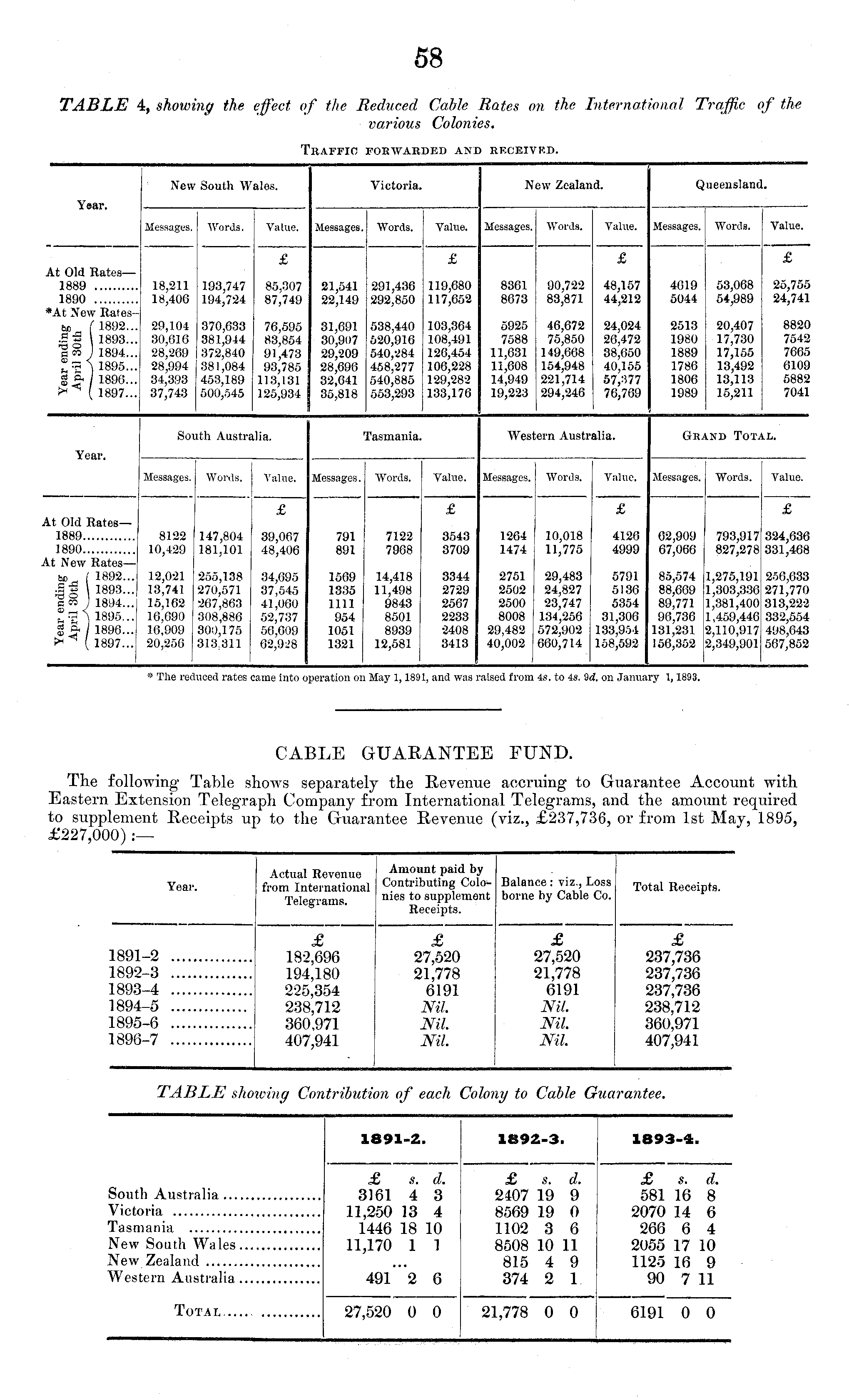 Year. Actual Revenue from International Telegrams. Amount paid by Contributing Colonies to supplement Receipts. Balance: viz., Loss borne by Cable Co. Total Receipts. 891-2 .892-3 893-4 894-5 895-6 896-7 £ 18*2,696 194,180 2*25,354 238,712 360,971 407,941 £ 27,520 21,778 6191 Nil. Nil. Nil. £ 27,520 21,778 6191 Nil. Nil. Nil. £ 237,736 237,736 237,736 238,712 360,971 407,941