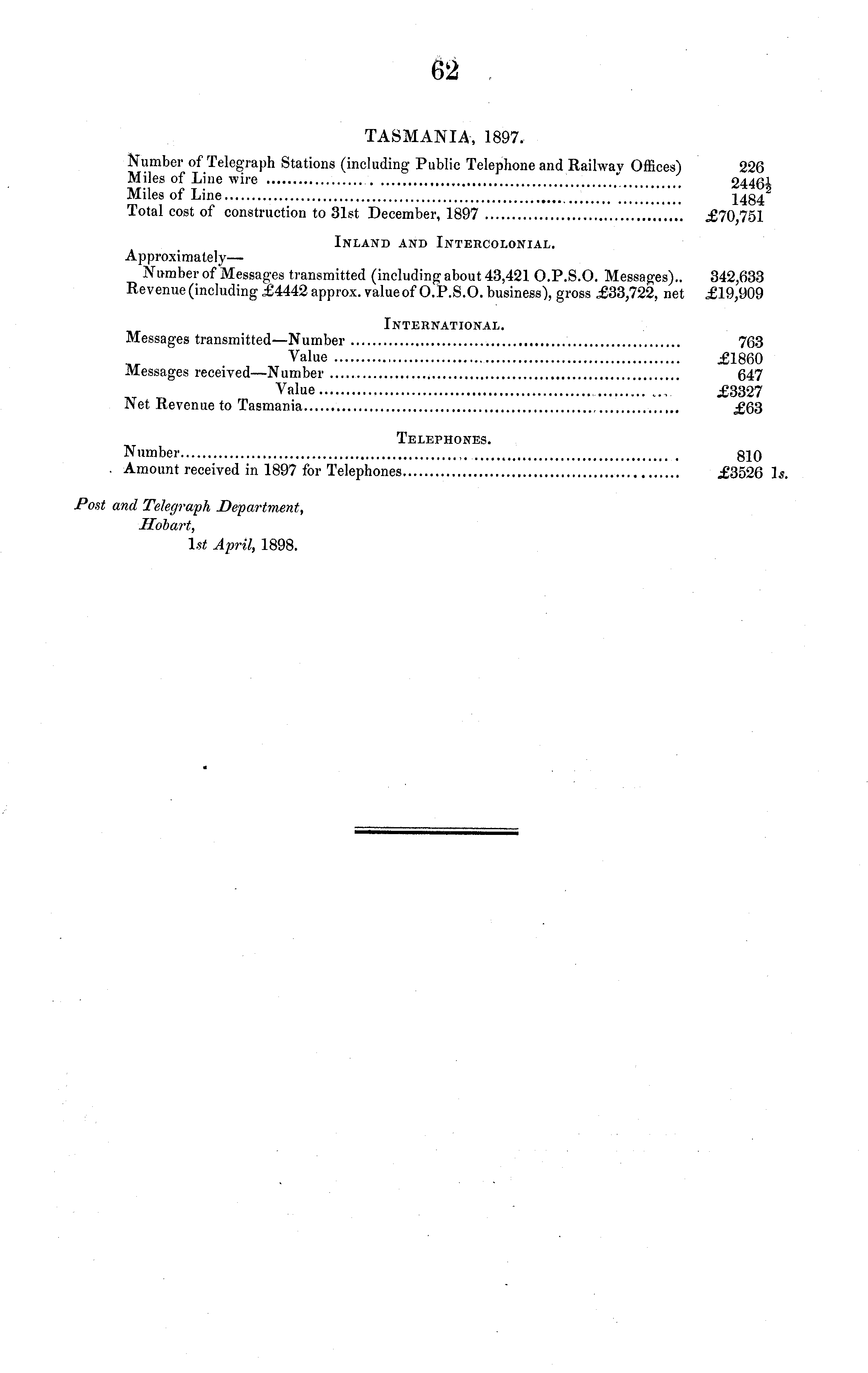 TASMANIA, 1897. Number of Telegraph Stations (including Public Telephone and Railway Offices) 226 Miles of Line wire ~ 2446 i Miles of Line 1484 Total cost of construction to 31st December, 1897 £70 751 Inland and Intercolonial. Approximately— Number of Messages transmitted (including about 43,421 0.P.5.0. Messages).. 342,633 Revenue (including £4442 approx. valueof 0.P.5.0. business), gross £33,722, net £19,909 International. Messages transmitted—Number 763 Value £1860 Messages received—Number 647 AT n Value £3327 Net Revenue to Tasmania £63 Telephones. Number ~ ( §10 Amount received in 1897 for Telephones £3526 Is. Post and Telegraph Department, Hobart, Ist April, 1898.