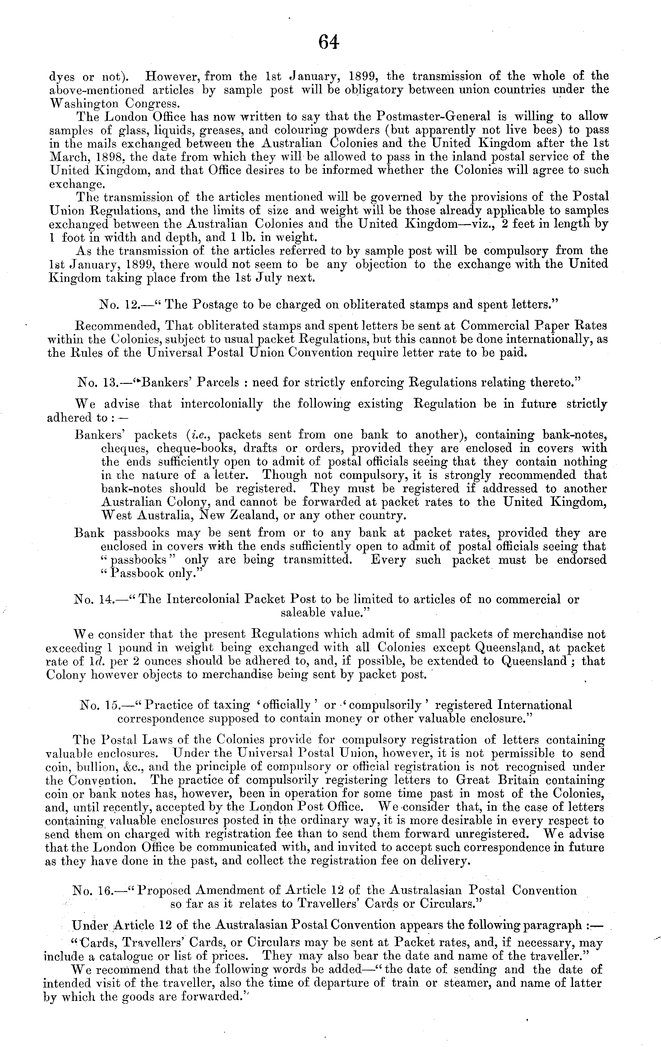 dyes or not). However, from the Ist January, 1899, the transmission of the whole of the above-mentioned articles by sample post will he obligatory between union countries under the Washington Congress. The London Office has now written to say that the Postmaster-General is willing to allow samples of glass, liquids, greases, and colouring powders (but apparently not live bees) to pass in the mails exchanged between the Australian Colonies and the United Kingdom after the Ist March, 1898, the date from which they will be allowed to pass in the inland postal service of the United Kingdom, and that Office desires to be informed whether the Colonies will agree to such exchange. The transmission of the articles mentioned wall be governed by the provisions of the Postal Union Regulations, and the limits of size and weight will be those already applicable to samples exchanged between the Australian Colonies and the United Kingdom—viz., 2 feet in length by 1 foot in width and depth, and 1 lb. in weight. As the transmission of the articles referred to by sample post will be compulsory from the Ist January, 1899, there would not seem to be any objection to the exchange with the United Kingdom taking place from the Ist July next. No. 12. —" The Postage to be charged on obliterated stamps and spent letters." Recommended, That obliterated stamps and spent letters be sent at Commercial Paper Rates within the Colonies, subject to usual packet Regulations, but this cannot be done internationally, as the Rules of the Universal Postal Union Convention require letter rate to be paid. No. 13. —""Bankers' Parcels : need for strictly enforcing Regulations relating thereto." We advise that intercolonially the following existing Regulation be in future strictly adhered to : — Bankers' packets {i.e., packets sent from one bank to another), containing bank-notes, cheques, cheque-books, drafts or orders, provided they are enclosed in covers with the ends sufficiently open to admit of postal officials seeing that they contain nothing in the nature of a letter. Though not compulsory, it is strongly recommended that bank-notes should be registered. They must be registered if addressed to another Australian Colony, and cannot be forw r arded at packet rates to the United Kingdom, West Australia, New Zealand, or any other country. Bank passbooks may be sent from or to any bank at packet rates, provided they are enclosed in covers with the ends sufficiently open to admit of postal officials seeing that " passbooks" only are being transmitted. Every such packet must be endorsed " Passbook only." No. 14. —" The Intercolonial Packet Post to be limited to articles of no commercial or saleable value." We consider that the present Regulations which admit of small packets of merchandise not exceeding 1 pound in weight being exchanged with all Colonies except Queensland, at packet rate of Id. per 2 ounces should be adhered to, and, if possible, be extended to Queensland ; that Colony however objects to merchandise being sent by packet post. No. 15. —" Practice of taxing 'officially' or-'compulsorily ' registered International correspondence supposed to contain money or other valuable enclosure." The Postal Laws of the Colonies provide for compulsory registration of letters containing valuable enclosures. Under the Universal Postal Union, however, it is not permissible to send coin, bullion, &c, and the principle of compulsory or official registration is not recognised under the Convention. The practice of compulsorily registering letters to Great Britain containing coin or bank notes has, however, been in operation for some time past in most of the Colonies, and, until recently, accepted by the London Post Office. We consider that, in the case of letters containing valuable enclosures posted in the ordinary way, it is more desirable in every respect to send them on charged with registration fee than to send them forward unregistered. We advise that the London Office be communicated wdth, and invited to accept such correspondence in future as they have done in the past, and collect the registration fee on delivery. No. 16. —"Proposed Amendment of Article 12 of the Australasian Postal Convention so far as it relates to Travellers' Cards or Circulars." Under Article 12 of the Australasian Postal Convention appears the following paragraph :■ — "Cards, Travellers' Cards, or Circulars may be sent at Packet rates, and, if necessary, may include a catalogue or list of prices. They may also bear the date and name of the traveller." We recommend that the following w r ords be added—"the date of sending and the date of intended visit of the traveller, also the time of departure of train or steamer, and name of latter by which the goods are forwarded."