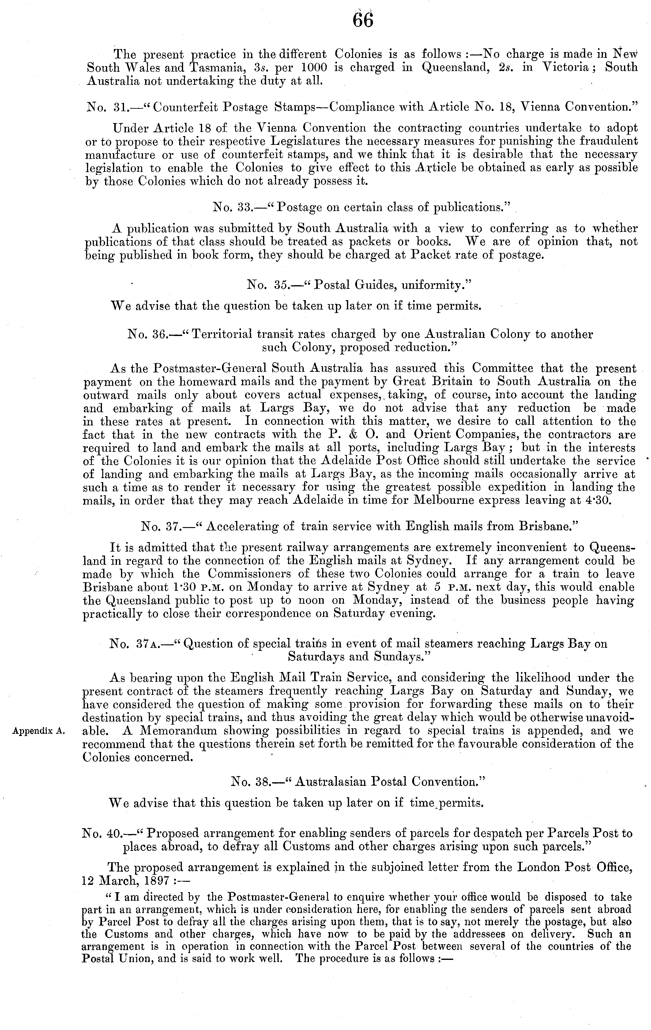 The present practice in the different Colonies is as follows :—No charge is made in NewSouth Wales and Tasmania, 3*. per 1000 is charged in Queensland, 2*. in Victoria; South Australia not undertaking the duty at all. No. 31. —"Counterfeit Postage Stamps—Compliance with Article No. 18, Vienna Convention." Under Article 18 of. the Vienna Convention the contracting countries undertake to adopt or to propose to their respective Legislatures the necessary measures for punishing the fraudulent manufacture or use of counterfeit stamps, and we think that it is desirable that the necessary legislation to enable the Colonies to give effect to this Article be obtained as early as possible by those Colonies which do not already possess it. No. 33. —" Postage on certain class of publications." A publication was submitted by South Australia with a view to conferring as to whether publications of that class should be treated as packets or books. We are of opinion that, not being published in book form, they should be charged at Packet rate of postage. No. 35. —" Postal Guides, uniformity." We advise that the question be taken up later on if time permits. No. 36.—" Territorial transit rates charged by one Australian Colony to another such Colony, proposed reduction." As the Postmaster-General South Australia has assured this Committee that the present payment on the homeward mails and the payment by Great Britain to South Australia on the outward mails only about covers actual expenses, taking, of course, into account the landing and embarking of mails at Largs Bay, we do not advise that any reduction be made in these rates at present. In connection with this matter, we desire to call attention to the fact that in the new contracts with the P. & O. and Orient Companies, the contractors are required to land and embark the mails at all ports, including Largs Bay; but in the interests of the Colonies it is our opinion that the Adelaide Post Office should still undertake the service of landing and embarking the mails at Largs Bay, as the incoming mails occasionally arrive at such a time as to render it necessary for using the greatest possible expedition in landing the mails, in order that they may reach Adelaide in time for Melbourne express leaving at 4*30. No. 37.—" Accelerating of train service with English mails from Brisbane." It is admitted that the present railway arrangements are extremely inconvenient to Queensland in regard to the connection of the English mails at Sydney. If any arrangement could be made by which the Commissioners of these two Colonies could arrange for a train to leave Brisbane about I*3o p.m. on Monday to arrive at Sydney at 5 P.M. next day, this would enable the Queensland public to post up to noon on Monday, instead of the business people having practically to close their correspondence on Saturday evening. No. 37a.—" Question of special trains in event of mail steamers reaching Largs Bay on Saturdays and Sundays." As bearing upon the English Mail Train Service, and considering the likelihood under the present contract of the steamers frequently reaching Largs Bay on Saturday and Sunday, we have considered the question of making some provision for forwarding these mails on to their destination by special trains, and thus avoiding the great delay which would be otherwise unavoidable. A Memorandum showing possibilities in regard to special trains is appended, and w r e recommend that the questions therein set forth be remitted for the favourable consideration of the Colonies concerned. No. 38.—" Australasian Postal Convention." We advise that this question be taken up later on if fime,permits. No. 40.—" Proposed arrangement for enabling senders of parcels for despatch per Parcels Post to places abroad, to defray all Customs and other charges arising upon such parcels." The proposed arrangement is explained in the subjoined letter from the London Post Office, 12 March, 1897 :— " I am directed by the Postmaster-General to enquire whether your office would be disposed to take part in an arrangement, which is under consideration here, for enabling the senders of parcels sent abroad by Parcel Post to defray all the charges arising upon them, that is to say, not merely the postage, but also the Customs and other charges, which have now to be paid by the addressees on delivery. Such an arrangement is in operation in connection with the Parcel Post between several of the countries of the Postal Union, and is said to work well. The procedure is as follows : —