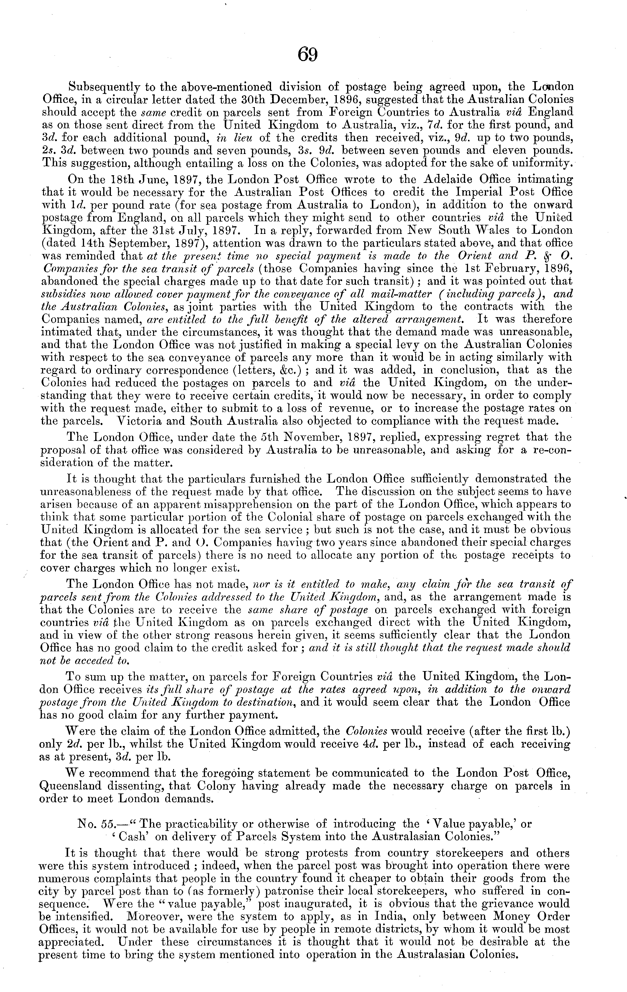 Subsequently to the above-mentioned division of postage being agreed upon, the London Office, in a circular letter dated the 30th December, 1896, suggested that the Australian Colonies should accept the same credit on parcels sent from Foreign Countries to Australia via England as on those sent direct from the United Kingdom to Australia, viz., Id. for the first pound, and 3a". for each additional pound, in lieu of the credits then received, viz., 9d. up to two pounds, 2*. 3a". between two pounds and seven pounds, 3*. 9a". between seven pounds and eleven pounds. This suggestion, although entailing a loss on the Colonies, was adopted for the sake of uniformity. On the 18th June, 1897, the London Post Office wrote to the Adelaide Office intimating that it would be necessary for the Australian Post Offices to credit the Imperial Post Office with la", per pound rate (for sea postage from Australia to London), in addition to the onward postage from England, on all parcels which they might send to other countries via the United Kingdom, after the 31st July, 1897. In a reply, forwarded from New South Wales to London (dated 14th September, 1897), attention was drawn to the particulars stated above, and that office was reminded that at the present time no special payment is made to the Orient and P. §* O. Companies for the sea transit of parcels (those Companies having since the Ist February, 1896, abandoned the special charges made up to that date for such transit); and it was pointed out that sidjsidies note allowed cover payment for the conveyance of all mail-matter ( including parcels), and the Australian Colonies, as joint parties with the United Kingdom to the contracts with the Companies named, are entitled to the full benefit of the altered arrangement. It was therefore intimated that, under the circumstances, it was thought that the demand made was unreasonable, and that the London Office was not justified in making a special levy on the Australian Colonies with respect to the sea conveyance of parcels any more than it w r ould be in acting similarly with regard to ordinary correspondence (letters, &c.) ; and it was added, in conclusion, that as the Colonies had reduced the postages on parcels to and via the United Kingdom, on the understanding that they w r ere to receive certain credits, it would now be necessary, in order to comply with the request made, either to submit to a loss of revenue, or to increase the postage rates on the parcels. Victoria and South Australia also objected to compliance with the request made. The London Office, under date the sth November, 1897, replied, expressing regret that the proposal of that office was considered by Australia to be unreasonable, and asking for a re-con-sideration of the matter. It is thought that the particulars furnished the London Office sufficiently demonstrated the unreasonableness of the request made by that office. The discussion on the subject seems to have arisen because of an apparent misapprehension on the part of the London Office, which appears to think that some particular portion of the Colonial share of postage on parcels exchanged with the United Kingdom is allocated for the sea service; but such is not the case, and it must be obvious that (the Orient and P. and O. Companies having two years since abandoned their special charges for the sea transit of parcels) there is no need to allocate any portion of the postage receipts to cover charges which no longer exist. The London Office has not made, nor is it entitled to make, any claim for the sea transit of parcels sent from the Colonies addressed to the United Kingdom, and, as the arrangement made is that the Colonies are to receive the same share of postage on parcels exchanged with foreign countries via the United Kingdom as on parcels exchanged direct with the United Kingdom, and in view of the other strong reasons herein given, it seems sufficiently clear that the London Office has no good claim to the credit asked for ; and it is still thought that the request made should not be acceded to. To sum up the matter, on parcels for Foreign Countries via the United Kingdom, the London Office receives its full sha re of postage at the rates agreed upon, in addition to the onward postage from the United Kingdom to destination, and it would seem clear that the London Office has no good claim for any further payment. Were the claim of the London Office admitted, the Colonies would receive (after the first lb.) only 2d. per lb., whilst the United Kingdom would receive 4a". per lb., instead of each receiving as at present, 3d. per lb. We recommend that the foregoing statement be communicated to the London Post Office, Queensland dissenting, that Colony having already made the necessary charge on parcels in order to meet London demands. No. 55. —" The practicability or otherwise of introducing the ' Value payable,' or ' Cash' on delivery of Parcels System into the Australasian Colonies." It is thought that there would be strong protests from country storekeepers and others were this system introduced ; indeed, when the parcel post was brought into operation there were numerous complaints that people in the country found it cheaper to obtain their goods from the city by parcel post than to fas formerly) patronise their local storekeepers, who suffered in consequence. Were the " value payable," post inaugurated, it is obvious that the grievance would be intensified. Moreover, were the system to apply, as in India, only between Money Order Offices, it would not be available for use by people in remote districts, by whom it would be most appreciated. Under these circumstances it is thought that it would not be desirable at the present time to bring the system mentioned into operation in the Australasian Colonies.