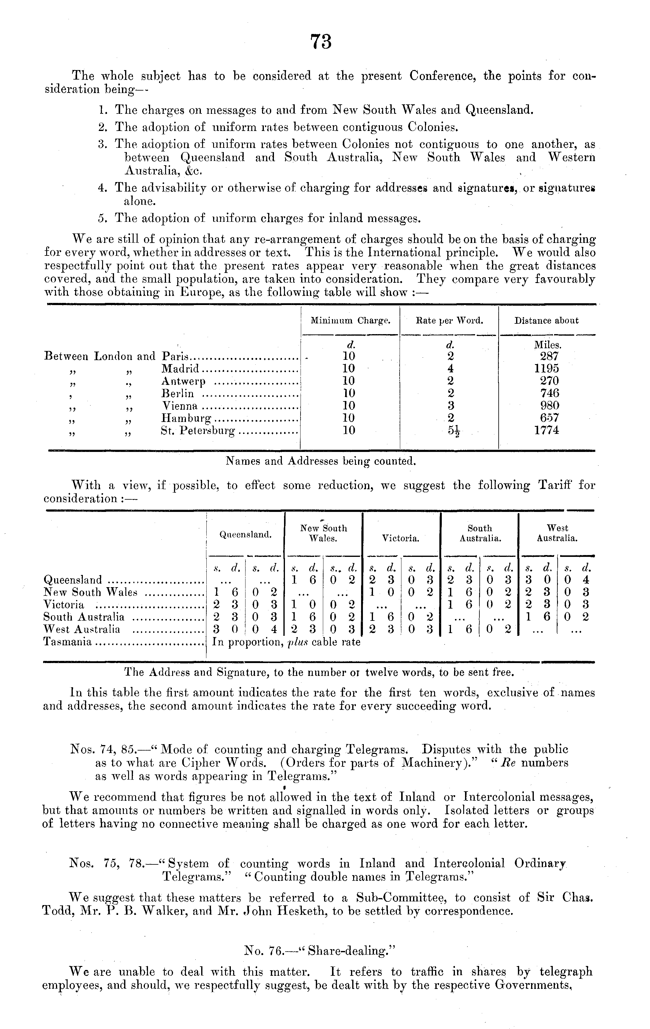 The Address and Signature, to the number ot twelve words, to be sent free. In this table the first amount indicates the rate for the first ten words, exclusive of names and addresses, the second amount indicates the rate for every succeeding word. Nos. 74, 85. —" Mode of counting and charging Telegrams. Disputes with the public as to what are Cipher Words. (Orders for parts of Machinery)." "Re numbers as well as words appearing in Telegrams." We recommend that figures be not allow-ed in the text of Inland or Intercolonial messages, but that amounts or numbers be written and signalled in words only. Isolated letters or groups of letters having no connective meaning shall be charged as one word for each letter. Nos. 75, 78. —" System of counting words in Inland and Intercolonial Ordinary Telegrams." " Counting double names in Telegrams." We suggest that these matters be referred to a Sub-Committee, to consist of Sir Chas. Todd, Mr. P. B. Walker, and Mr. John Hesketh, to be settled by correspondence. No. 76. —" Share-dealing." We are unable to deal with this matter. It refers to traffic in shares by telegraph employees, and should, we respectfully suggest, be dealt with by the respective Governments,
