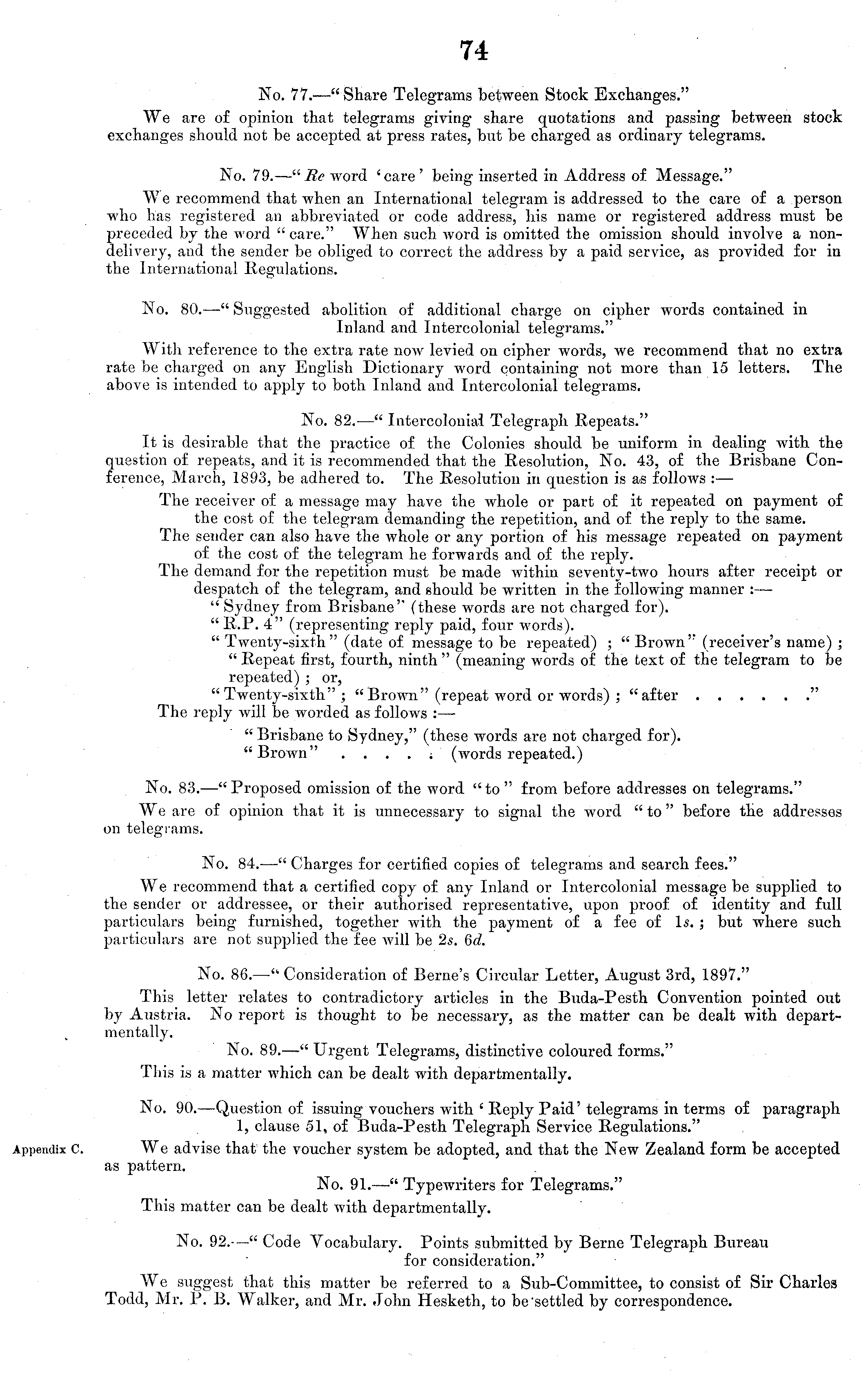 No. 77.—" Share Telegrams between Stock Exchanges." We are of opinion that telegrams giving share quotations and passing between stock exchanges should not be accepted at press rates, but be charged as ordinary telegrams. No. 79. — "Re w r ord 'care' being inserted in Address of Message." We recommend that when an International telegram is addressed to the care of a person who lias registered an abbreviated or code address, his name or registered address must be preceded by the word " care." When such word is omitted the omission should involve a nondelivery, and the sender be obliged to correct the address by a paid service, as provided for in the International Regulations. No. 80. —" Suggested abolition of additional charge on cipher words contained in Inland and Intercolonial telegrams." With reference to the extra rate now levied on cipher words, we recommend that no extra rate be charged on any English Dictionary word containing not more than 15 letters. The above is intended to apply to both Inland and Intercolonial telegrams. No. 82. —" Intercolonial Telegraph Repeats." It is desirable that the practice of the Colonies should be uniform in dealing with the question of repeats, and it is recommended that the Resolution, No. 43, of the Brisbane Conference, March, 1893, be adhered to. The Resolution in question is as follows : — The receiver of a message may have the whole or part of it repeated on payment of the cost of the telegram demanding the repetition, and of the reply to the same. The sender can also have the whole or any portion of his message repeated on payment of the cost of the telegram he forwards and of the reply. The demand for the repetition must be made within seventy-two hours after receipt or despatch of the telegram, and should be written in the following manner : — " Sydney from Brisbane" (these words are not charged for). " R.P. 4" (representing reply paid, four words). " Twenty-sixth " (date of message to be repeated) ; " Brown " (receiver's name) ; " Repeat first, fourth, ninth " (meaning words of the text of the telegram to be repeated) ; or, "Twenty-sixth"; "Brown" (repeat word or words) ; "after " The reply will be worded as follows :— " Brisbane to Sydney," (these words are not charged for). "Brown" (words repeated.) No. 83. —"Proposed omission of the word "to" from before addresses on telegrams." We are of opinion that it is unnecessary to signal the word "to " before the addresses on telegrams. No. 84. —" Charges for certified copies of telegrams and search fees." We recommend that a certified copy of any Inland or Intercolonial message be supplied to the sender or addressee, or their authorised representative, upon proof of identity and full particulars being furnished, together with the payment of a fee of I*. * but where such particulars are not supplied the fee will be 2*. 6d. No. 86. —" Consideration of Berne's Circular Letter, August 3rd, 1897." This letter relates to contradictory articles in the Buda-Pesth Convention pointed out by Austria. No report is thought to be necessary, as the matter can be dealt with departmentally. No. 89. —" Urgent Telegrams, distinctive coloured forms." This is a matter which can be dealt with departmentally. No. 90. —Question of issuing vouchers with ' Reply Paid' telegrams in terms of paragraph 1, clause 51, of Buda-Pesth Telegraph Service Regulations." We advise that the voucher system be adopted, and that the New Zealand form be accepted as pattern. No. 91. —" Typewriters for Telegrams." This matter can be dealt with departmentally. No. 92.-—" Code Vocabulary. Points submitted by Berne Telegraph Bureau for consideration." We suggest that this matter be referred to a Sub-Committee, to consist of Sir Charles Todd, Mr. P. B. Walker, and Mr. John Hesketh, to be'settled by correspondence.