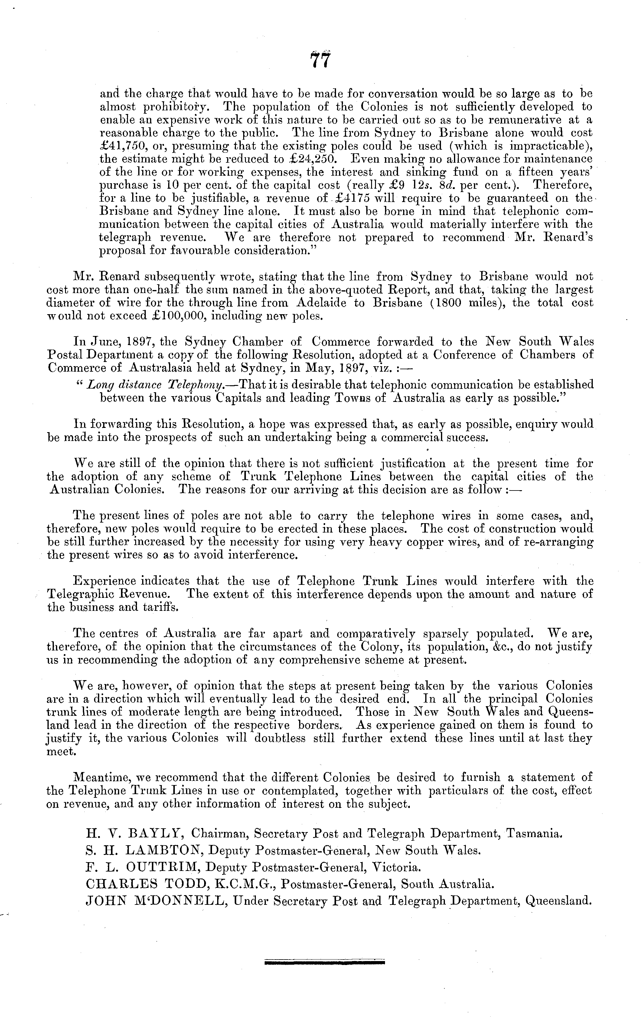 and the charge that would have to be made for conversation would be so large as to be almost prohibitory. The population of the Colonies is not sufficiently developed to enable an expensive work of this nature to be carried out so as to be remunerative at a reasonable charge to the public. The line from Sydney to Brisbane alone would cost £41,750, or, presuming that the existing poles could be used (which is impracticable), the estimate might be reduced to £24,250. Even making no allowance for maintenance of the line or for working expenses, the interest and sinking fund on a fifteen years' purchase is 10 per cent, of the capital cost (really £9 12*. 8a". per cent.). Therefore, for a line to be justifiable, a revenue of £4175 wall require to be guaranteed on the Brisbane and Sydney line alone. It must also be borne in mind that telephonic communication between the capital cities of Australia would materially interfere with the telegraph revenue. We are therefore not prepared to recommend Mr. Renard's proposal for favourable consideration." Mr. Renard subsequently wrote, stating that the line from Sydney to Brisbane would not cost more than one-half the sum named in the above-quoted Report, and that, taking the largest diameter of wire for the through line from Adelaide to Brisbane (1800 miles), the total cost would not exceed £100,000, including new poles. In June, 1897, the Sydney Chamber of Commerce forwarded to the New South Wales Postal Department a copy of the following Resolution, adopted at a Conference of Chambers of Commerce of Australasia held at Sydney, in May, 1897, viz. : — " Long distance Telephony. —That it is desirable that telephonic communication be established between the various Capitals and leading Towns of Australia as early as possible." In forwarding this Resolution, a hope was expressed that, as early as possible, enquiry would be made into the prospects of such an undertaking being a commercial success. We are still of the opinion that there is not sufficient justification at the present time for the adoption of any scheme of Trunk Telephone Lines between the capital cities of the Australian Colonies. The reasons for our arriving at this decision are as follow : — The present lines of poles are not able to carry the telephone wires in some cases, and, therefore, new poles would require to be erected in these places. The cost of construction would be still further increased by the necessity for using very heavy copper wires, and of re-arranging the present wires so as to avoid interference. Experience indicates that the use of Telephone Trunk Lines would interfere with the Telegraphic Revenue. The extent of this interference depends upon the amount and nature of the business and tariffs. The centres of Australia are far apart and comparatively sparsely populated. We are, therefore, of the opinion that the circumstances of the Colony, its population, &c, do not justify us in recommending the adoption of any comprehensive scheme at present. We are, however, of opinion that the steps at present being taken by the various Colonies are in a direction which will eventually lead to the desired end. In all the principal Colonies trunk lines of moderate length are being introduced. Those in New South Wales and Queensland lead in the direction of the respective borders. As experience gained on them is found to justify it, the various Colonies will doubtless still further extend these lines until at last they meet. Meantime, w r e recommend that the different Colonies be desired to furnish a statement of the Telephone Trunk Lines in use or contemplated, together with particulars of the cost, effect on revenue, and any other information of interest on the subject. H. V. BAYLY, Chairman, Secretary Post and Telegraph Department, Tasmania. S. H. LAMBTON, Deputy Postmaster-General, New South Wales. F. L. OUTTRIM, Deputy Postmaster-General, Victoria. CHARLES TODD, K.C.M.G., Postmaster-General, South Australia. JOHN M'DONNELL, Under Secretary Post and Telegraph Department, Queensland.