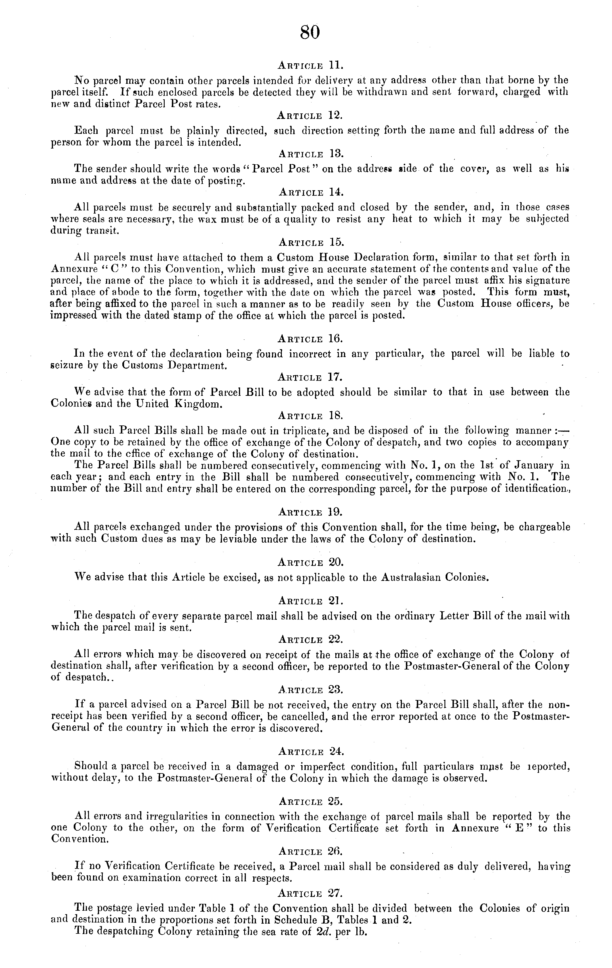 Article 11. No parcel may contain other parcels intended for delivery at any address other than that borne by the parcel itself. If such enclosed parcels be detected they will be withdrawn and sent forward, charged with new and distinct Parcel Post rates. Article 12. Each parcel must be plainly directed, such direction setting forth the name and full address of the person for whom the parcel is intended. Article 13. The sender should write the words " Parcel Post" on the address side of the cover, as well as his name and address at the date of posting. Article 14. All parcels must be securely and substantially packed and closed by the sender, and, in those cases where seals are necessary, the wax must be of a quality to resist any heat to which it may be subjected during transit. Article 15. All parcels must have attached to them a Custom House Declaration form, similar to that set forth in Annexure "C" to this Convention, which must give an accurate statement of the contents and value of the parcel, the name of the place to which it is addressed, and the sender of the parcel must affix his signature and place of abode to the form, together with the date on which the parcel was posted. This form must, after being affixed to the parcel in such a manner as to be readily seen by the Custom House officers, be impressed with the dated stamp of the office at which the parcel is posted. Article 16. In the event of the declaration being found incorrect in any particular, the parcel will be liable to seizure by the Customs Department. Article 17. We advise that the form of Parcel Bill to be adopted should be similar to that in use between the Colonies and the United Kingdom. Article 18. All such Parcel Bills shall be made out in triplicate, and be disposed of in the following manner :— One copy to be retained by the office of exchange of the Colony of despatch, and two copies to accompany the mail to the office of exchange of the Colony of destination. The Parcel Bills shall be numbered consecutively, commencing with No. 1, on the Ist. of January in each year; and each entry in the Bill shall be numbered consecutively, commencing with No. 1. The number of the Bill and entry shall be entered on the corresponding parcel, for the purpose of identification., Article 19. All parcels exchanged under the provisions of this Convention shall, for the time being, be chargeable with such Custom dues as may be leviable under the laws of the Colony of destination. Article 20. We advise that this Article be excised, as not applicable to the Australasian Colonies. Article 21. The despatch of every separate parcel mail shall be advised on the ordinary Letter Bill of the mail with which the parcel mail is sent. Article 22. All errors which may be discovered on receipt of the mails at the office of exchange of the Colony of destination shall, after verification by a second officer, be reported to the Postmaster-General of the Colony of despatch.. Article 23. If a parcel advised on a Parcel Bill be not received, the entry on the Parcel Bill shall, after the nonreceipt has been verified by a second officer, be cancelled, and the error reported at once to the PostmasterGeneral of the country in which the error is discovered. Article 24. Should a parcel be received in a damaged or imperfect condition, full particulars must be leported, without delay, to the Postmaster-General of the Colony in which the damage is observed. Article 25. All errors and irregularities in connection with the exchange of parcel mails shall be reported by the one Colony to the other, on the form of Verification Certificate set forth in Annexure " E " to this Convention. Article 26. If no Verification Certificate be received, a Parcel mail shall be considered as duly delivered, having been found on examination correct in all respects. Article 27. The postage levied under Table 1 of the Convention shall be divided between the Colonies of origin and destination in the proportions set forth in Schedule B, Tables 1 and 2. The despatching Colony retaining the sea rate of 2d. per lb.