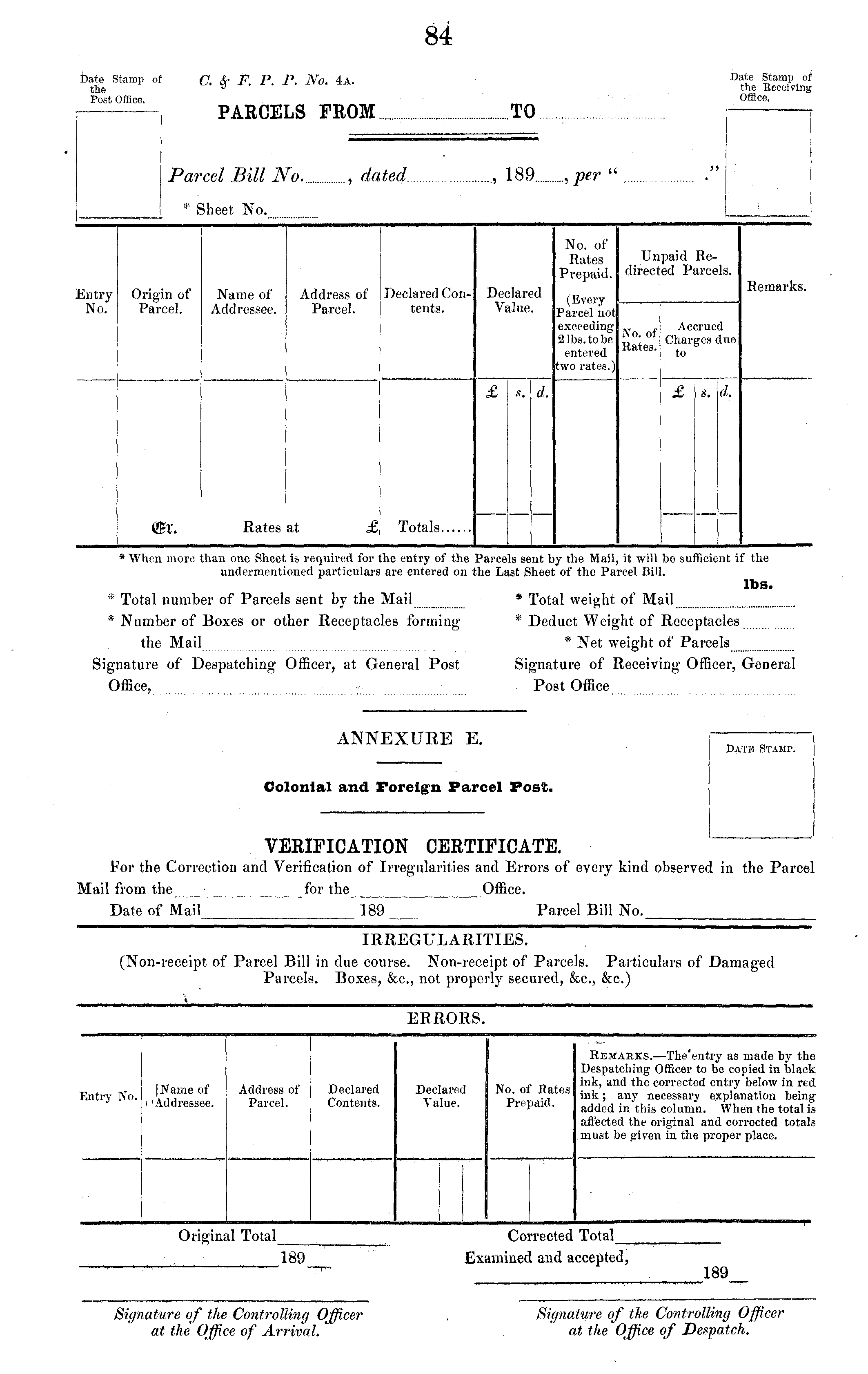 AiNNEXUKE E. Date Stamp. Colonial and Foreign Parcel Post. VERIFICATION CERTIFICATE. For the Correction and Verification of Irregularities and Errors of every kind observei in the Parcel Mail from the ■ for the Office. Date of Mail 189 Parcel Bill No. 189 _ IRREGULARITIES. (Non-receipt of Parcel Bill in due course. Non-receipt of Parcels. Particulars of Damaged Parcels. Boxes, &c, not properly secured, &c, &c.) ■ ERRORS. -p . , „ [ Name of Address of * ' i 'Addressee. Parcel. Declared Contents. Declared Value. No. of Rates Prepaid. Remarks.—The'entry as made by the Despatching Officer to be copied in black ink, and the corrected entry below in red ink; any necessary explanation being added in this column. When the total is affected the original and corrected totals must be given in the proper place. Ori ;inal Total Corrected Total 189 Examined and a< :cepted, 189 Signature of the Controlling Officer at the Office of Arrival. Signature of the Controlling Officer at the Office of Despatch.