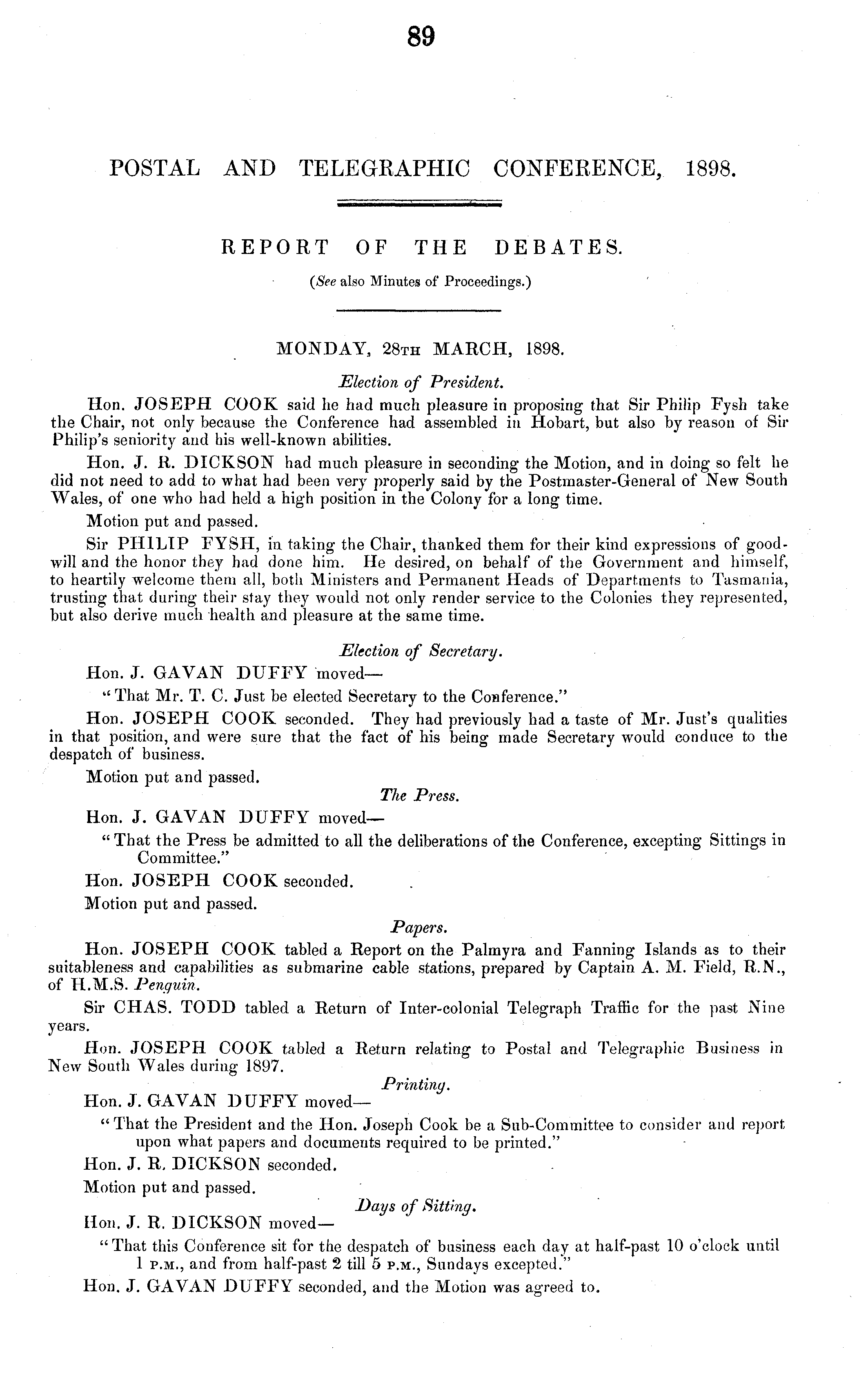 MONDAY, 28th MARCH, 1898. Election of President. Hon. JOSEPH COOK said he had much pleasure in proposing that Sir Philip Fysh take the Chair, not only because the Conference had assembled in Hobart, but also by reason of Sir Philip's seniority and his well-known abilities. Hon. J. R. DICKSON had much pleasure in seconding the Motion, and in doing so felt he did not need to add to what had been very properly said by the Postmaster-General of New South Wales, of one who had held a high position in the Colony for a long time. Motion put and passed. Sir PHILIP FYSH, in taking the Chair, thanked them for their kind expressions of goodwill and the honor they had done him. He desired, on behalf of the Government and himself, to heartily welcome them all, both Ministers and Permanent Heads of Departments to Tasmania, trusting that during their stay they would not only render service to the Colonies they represented, but also derive much health and pleasure at the same time. Election of Secretary. Hon. J. GAVAN DUFFY moved— " That Mr. T. C. Just be elected Secretary to the Conference." Hon. JOSEPH COOK seconded. They had previously had a taste of Mr. Just's qualities in that position, and were sure that the fact of his being made Secretary would conduce to the despatch of business. Motion put and passed. The Press. Hon. J. GAVAN DUFFY moved— "That the Press be admitted to all the deliberations of the Conference, excepting Sittings in Committee." Hon. JOSEPH COOK seconded. Motion put and passed. Papers. Hon. JOSEPH COOK tabled a Report on the Palmyra and Fanning Islands as to their suitableness and capabilities as submarine cable stations, prepared by Captain A. M. Field, R.N., of H.M.S. Penguin. Sir CHAS. TODD tabled a Return of Inter-colonial Telegraph Traffic for the past Nine years. Hon. JOSEPH COOK tabled a Return relating to Postal and Telegraphic Business in New South Wales during 1897. Printing. Hon. J. GAVAN DUFFY moved— " That the President and the Hon. Joseph Cook be a Sub-Committee to consider and report upon what papers and documents required to be printed." Hon. J. R. DICKSON seconded. Motion put and passed. Hays of Sitting. Hon. J. R. DICKSON moved— " That this Conference sit for the despatch of business each day at half-past 10 o'clock until 1 p.m., and from half-past 2 till 5 p.m., Sundays excepted." Hon. J. GAVAN DUFFY seconded, and the Motion was agreed to.