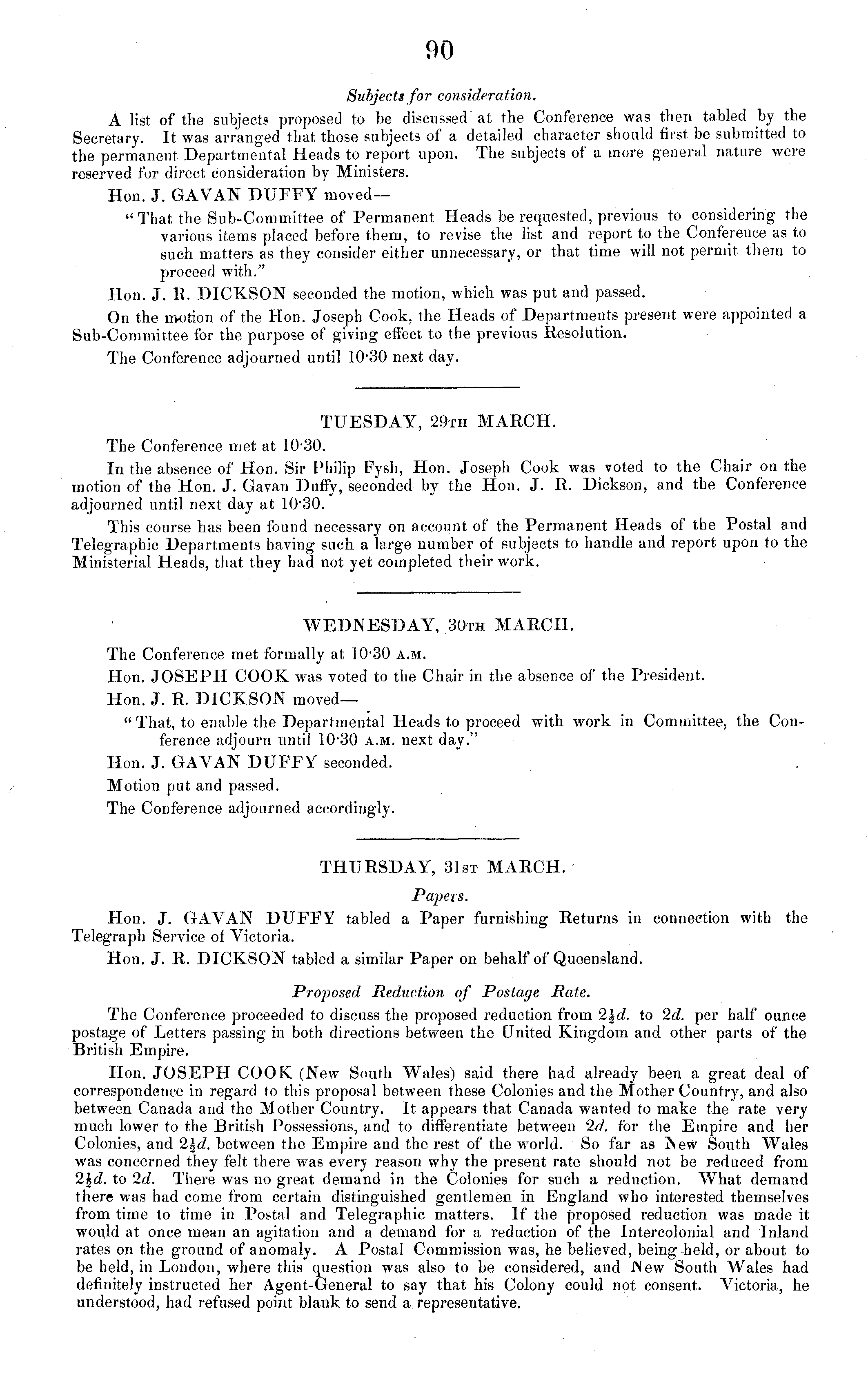 TUESDAY, 29th MARCH. The Conference met at 10*30. In the absence of Hon. Sir Philip Fysh, Hon. Joseph Cook was voted to the Chair on the motion of the Hon. J. Gavan Duffy, seconded by the Hon. J. R. Dickson, and the Conference adjourned until next day at 10*30. This course has been found necessary on account of the Permanent Heads of the Postal and Telegraphic Departments having such a large number of subjects to handle and report upon to the Ministerial Heads, that they had not yet completed their work.