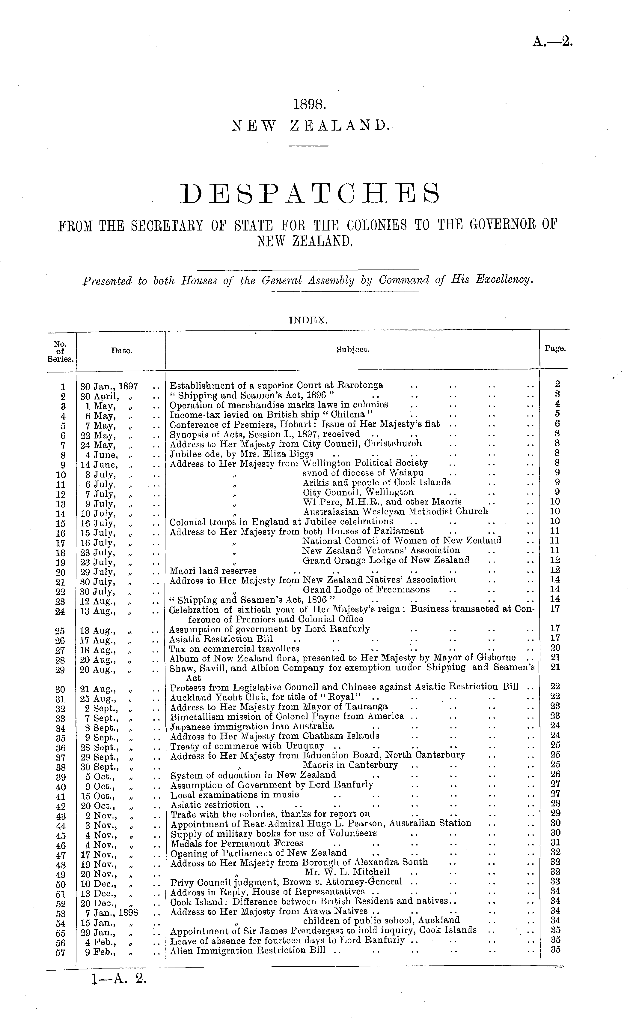 No. of Series. Date. Subject. Page. 1 2 3 4 5 6 7 8 9 10 11 12 13 14 15 16 17 Iβ 19 20 21 22 23 24 30 Jan., 1897 30 April, „ 1 May, „ 6 May, „ 7 May, 22 May, „ 24 May, „ 4 June, 14 June, „ 3 July, „ 6 July, „ 7 July, „ 9 July, „ 10 July, „ 16 July, „ 15 July, „ 16 July, „ 23 July, „ 23 July, „ 29 July, „ 30 July, „ 30 July, „ 12 Aug., „ 13 Aug., „ Establishment of a superior Court at Rarotonga " Shipping and Seamen's Act, 1896 " Operation of merchandise marks laws in colonies Income-tax levied on British ship " Chilena " Conference of Premiers, Hobart: Issue of Her Majesty's fiat Synopsis of Acts, Session I., 1897, received .. Address to Her Majesty from City Council, Christchurch Jubilee ode, by Mrs. Eliza Biggs Address to Her Majesty from Wellington Political Society „ synod of diocese of Waiapu „ Arikis and people of Cook Islands „ City Council, Wellington Wi Pere, M.H.R., and other Maoris „ Australasian Wesleyan Methodist Church Colonial troops in England at Jubilee celebrations Address to Her Majesty from both Houses of Parliament National Council of Women of New Zealand „ New Zealand Veterans' Association Grand Orange Lodge of New Zealand Maori land reserves Address to Her Majesty from New Zealand Natives' Association „ Grand Lodge of Freemasons " Shipping and Seamen's Act, 1896 " Celebration of sixtieth year of Her Majesty's reign : Business transacted at Conference of Premiers and Colonial Office Assumption of government by Lord Ranfurly Asiatic Restriction Bill Tax on commercial travellers Album of New Zealand flora, presented to Her Majesty by Mayor of Gisborne .. Shaw, Savill, and Albion Company for exemption under Shipping and Seamen's Aot Protests from Legislative Council and Chinese against Asiatic Restriction Bill .. Auckland Yacht Club, for title of " Royal" .. .. .. Address to Her Majesty from Mayor of Tauranga Bimetallism mission of Colonel Payne from America Japanese immigration into Australia Address to Her Majesty from Chatham Islands Treaty of commerce with Uruquay Address to Her Majesty from Education Board, North Canterbury Maoris in Canterbury System of education in New Zealand Assumption of Government by Lord Ranfurly Local examinations in music Asiatic restriction Trade with the colonies, thanks for report on Appointment of Rear-Admiral Hugo L. Pearson, Australian Station Supply of military books for use of Volunteers Medals for Permanent Forces Opening of Parliament of New Zealand Address to Her Majesty from Borough of Alexandra South Mr. W. L. Mitchell Privy Council judgment, Brown i>. Attorney-General Address in Reply, House of Representatives Cook Island: Difference between British Resident and natives.. Address to Her Majesty from Arawa Natives children of public school, Auckland Appointment of Sir James Prendergast to hold inquiry, Cook Islands .. Leave of absence for fourteen days to Lord Ranfurly Alien Immigration Restriction Bill 2 3 4 5 6 8 8 8 8 9 9 9 10 10 10 ii ii ii 12 12 14 14 14 17 25 26 27 28 29 13 Aug., „ 17 Aug., „ 18 Aug., „ 20 Aug., „ 20 Aug., „ 17 17 20 21 21 30 31 32 33 34 35 36 37 38 39 40 41 42 43 44 45 46 47 48 49 50 51 52 53 54 55 56 57 21 Aug., „ 25 Aug., , 2 Sept., v 7 Sept., , 8 Sept., „ 9 Sept., „ 28 Sept., „ 29 Sept., „ 30 Sept., „ 5 Oct., , 9 Oct., „ 15 Oct., „ 20 Oct., „ 2 Nov., „ 3 Nov., „ 4 Nov., 4 Nov., 17 Nov., „ 19 Nov., „ 20 Nov., „ 10 Dec, „ 13 Dec, „ 20 Dec, „ 7 Jan., 1898 15 Jan., „ 29 Jan., 4 Feb., „ 9 Feb., „ 22 22 23 23 24 24 25 25 25 26 27 27 28 29 30 30 81 32 32 32 33 34 34 34 34 35 35 35