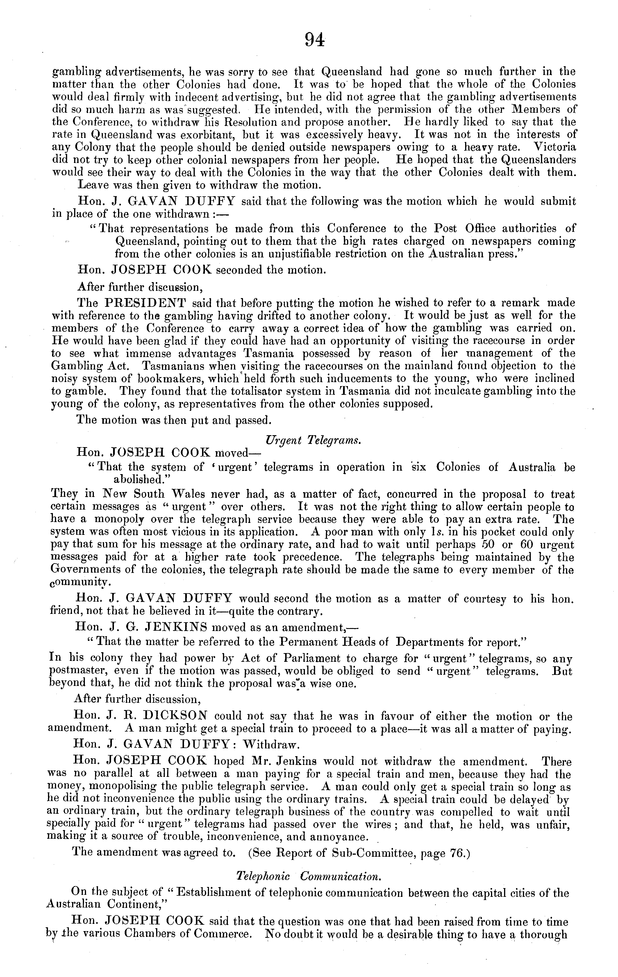 gambling advertisements, he was sorry to see that Queensland had gone so much further in the matter than the other Colonies had done. It was to be hoped that the whole of the Colonies would deal firmly with indecent advertising, but, he did not agree that the gambling advertisements did so much harm as was suggested. He intended, with the permission of the other Members of the Conference, to withdraw his Resolution and propose another. He hardly liked to say that the rate in Queensland was exorbitant, but it was excessively heavy. It was not in the interests of any Colony that the people should be denied outside newspapers owing to a heavy rate. Victoria did not try to keep other colonial newspapers from her people. He hoped that the Queenslanders would see their way to deal with the Colonies in the way that the other Colonies dealt with them. Leave was then given to withdraw the motion. Hon. J. GAVAN DUFFY said that the following was the motion which he would submit in place of the one withdrawn :— " That representations be made from this Conference to the Post Office authorities of Queensland, pointing out to them that the high rates charged on newspapers coming from the other colonies is an unjustifiable restriction on the Australian press." Hon. JOSEPH COOK seconded the motion. After further discussion, The PRESIDENT said that before putting the motion he wished to refer to a remark made with reference to the gambling having drifted to another colony. It would be just as well for the members of the Conference to carry away a correct idea of how the gambling was carried on. He would have been glad if they could have had an opportunity of visiting the racecourse in order to see what immense advantages Tasmania possessed by reason of her management of the Gambling Act. Tasmanians when visiting the racecourses on the mainland found objection to the noisy system of bookmakers, which held forth such inducements to the young, who were inclined to gamble. They found that the totalisator system in Tasmania did not inculcate gambling into the young of the colony, as representatives from the other colonies supposed. The motion was then put and passed. Urgent Telegrams. Hon. JOSEPH COOK moved— "That the system of 'urgent' telegrams in operation in six Colonies of Australia be abolished." They in New South Wales never had, as a matter of fact, concurred in the proposal to treat certain messages as " urgent" over others. It was not the right thing to allow certain people to have a monopoly over the telegraph service because they were able to pay an extra rate. The system was often most vicious in its application. A poor man with only Is. in his pocket could only pay that sum for his message at the ordinary rate, and had to wait until perhaps 50 or 60 urgent messages paid for at a higher rate took precedence. The telegraphs being maintained by the Governments of the colonies, the telegraph rate should be made the same to every member of the community. Hon. J. GAVAN DUFFY would second the motion as a matter of courtesy to his hon. friend, not that he believed in it—quite the contrary. Hon. J. G. JENKINS moved as an amendment, — " That the matter be referred to the Permanent Heads of Departments for report." In his colony they had power by Act of Parliament to charge for " urgent" telegrams, so any postmaster, even if the motion was passed, would be obliged to send "urgent" telegrams. But beyond that, he did not think the proposal was"a wise one. After further discussion, Hon. J. R. DICKSON could not say that he was in favour of either the motion or the amendment. A man might get a special train to proceed to a place—it was all a matter of paying. Hon. J. GAVAN DUFFY: Withdraw. Hon. JOSEPH COOK hoped Mr. Jenkins would not withdraw the amendment. There was no parallel at all between a man paying for a special train and men, because they had the money, monopolising the public telegraph service. A man could only get a special train so long as he did not inconvenience the public using the ordinary trains. A special train could be delayed by an ordinary train, but the ordinary telegraph business of the country.was compelled to wait until specially paid for " urgent" telegrams had passed over the wires; and that, he held, was unfair, making it a source of trouble, inconvenience, and annoyance. The amendment was agreed to. (See Report of Sub-Committee, page 76.) Telephonic Communication. On the subject of "Establishment of telephonic communication between the capital cities of the Australian Continent," Hon. JOSEPH COOK said that the question was one that had been raised from time to time by ihe various Chambers of Commerce. No doubt it would be a desirable thing to have a thorough