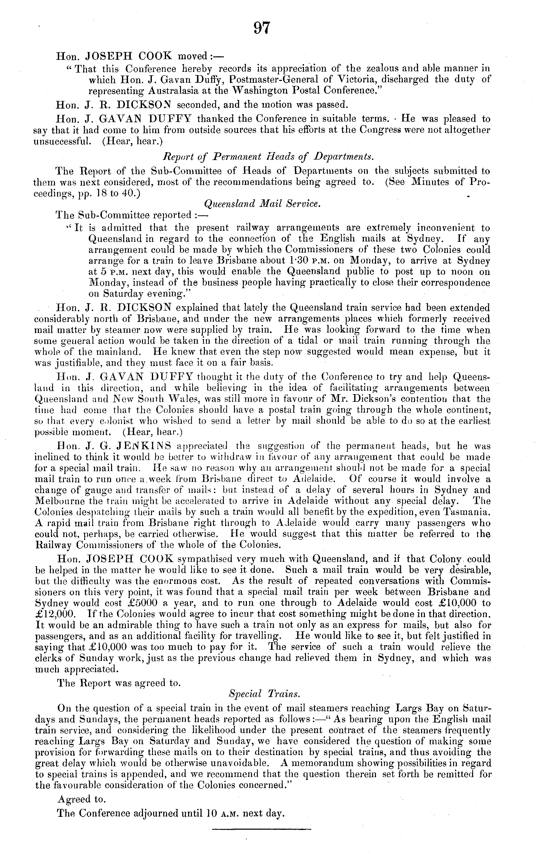 Hon. JOSEPH COOK moved:— " That this Conference hereby records its appreciation of the zealous and able manner in which Hon. J. Gavan Duffy, Postmaster-General of Victoria, discharged ihe duty of representing Australasia at the Washington Postal Conference." Hon. J. R. DICKSON seconded, and the motion was passed. Hon. J. GAVAN DUFFY thanked the Conference in suitable terms. • He was pleased to say that it had come to him from outside sources that his efforts at the Congress were not altogether unsuccessful. (Hear, hear.) Report of Permanent Heads of Departments. The Report of the Sub-Committee of Heads of Departments on the subjects submitted to them was next considered, most of the recommendations being agreed to. (See Minutes of Proceedings, pp. 18 to 40.) Queensland Mail Service. The Sub-Committee reported : — " It is admitted that the present railway arrangements are extremely inconvenient to Queensland in regard to the connection of the English mails at Sydney. If any arrangement could be made by which the Commissioners of these two Colonies could arrange for a train to leave Brisbane about I*3o p.m. on Monday, to arrive at Sydney at 5 p.m. next day, this would enable the Queensland public to post up to noon on Monday, instead of the business people having practically to close their correspondence on Saturday evening." Hon. J. R. DICKSON explained that lately the Queensland train service had been extended considerably north of Brisbane, and under the new arrangements places which formerly received mail matter by steamer now were supplied by train. He was looking forward to the time when some general action would be taken in the direction of a tidal or mail train running through the whole of the mainland. He knew that even the step now suggested would mean expense, but it was justifiable, and they must face it on a fair basis. Hon. J. GAVAN DUFFY thought it the duty of the Conference to try and help Queensland in this direction, and while believing in the idea of facilitating arrangements between Queensland and New South Wales, was still more in favour of Mr. Dickson's contention that the time had come that the Colonies should have a postal train going through the whole continent, so that every colonist who wished to send a letter by mail should be able to do so at the earliest possible moment. (Hear, hear.) Hon. J. G. JENKINS appreciated the suggestion of the permanent heads, but he was inclined to think it would be better to withdraw in favour of any arrangement that could be made for a special mail train. He saw no reason why an arrangement should not be made for a special mail train to run once a.week from Brisbane direct to Adelaide. Of course it would involve a change of gauge and transfer of mails: but instead of a delay of several hours in Sydney and Melbourne the train might be accelerated to arrive in Adelaide without any special delay. The Colonies despatching their mails by such a train would all benefit by the expedition, even Tasmania. A rapid mail train from Brisbane right through to Adelaide would carry many passengers who could not, perhaps, be carried otherwise. He would suggest that this matter be referred to the Railway Commissioners of the whole of the Colonies. Hon. JOSEPH COOK sympathised very much with Queensland, and if that Colony could be helped in the matter he would like to see it done. Such a mail train would be very desirable, but the difficulty was the enormous cost. As the result of repeated conversations with Commissioners on this very point, it was found that a special mail train per week between Brisbane and Sydney would cost £5000 a year, and to run one through to Adelaide would cost £10,000 to £12,000. If the Colonies would agree to incur that cost something might be done in that direction. It would be an admirable thing to have such a train not only as an express for mails, but also for passengers, and as an additional facility for travelling. He would like to see it, but felt justified in saying that £10,000 was too much to pay for it. The service of such a train would relieve the clerks of Sunday work, just as the previous change had relieved them in Sydney, and which was much appreciated. The Report was agreed to. Special Trains. On the question of a special train in the event of mail steamers reaching Largs Bay on Saturdays and Sundays, the permanent heads reported as follows:—"As bearing upon the English mail train service, and considering the likelihood under the present contract of the steamers frequently reaching Largs Bay on Saturday and Sunday, we have considered the question of making some provision for forwarding these mails on to their destination by special trains, and thus avoiding the great delay which would be otherwise unavoidable. A memorandum showing possibilities in regard to special trains is appended, and we recommend that the question therein set forth be remitted for the favourable consideration of the Colonies concerned." Agreed to. The Conference adjourned until 10 a.m. next day.