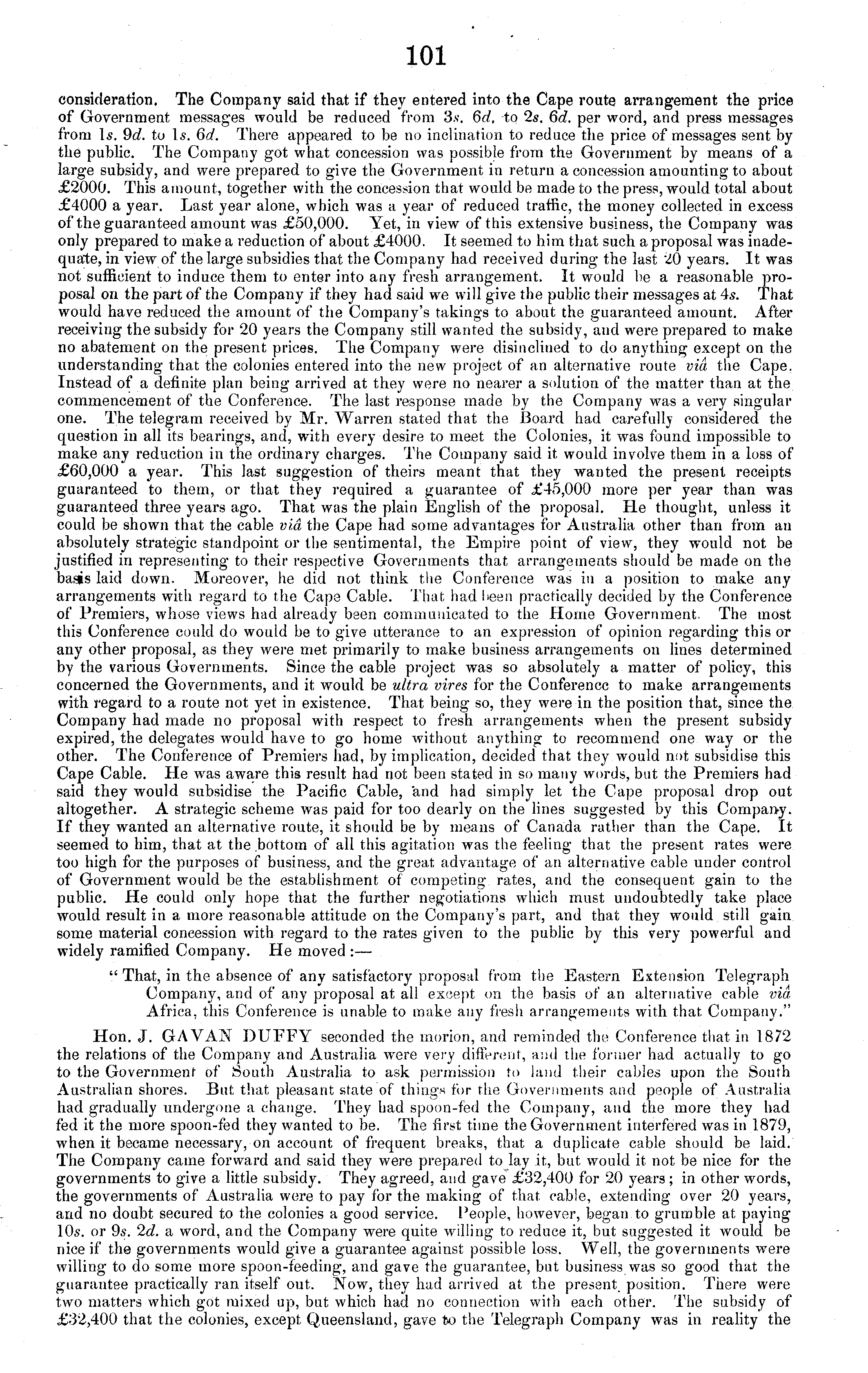 consideration. The Company said that if they entered into the Cape route arrangement the price of Government messages would be reduced from 3s. 6c?, to 2s. 6d. per word, and press messages from Is. 9c?. to Is. 6d. There appeared to be no inclination to reduce the price of messages sent by the public. The Company got what concession was possible from the Government by means of a large subsidy, and were prepared to give the Government in return a concession amounting to about £2000. This amount, together with the concession that would be made to the press, would total about £4000 a year. Last year alone, which was a year of reduced traffic, the money collected in excess of the guaranteed amount was £50,000. Yet, in view of this extensive business, the Company was only prepared to make a reduction of about £4000. It seemed to him that such a proposal was inadequate, in view of the large subsidies that the Company had received during the last 20 years. It was not sufficient to induce them to enter into any fresh arrangement. It would be a reasonable proposal on the part of the Company if they had said we will give the public their messages at 4s. That would have reduced the amount of the Company's takings to about the guaranteed amount. After receiving the subsidy for 20 years the Company still wanted the subsidy, and were prepared to make no abatement on the present prices. The Company were disinclined to do anything except on the understanding that the colonies entered into the new project of an alternative route via the Cape. Instead of a definite plan being arrived at they were no nearer a solution of the matter than at the commencement of the Conference. The last response made by the Company was a very singular one. The telegram received by Mr. Warren stated that the Board had carefully considered the question in all its bearings, and, with every desire to meet the Colonies, it was found impossible to make any reduction in the ordinary charges. The Company said it would involve them in a loss of £60,000 a year. This last suggestion of theirs meant that they wanted the present receipts guaranteed to them, or that they required a guarantee of £45,000 more per year than was guaranteed three years ago. That was the plain English of the proposal, tie thought, unless it could be shown that the cable via the Cape had some advantages for Australia other than from an absolutely strategic standpoint or the sentimental, the Empire point of view, they would not be justified in representing to their respective Governments that arrangements should be made on the basis laid down. Moreover, he did not think the Conference was in a position to make any arrangements with regard to the Cape Cable. That, had been practically decided by the Conference of Premiers, whose views had already been communicated to the Home Government. The most this Conference could do would be to give utterance to an expression of opinion regarding this or any other proposal, as they were met primarily to make business arrangements on lines determined by the various Governments. Since the cable project was so absolutely a matter of policy, this concerned the Governments, and it would be ultra vires for the Conference to make arrangements with regard to a route not yet in existence. That being so, they were in the position that, since the Company had made no proposal with respect to fresh arrangements when the present subsidy expired, the delegates would have to go home without anything to recommend one way or the other. The Conference of Premiers had, by implication, decided that they would not subsidise this Cape Cable. He was aware this result had not been stated in so many words, but the Premiers had said they would subsidise the Pacific Cable, and had simply let the Cape proposal drop out altogether. A strategic scheme was paid for too dearly on the lines suggested by this Company. If they wanted an alternative route, it should be by means of Canada rather than the Cape. It seemed to him, that at the bottom of all this agitation was the feeling that the present rates were too high for the purposes of business, and the great, advantage of an alternative cable under control of Government would be the establishment of competing rates, and the consequent gain to the public. He could only hope that the further negotiations which must undoubtedly take place would result in a more reasonable attitude on the Company's part, and that they would still gain some material concession with regard to the rates given to the public by this very powerful and widely ramified Company. Fie moved : — " That, in the absence of any satisfactory proposal from the Eastern Extension Telegraph Company, and of any proposal at all except on the basis of an alternative cable via Africa, this Conference is unable to make any fresh arrangements with that, Company." Hon. J. GAVAN DUFFY seconded the morion, and reminded the Conference that in 1872 the relations of the Company and Australia were very different, and the former had actually to go to the Government of South Australia to ask permission to land their cables upon the South Australian shores. But that pleasant state of things for the Governments and people of Australia had gradually undergone a change. They had spoon-fed the Company, and the more they had fed it the more spoon-fed they wanted to be. The first time the Government interfered was in 1879, when it became necessary, on account of frequent breaks, that a duplicate cable should be laid. The Company came forward and said they were prepared to lay it, but would it not be nice for the governments to give a little subsidy. They agreed, and gave £32,400 for 20 years ; in other words, the governments of Australia were to pay for the making of that cable, extending over 20 years, and no doubt secured to the colonies a good service. People, however, began to grumble at paying 10s. or 9s. 2c?. a word, and the Company were quite willing to re