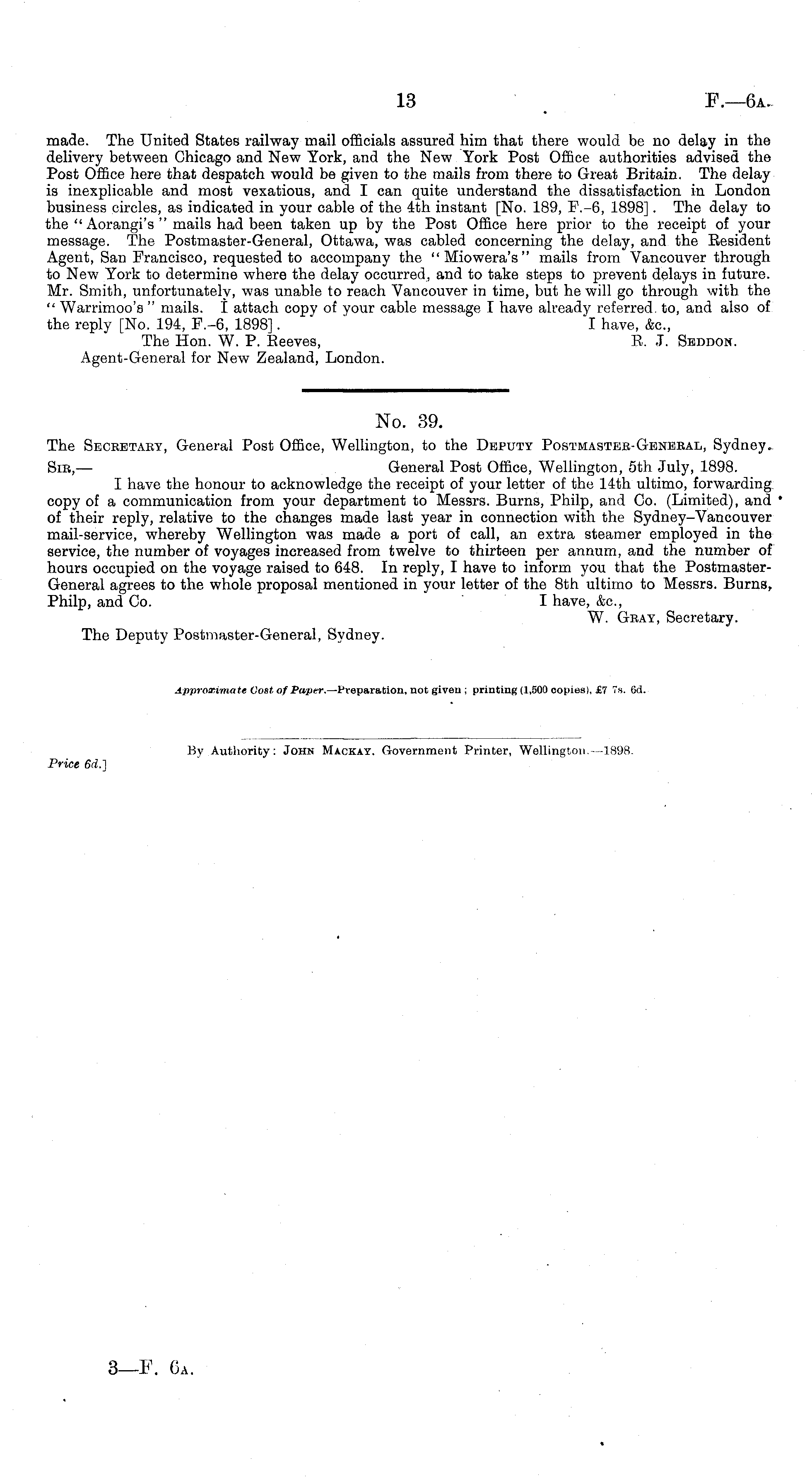 made. The United States railway mail officials assured him that there would be no delay in the delivery between Chicago and New York, and the New York Post Office authorities advised the Post Office here that despatch would be given to the mails from there to Great Britain. The delay is inexplicable and most vexatious, and I can quite understand the dissatisfaction in London business circles, as indicated in your cable of the 4th instant [No. 189, F.-6, 1898]. The delay to the " Aorangi's " mails had been taken up by the Post Office here prior to the receipt of your message. The Postmaster-General, Ottawa, was cabled concerning the delay, and the Resident Agent, San Francisco, requested to accompany the " Miowera's " mails from Vancouver through to New York to determine where the delay occurred, and to take steps to prevent delays in future. Mr. Smith, unfortunately, was unable to reach Vancouver in time, but he will go through with the " Warrimoo's " mails. I attach copy of your cable message I have already referred, to, and also of the reply [No. 194, F.-6, 1898]. I have, &c, The Hon. W. P. Reeves, R. J. Seddon. Agent-General for New Zealand, London.