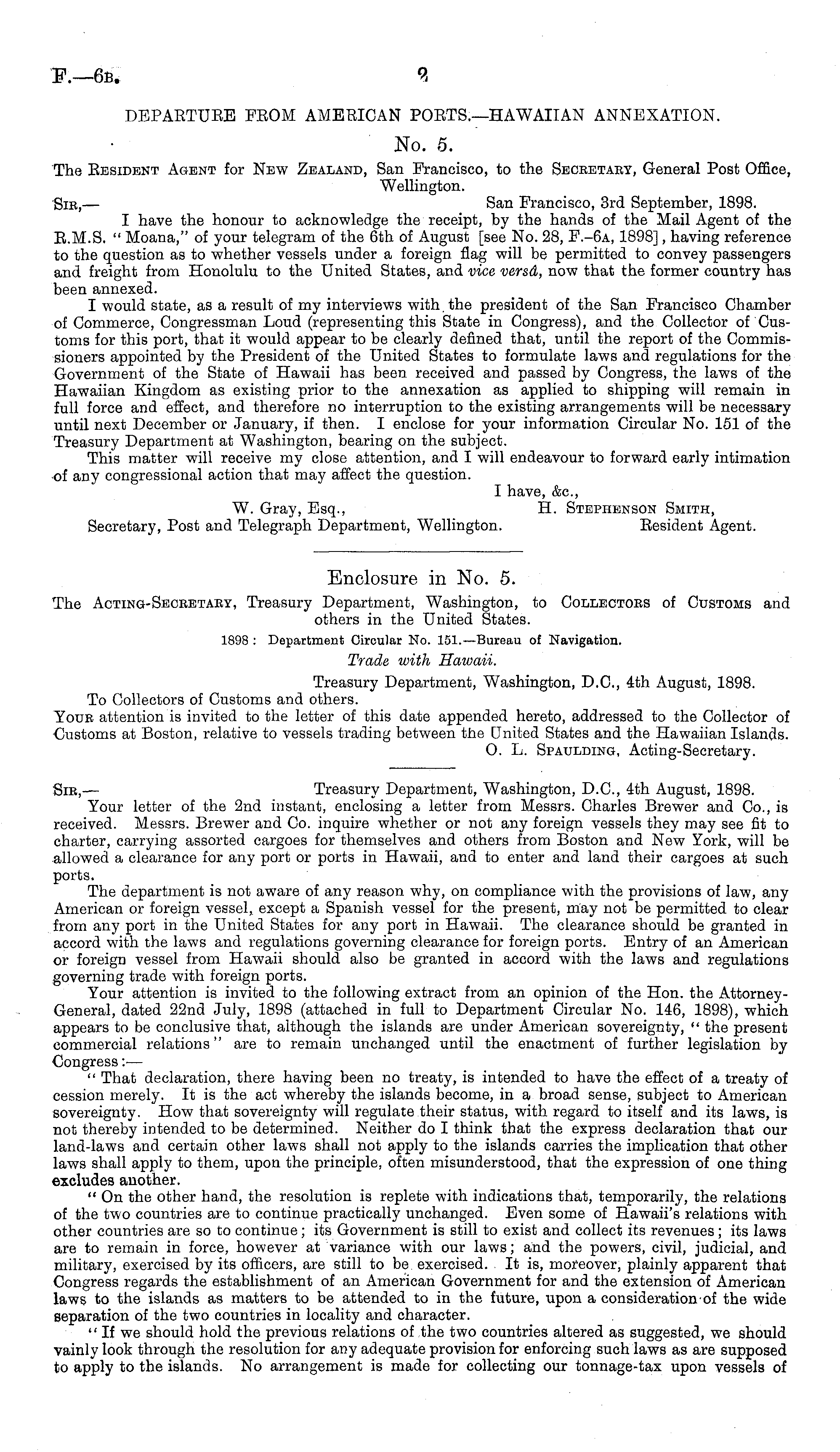 DEPARTURE FROM AMERICAN PORTS.—HAWAIIAN ANNEXATION. No. 5. The Resident Agent for New Zealand, San Francisco, to the Seceetaey, General Post Office, Wellington. Sib, — San Francisco, 3rd September, 1898. I have the honour to acknowledge the receipt, by the hands of the Mail Agent of the R.M.S. " Moana," of your telegram of the 6th of August [see No. 28, F.-6a, 1898], having reference to the question as to whether vessels under a foreign flag will be permitted to convey passengers and freight from Honolulu to the United States, and vice versd, now that the former country has been annexed. I would state, as a result of my interviews with the president of the San Francisco Chamber of Commerce, Congressman Loud (representing this State in Congress), and the Collector of Customs for this port, that it would appear to be clearly defined that, until the report of the Commissioners appointed by the President of the United States to formulate laws and regulations for the Government of the State of Hawaii has been received and passed by Congress, the laws of the Hawaiian Kingdom as existing prior to the annexation as applied to shipping will remain in full force and effect, and therefore no interruption to the existing arrangements will be necessary until next December or January, if then. I enclose for your information Circular No. 151 of the Treasury Department at Washington, bearing on the subject. This matter will receive my close attention, and I will endeavour to forward early intimation •of any congressional action that may affect the question. I have, &c, W. Gray, Esq., H. Stephenson Smith, Secretary, Post and Telegraph Department, Wellington. Resident Agent.