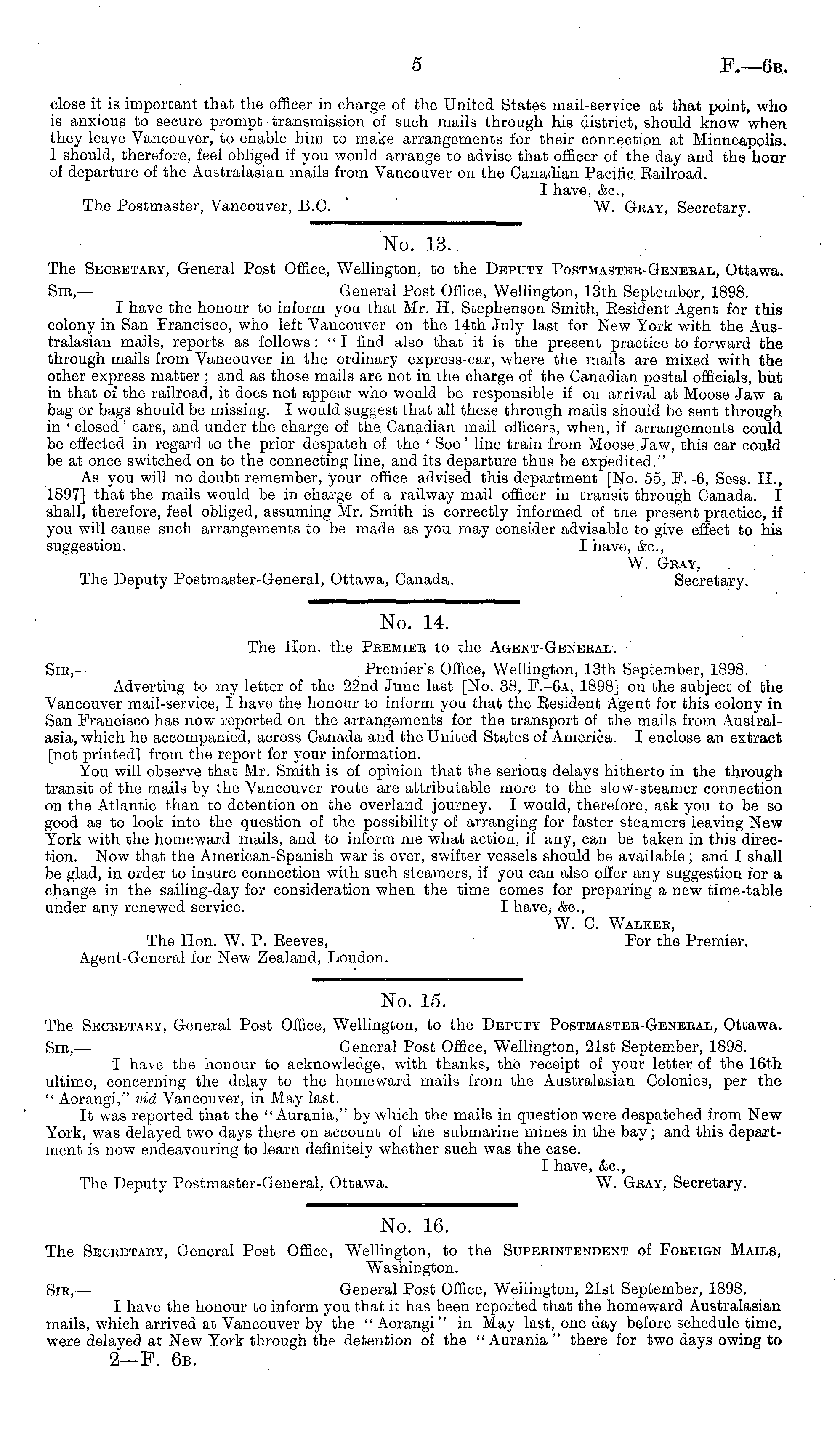 No. 13. The Seceetary, General Post Office, Wellington, to the Deputy Postmaster-General, Ottawa. Sir,— General Post Office, Wellington, 13th September, 1898. I have the honour to inform you that Mr. H. Stephenson Smith, Eesident Agent for this colony in San Francisco, who left Vancouver on the 14th July last for New York with the Australasian mails, reports as follows: "I find also that it is the present practice to forward the through mails from Vancouver in the ordinary express-car, where the mails are mixed with the other express matter ; and as those mails are not in the charge of the Canadian postal officials, but in that of the railroad, it does not appear who would be responsible if on arrival at Moose Jaw a bag or bags should be missing. I would suggest that all these through mails should be sent through in 'closed' cars, and under the charge of the, Canadian mail officers, when, if arrangements could be effected in regard to the prior despatch of the ' Soo' line train from Moose Jaw, this car could be at once switched on to the connecting line, and its departure thus be expedited." As you will no doubt remember, your office advised this department [No. 55, F.-6, Sess. 11., 1897] that the mails would be in charge of a railway mail officer in transit through Canada. I shall, therefore, feel obliged, assuming Mr. Smith is correctly informed of the present practice, if you will cause such arrangements to be made as you may consider advisable to give effect to his suggestion. I have, &c, W. Gray, The Deputy Postmaster-General, Ottawa, Canada. Secretary.