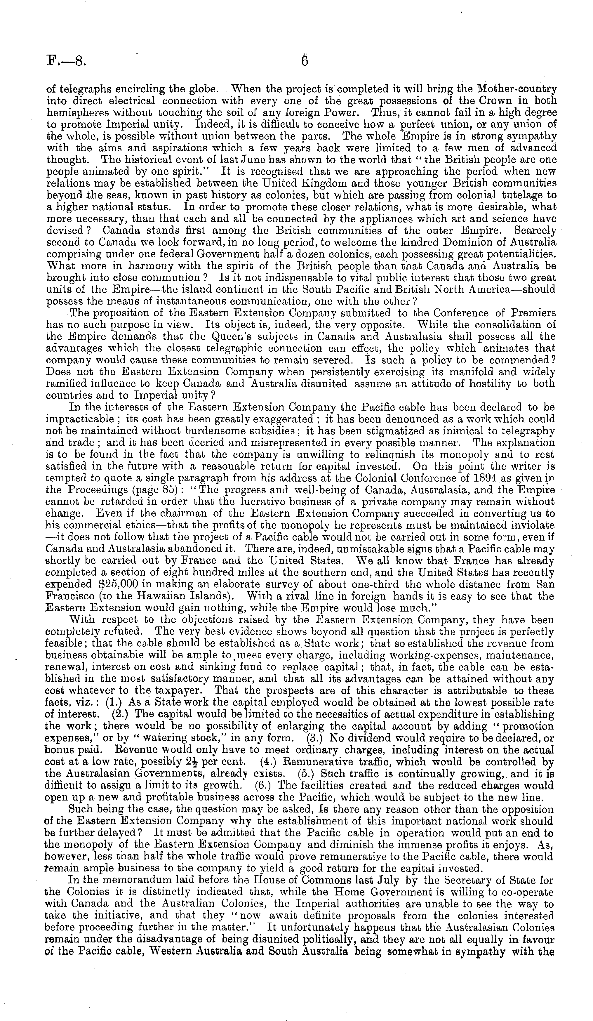 of telegraphs encircling the globe. When the project is completed it will bring the Mother-country into direct electrical connection with every one of the great possessions of the Crown in both hemispheres without touching the soil of any foreign Power. Thus, it cannot fail in a high degree to promote Imperial unity. Indeed, it is difficult to conceive how a perfect union, or any union of the whole, is possible without union between the parts. The whole Empire is in strong sympathy with the aims and aspirations which a few years back were limited to a few men of advanced thought. The historical event of last June has shown to the world that " the British people are one people animated by one spirit." It is recognised that we are approaching the period when new relations may be established between the United Kingdom and those younger British communities beyond the seas, known in past history as colonies, but which are passing from colonial tutelage to a higher national status. In order to promote these closer relations, what is more desirable, what more necessary, than that each and all be connected by the appliances which art and science have devised? Canada stands first among the British communities of the outer Empire. Scarcely second to Canada we look forward, in no long period, to welcome the kindred Dominion of Australia comprising under one federal Government half a dozen colonies, each possessing great potentialities. What more in harmony with the spirit of the British people than that Canada and Australia be brought into close communion ? Is it not indispensable to vital public interest that those two great units of the Empire—the island continent in the South Pacific and British North America—should possess the means of instantaneous communication, one with the other ? The proposition of the Eastern Extension Company submitted to the Conference of Premiers has no such purpose in view. Its object is, indeed, the very opposite. While the consolidation of the Empire demands that the Queen's subjects in Canada and Australasia shall possess all the advantages which the closest telegraphic connection can effect, the policy which animates that company would cause these communities to remain severed. Is such a policy to be commended ? Does not the Eastern Extension Company when persistently exercising its manifold and widely ramified influence to keep Canada and Australia disunited assume an attitude of hostility to both countries and to Imperial unity ? In the interests of the Eastern Extension Company the Pacific cable has been declared to be impracticable ; its cost has been greatly exaggerated ; it has been denounced as a work which could not be maintained without burdensome subsidies; it has been stigmatized as inimical to telegraphy and trade ; and it has been decried and misrepresented in every possible manner. The explanation is to be found in the fact that the company is unwilling to relinquish its monopoly and to rest satisfied in the future with a reasonable return for capital invested. On this point the writer is tempted to quote a single paragraph from his address at the Colonial Conference of 1894 as given in the Proceedings (page 85) : '' The progress and well-being of Canada, Australasia, and the Empire cannot be retarded in order that the lucrative business of a private company may remain without change. Even if the chairman of the Eastern Extension Company succeeded in converting us to his commercial ethics—that the profits of the monopoly he represents must be maintained inviolate —it does not follow that the project of a Pacific cable would not be carried out in some form, even if Canada and Australasia abandoned it. There are, indeed, unmistakable signs that a Pacific cable may shortly be carried out by France and the United States. We all know that France has already completed a section of eight hundred miles at the southern end, and the United States has recently expended $25,000 iv making an elaborate survey of about one-third the whole distance from San Francisco (to the Hawaiian Islands). With a rival line in foreign hands it is easy to see that the Eastern Extension would gain nothing, while the Empire would lose much." With respect to the objections raised by the Eastern Extension Company, they have been completely refuted. The very best evidence shows beyond all question.that the project is perfectly feasible; that the cable should be established as a State work; that so established the revenue from business obtainable will be ample every charge, including working-expenses, maintenance, renewal, interest on cost and sinking fund to replace capital; that, in fact, the cable can be established in the most satisfactory manner, and that all its advantages can be attained without any cost whatever to the taxpayer. That the prospects are of this character is attributable to these facts, viz.: (1.) As a State work the capital employed would be obtained at the lowest possible rate of interest. (2.) The capital would be limited to the necessities of actual expenditure in establishing the work; there would be no possibility of enlarging the capital account by adding "promotion expenses," or by " watering stock," in any form. (3.) No dividend would require to be declared, or bonus paid. Revenue would only have to meet ordinary charges, including interest on the actual cost at a low rate, possibly 2£ per cent. (4.) Remunerative traffic, which would be controlled by the Australasian Governments, already exists. (5.) Such traffic is continually growing,, and it is difficult to assign a limit to its growth. (6.) The facilities created and the reduced charges would open up a new and profitable business across the Pacific, which would be subject to the new line. Such being the case, the question may be asked, Is there any reason other than the opposition of the Eastern Extension Company why the establishment of this important national work should be further delayed 